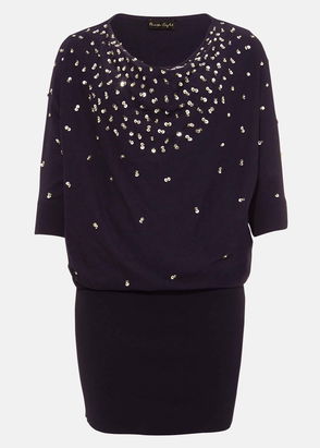Navy boucle dress in a mini silhouette with a statement lace collar, short sleeves and ornate button fastenings through the front.