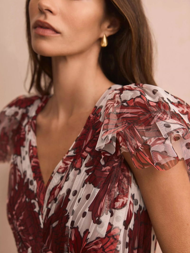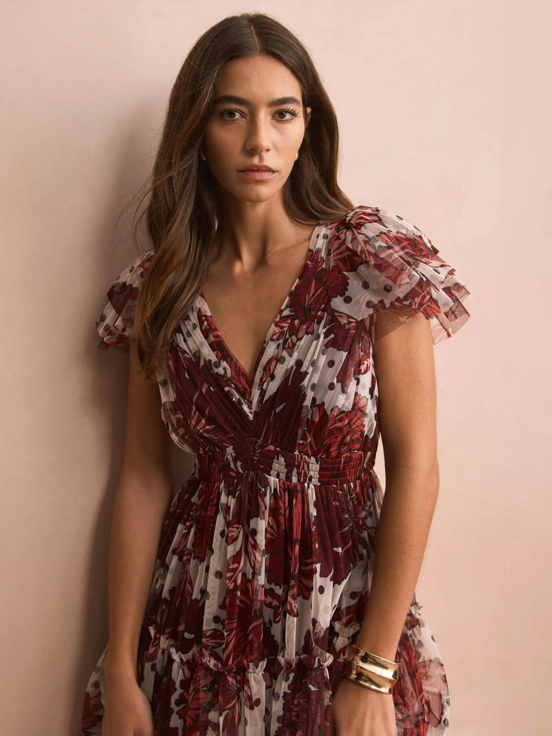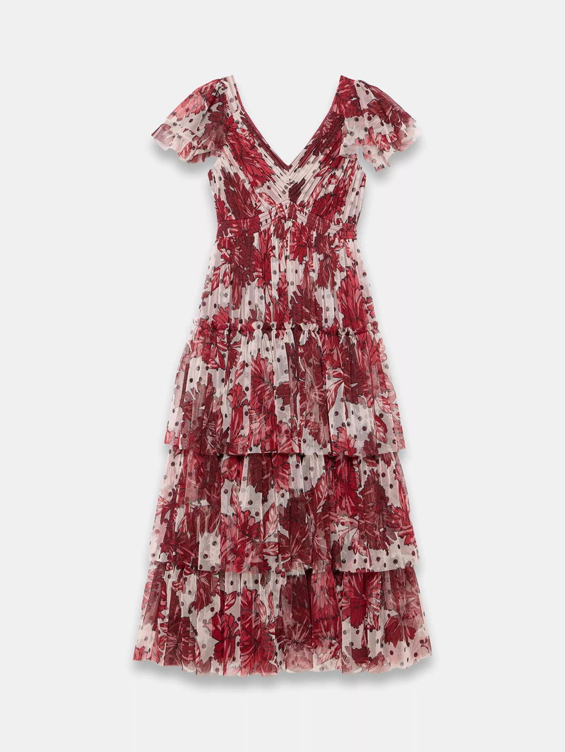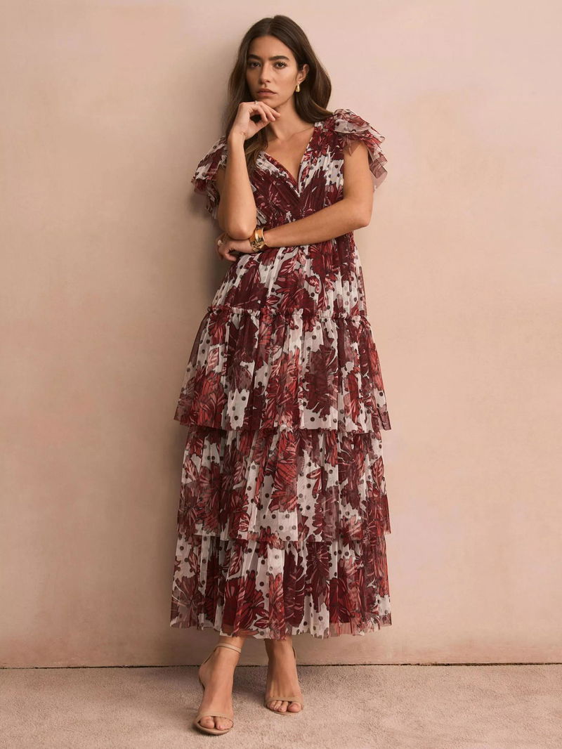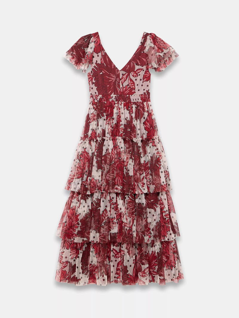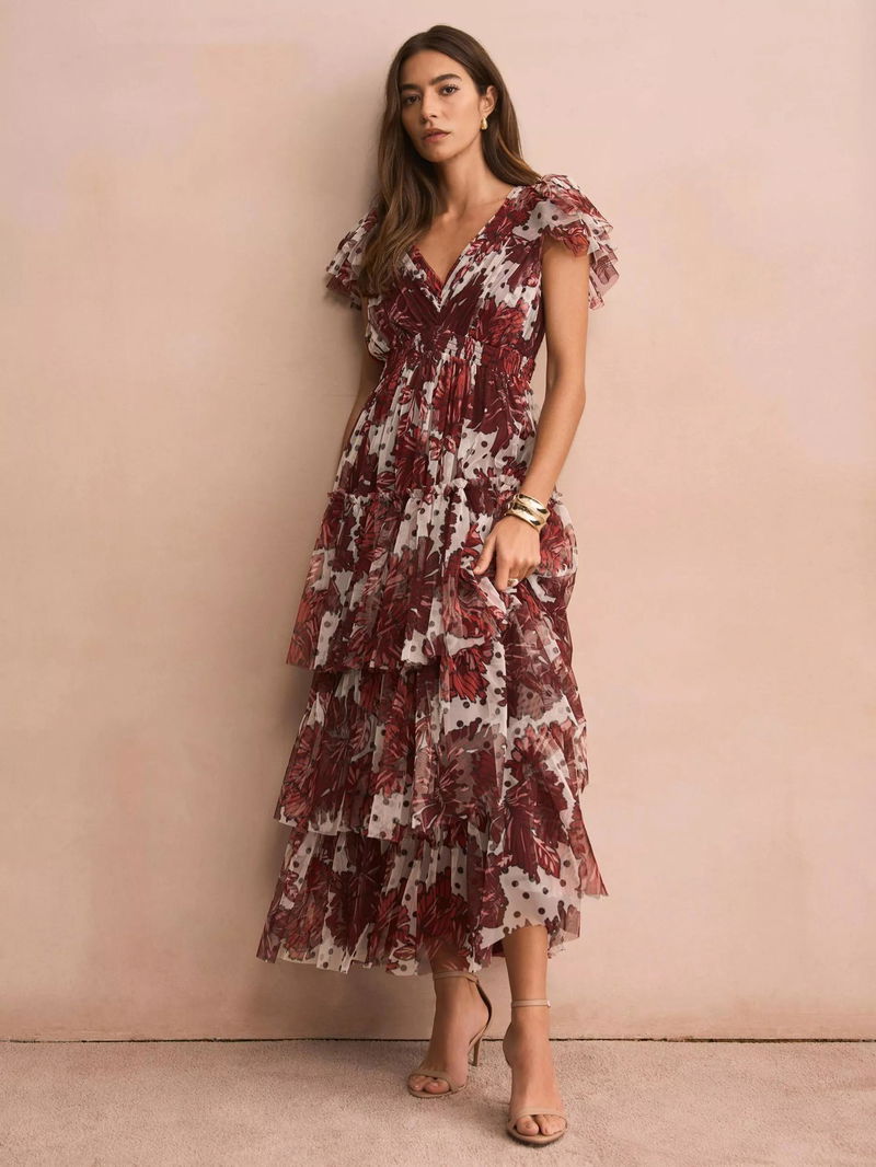 A floral print dress in a midi silhouette featuring a V-neckline, layered cap sleeves, cinched waistband, gathered detailing and tiered hemline.