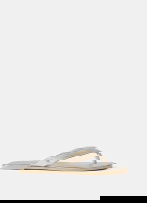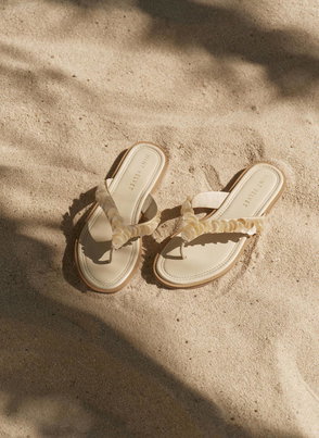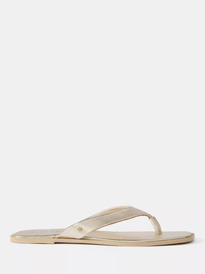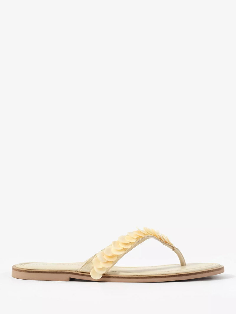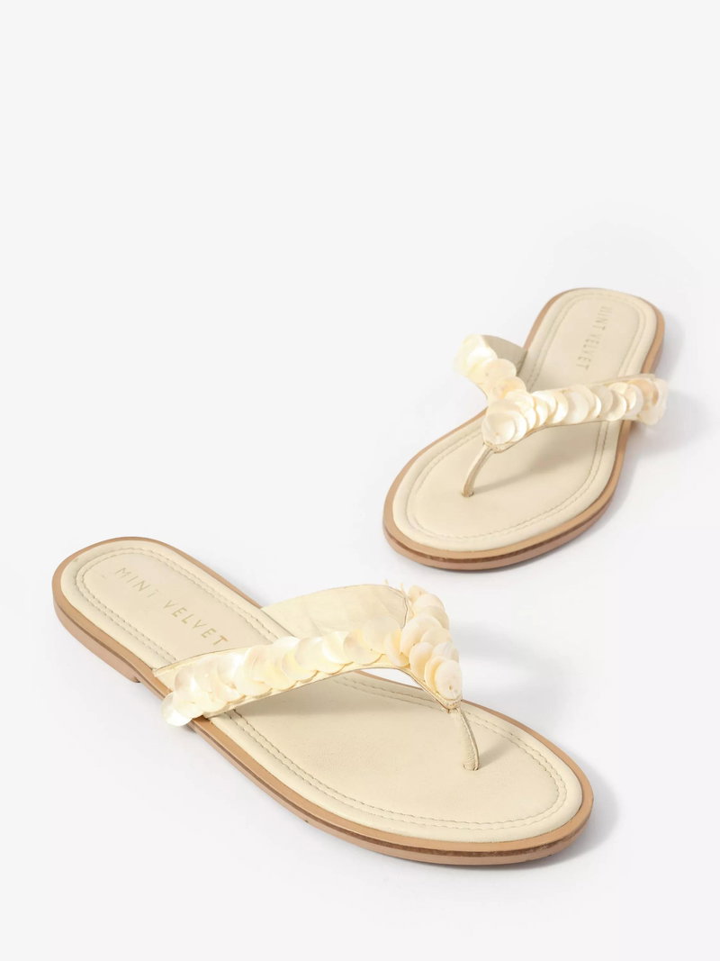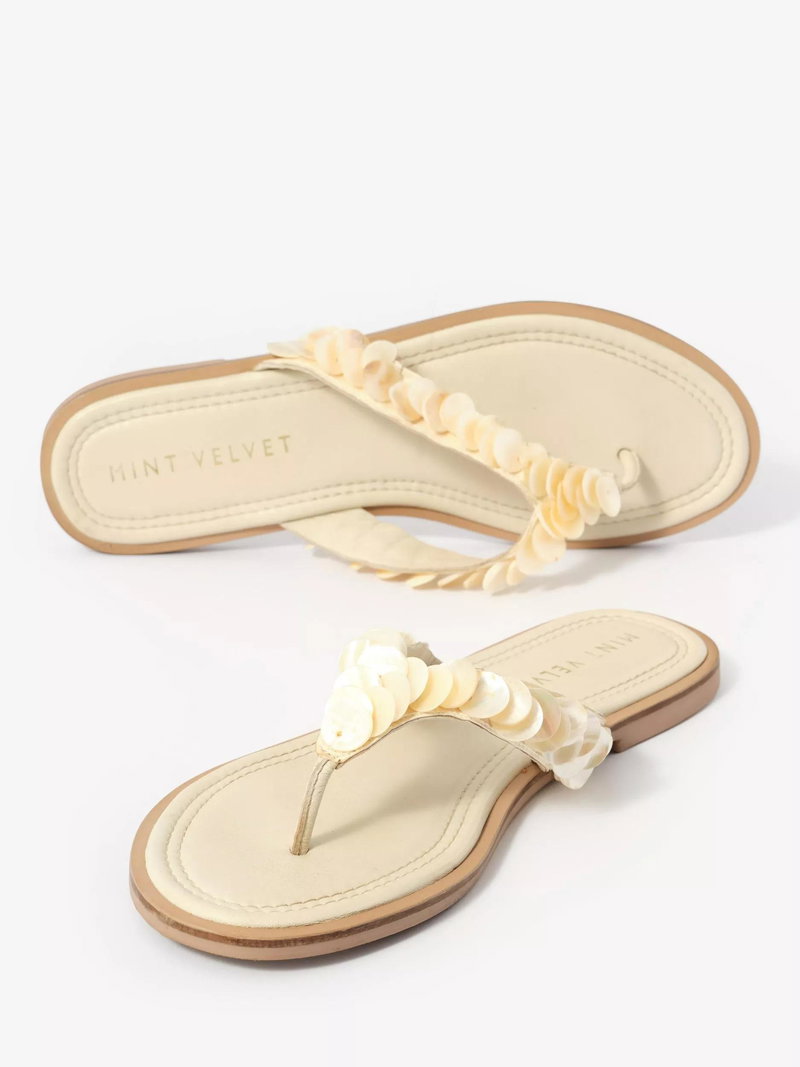 Cream flip flops from Mint Velvet featuring real hand-beaded pearl discs and a flat sole.
