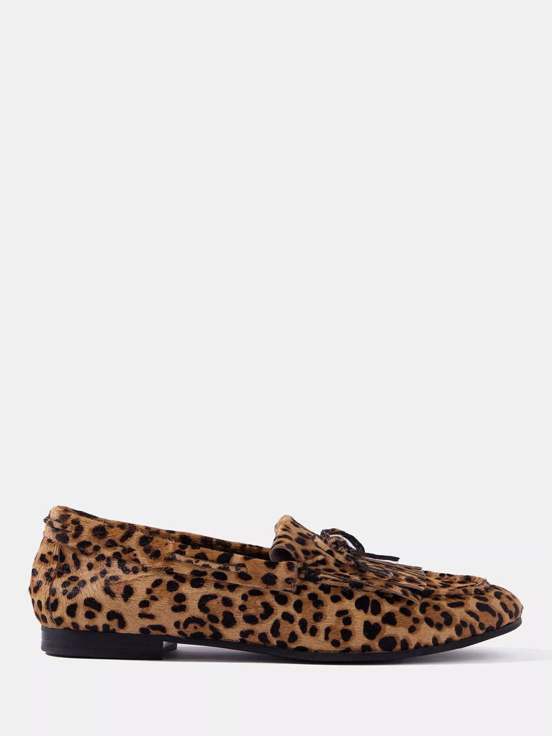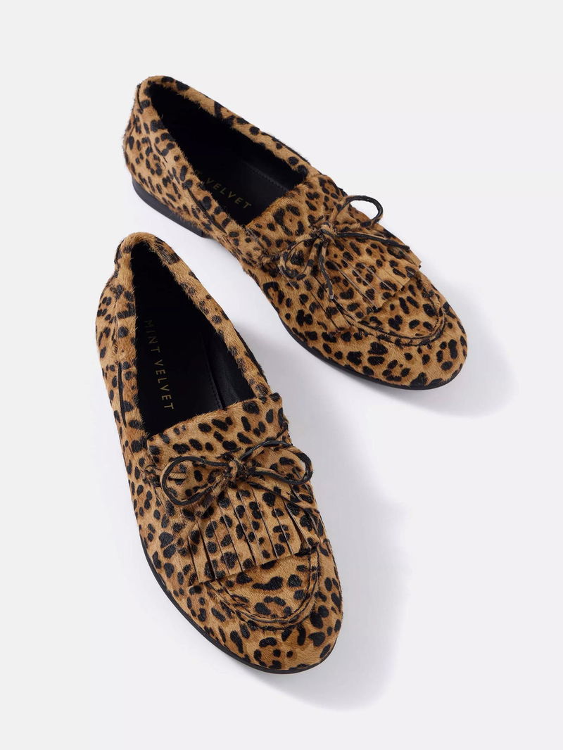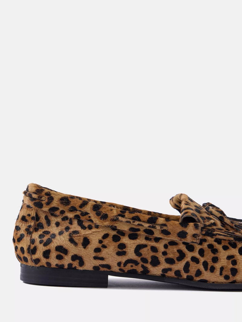 Leopard print loafers with a textured finish that deliver both in terms of comfort and modern style. The rounded toe is also adorned with fringing and a thin bow fastening that only add to the design's unique appeal.