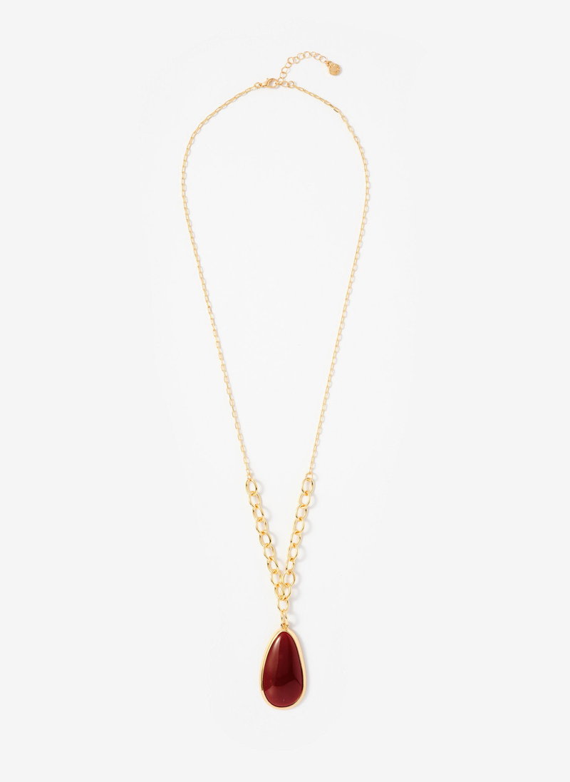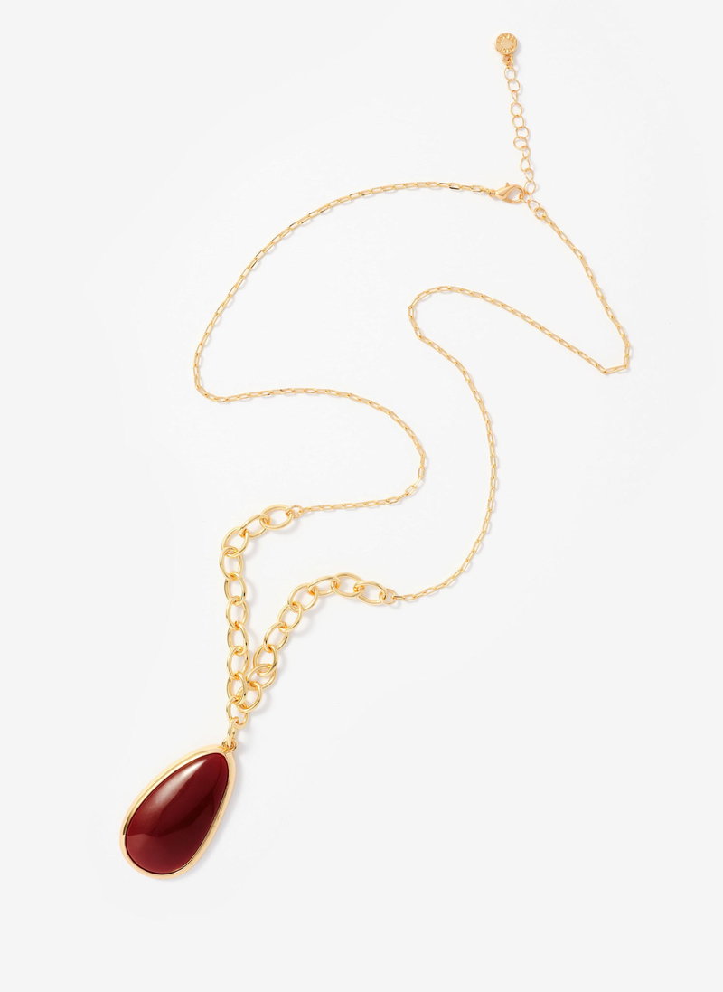 Gold tone drop chain pendant necklace featuring a red resin stone and an adjustable lobster clasp fastening.
