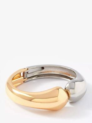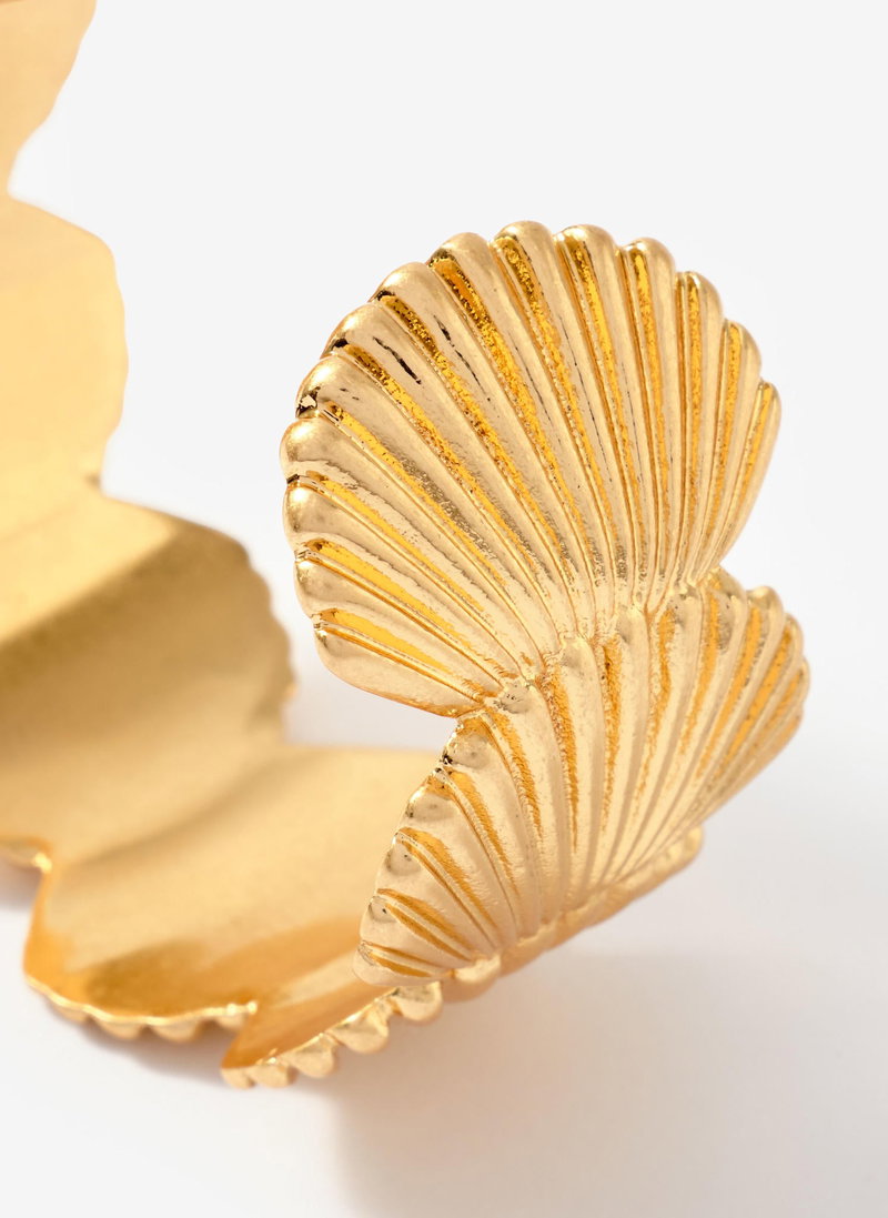 Gold tone open cuff featuring a shell design.