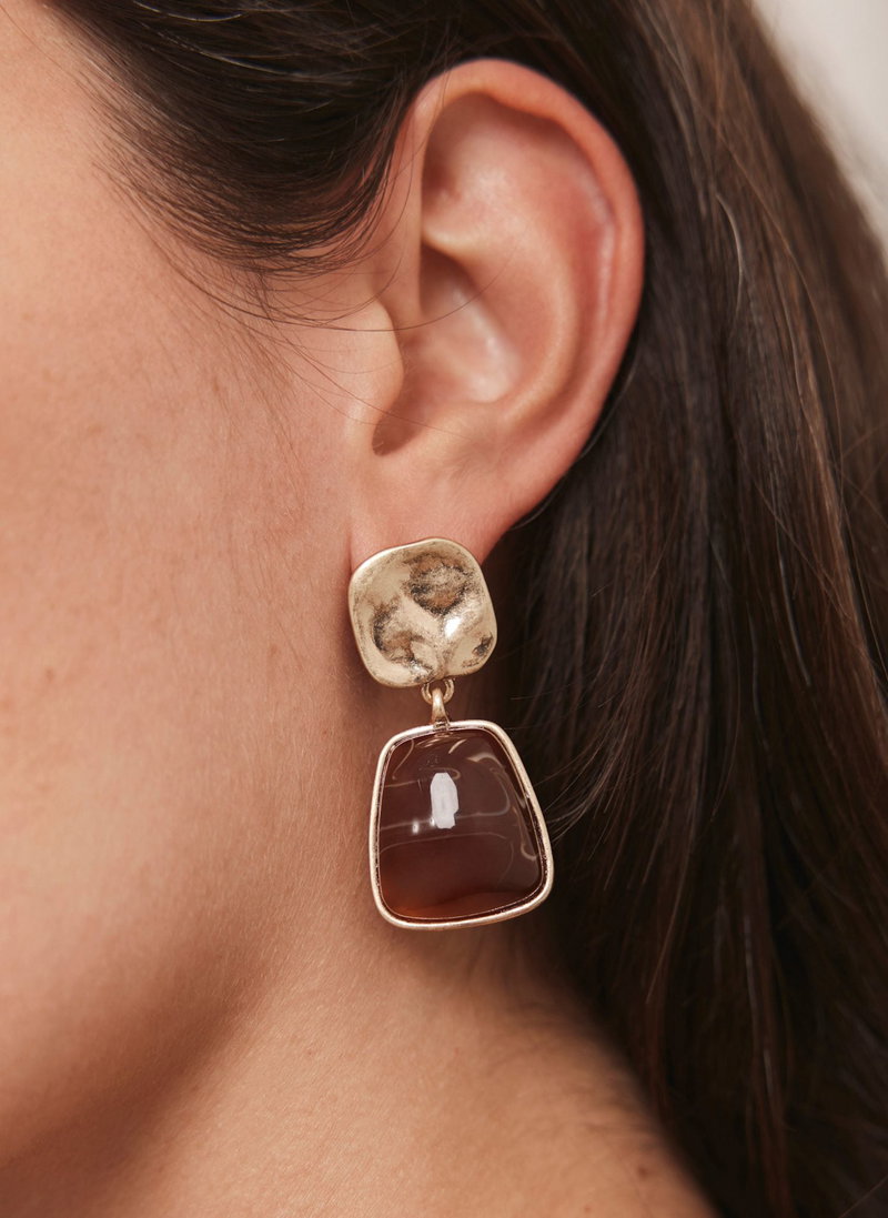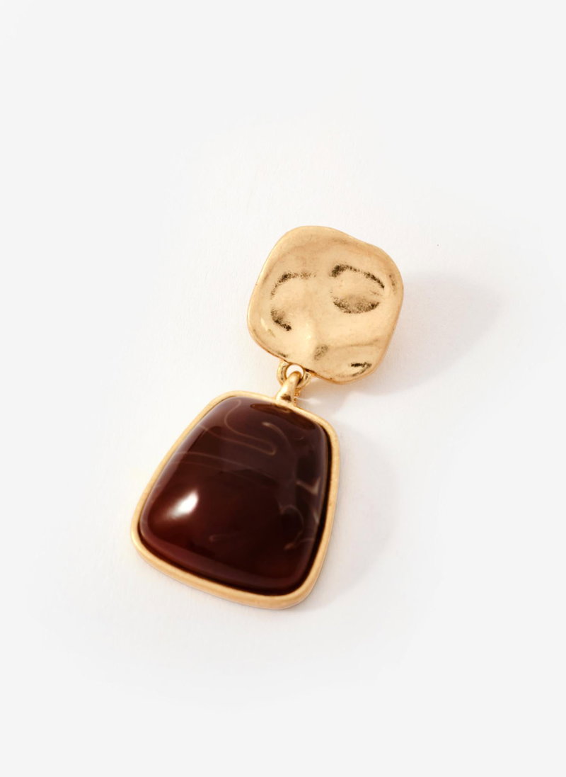 Gold tone earrings with hanging marbled stone and butterfly clasp fastening.