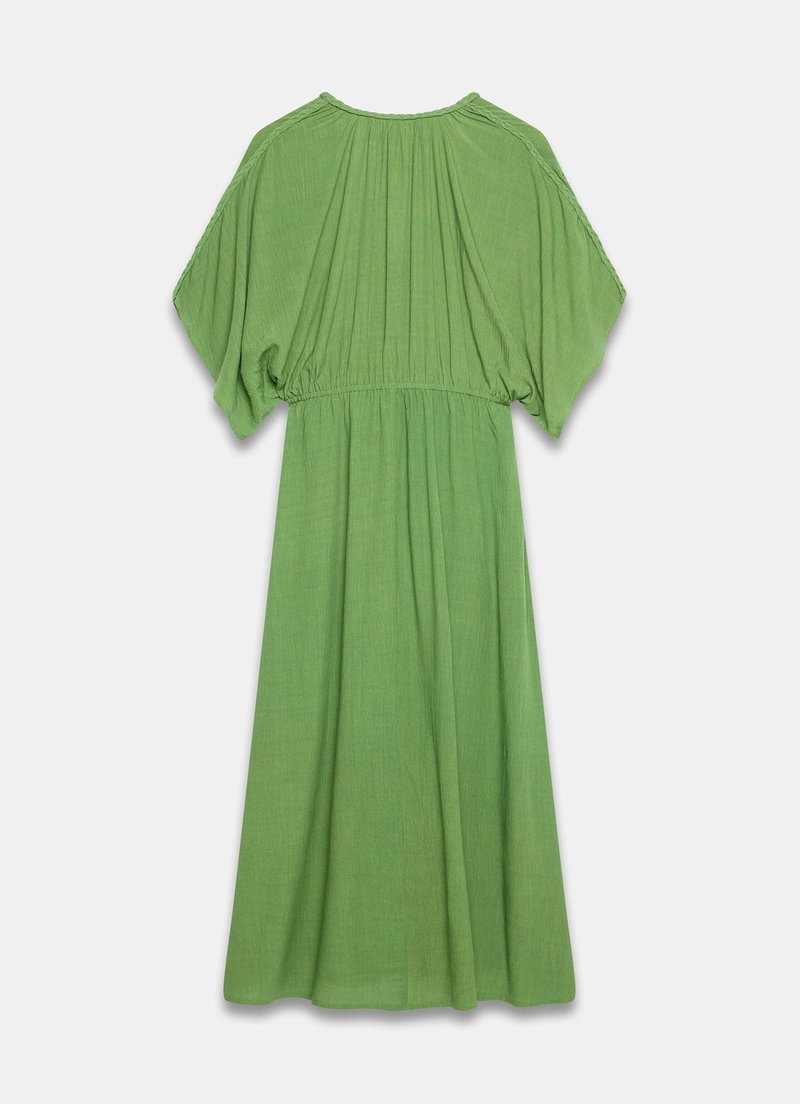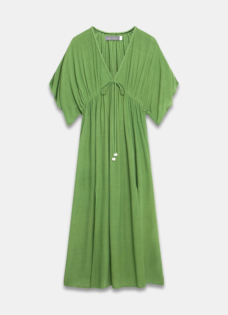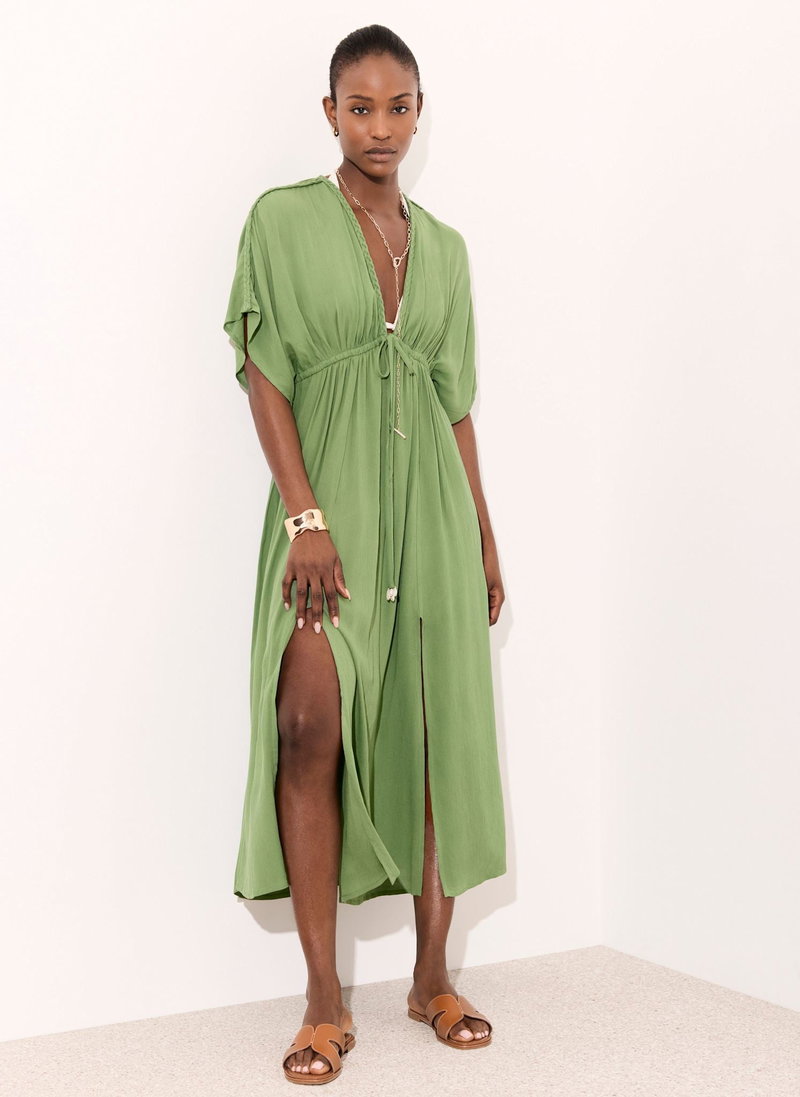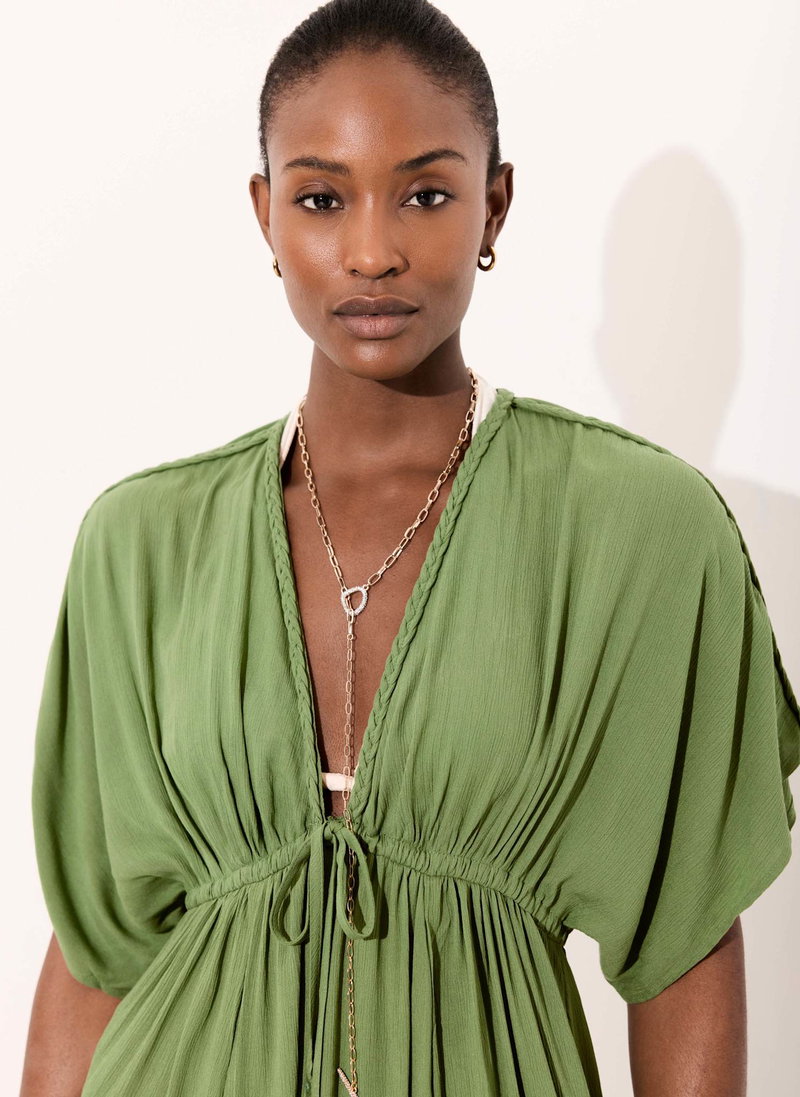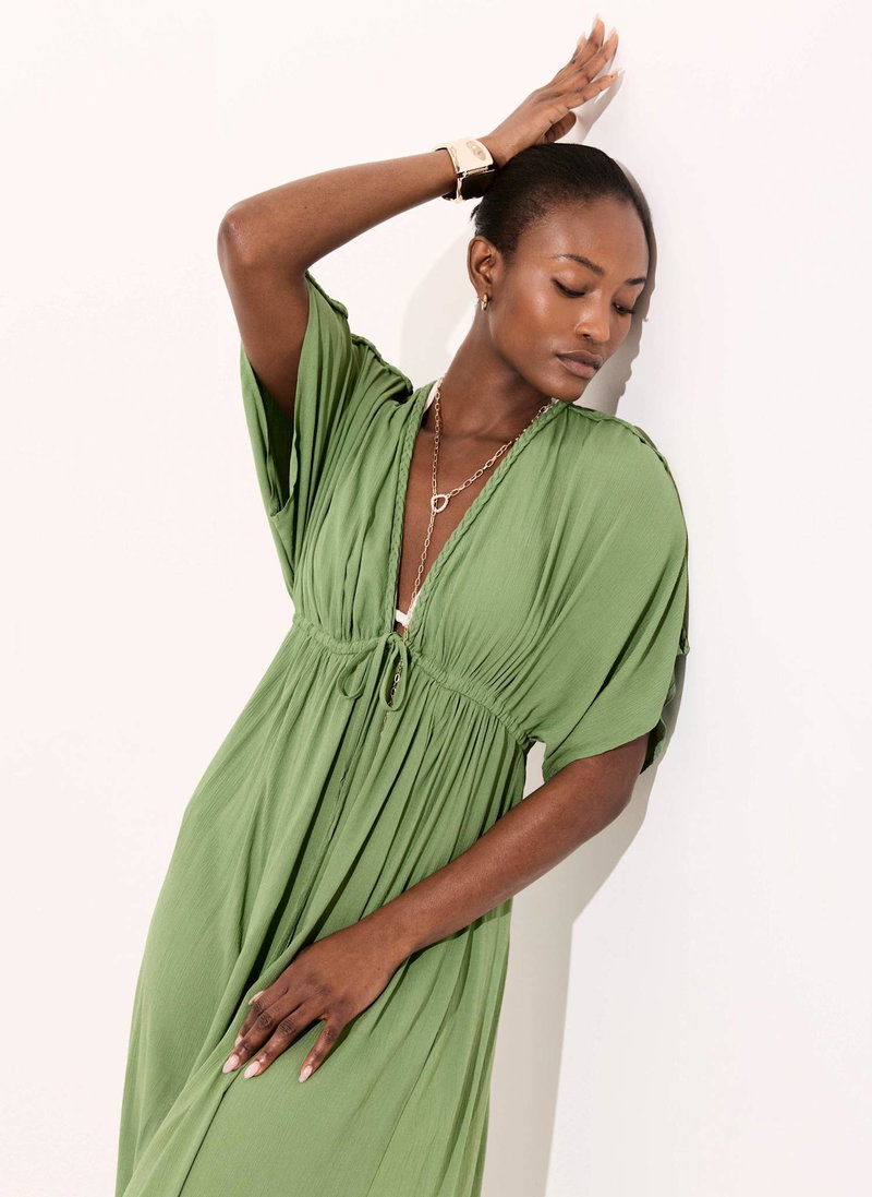 Green beach dress in a maxi silhouette featuring a V-neckline, plaited trim, short sleeves, gathered back with a tie fastening through the front.
