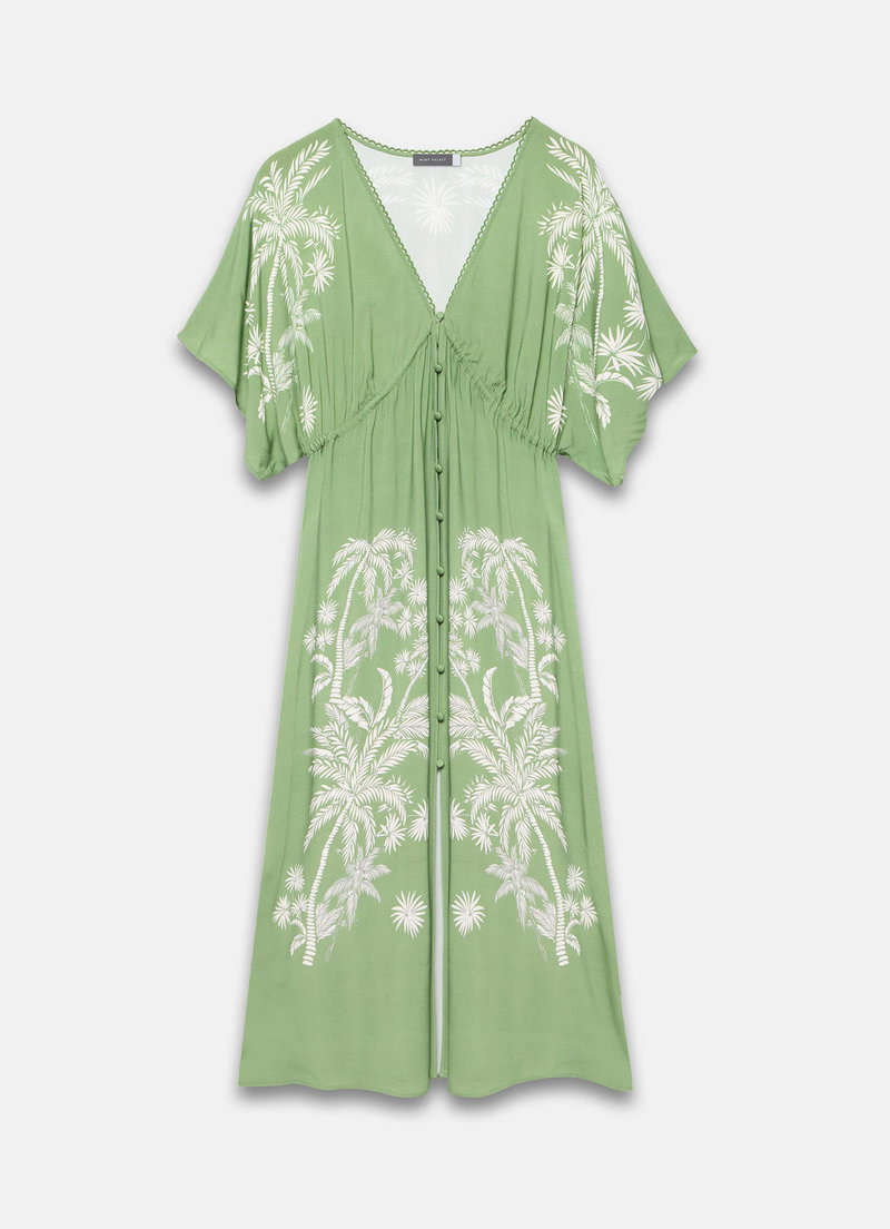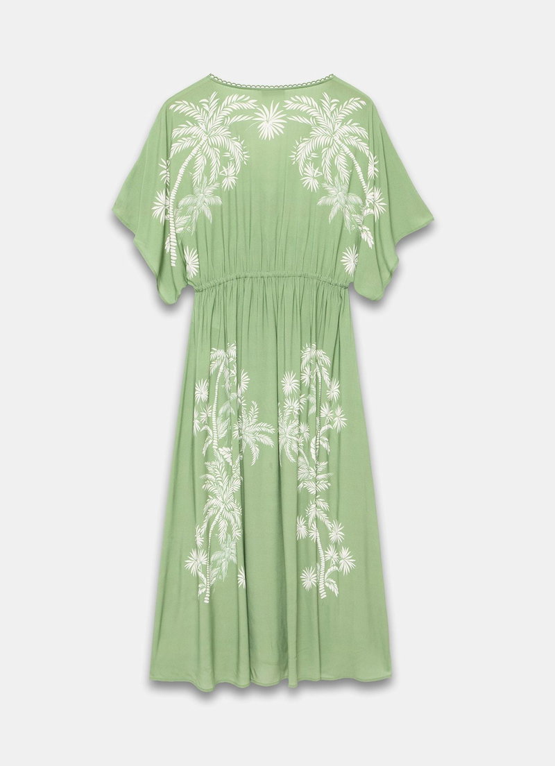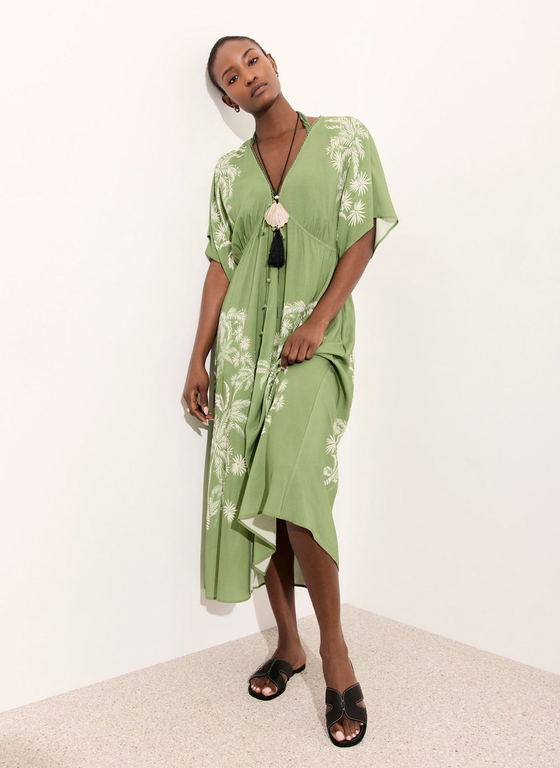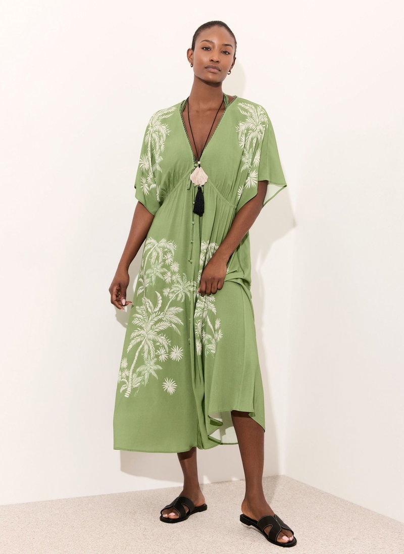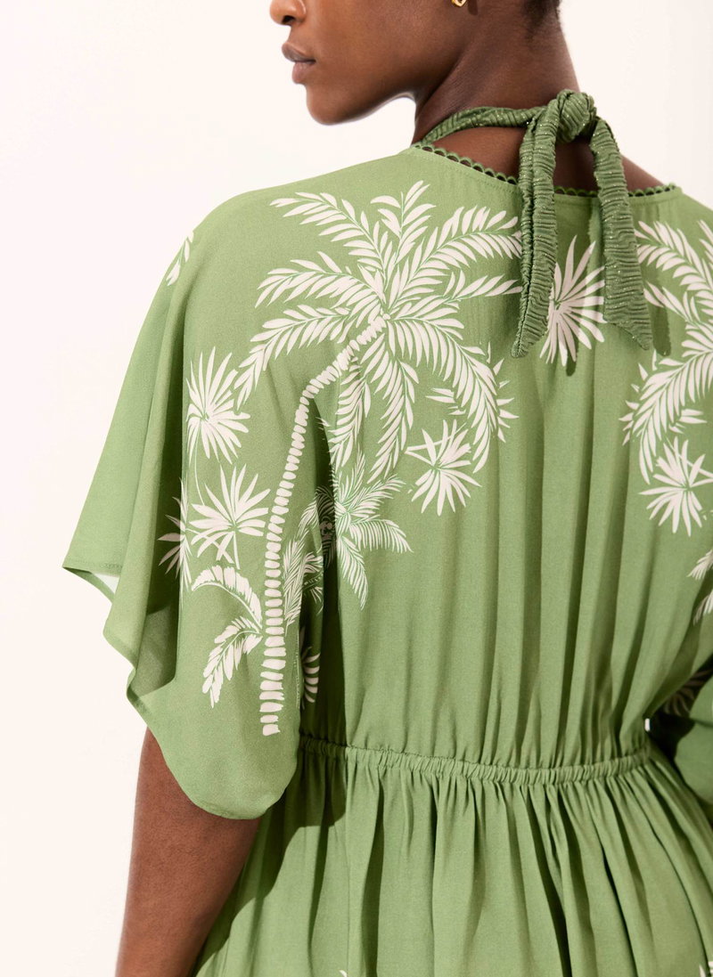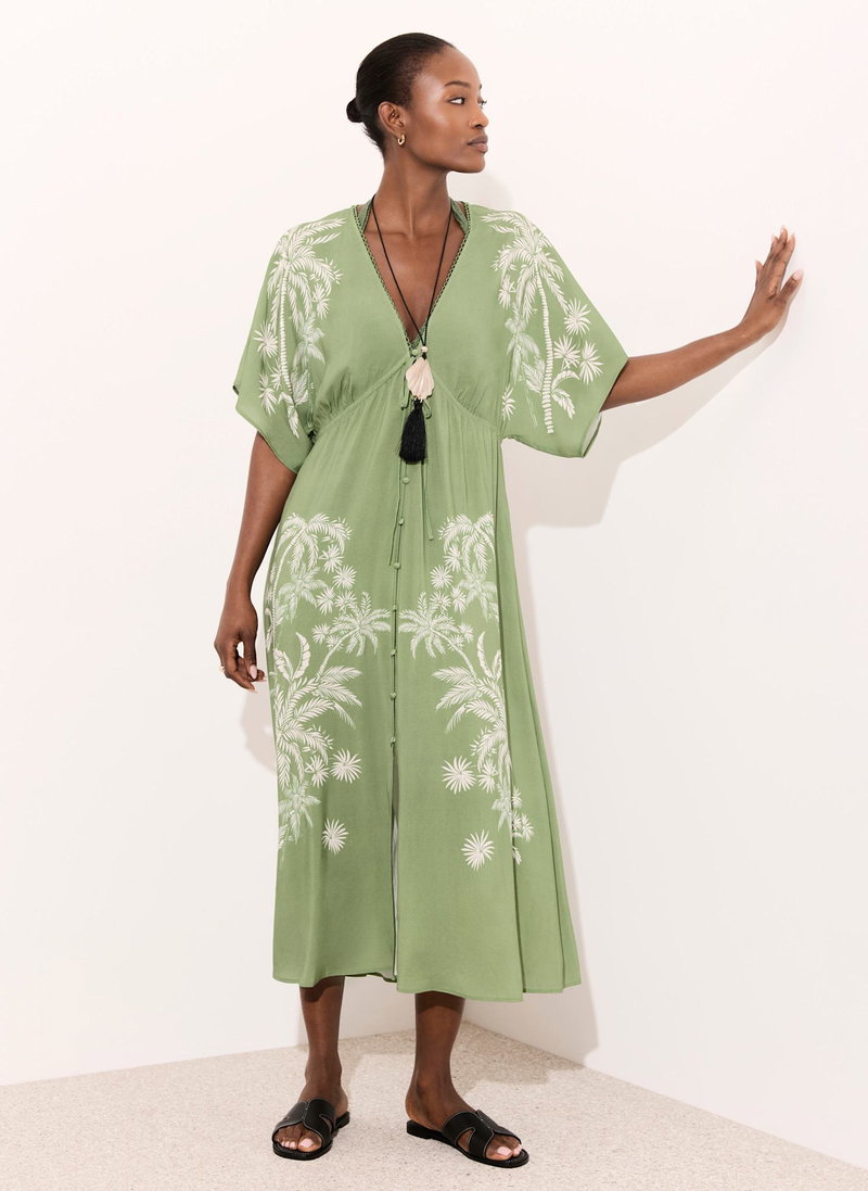 Green tone palm print cover-up, featuring a V-neckline, short sleeves, drawstring waistband, open stitch trim and a button fastening through the front.