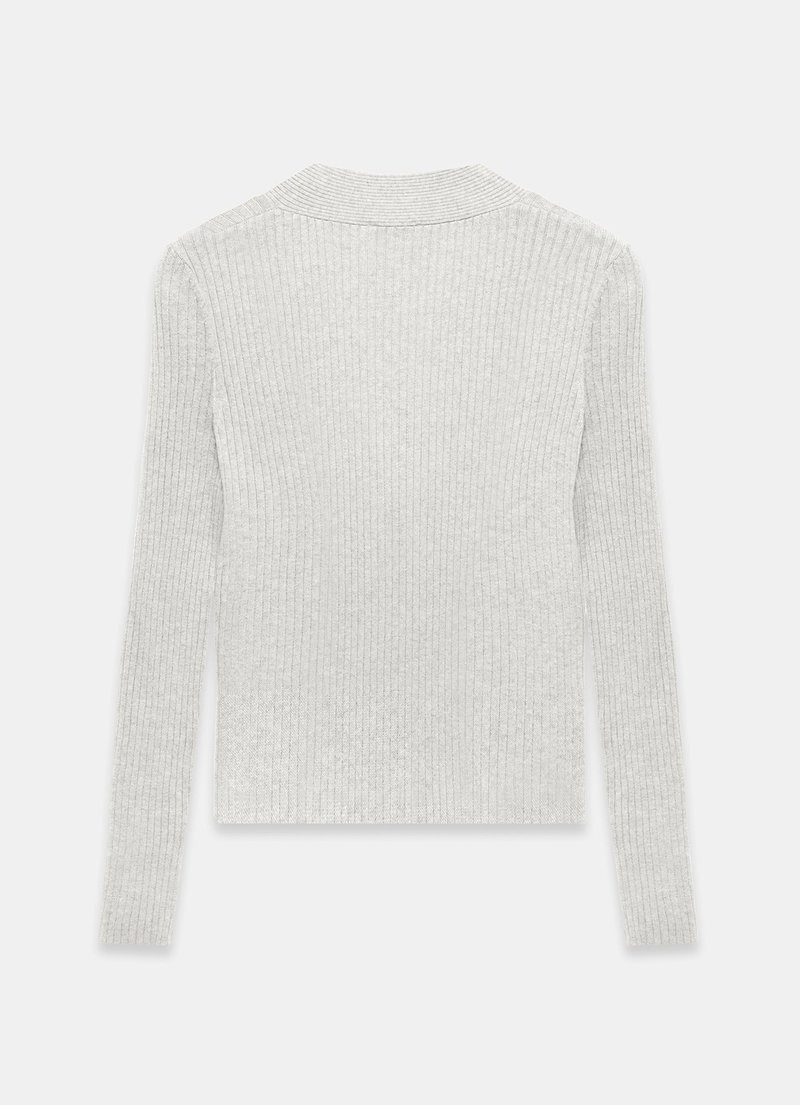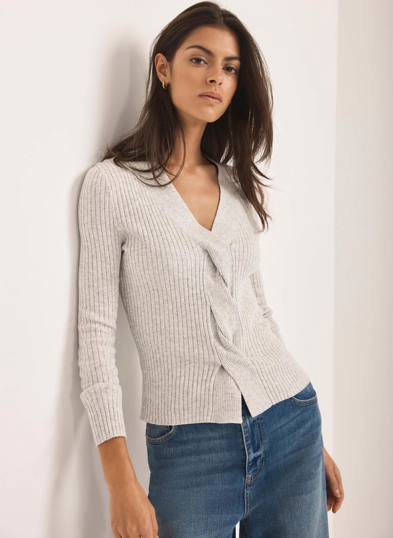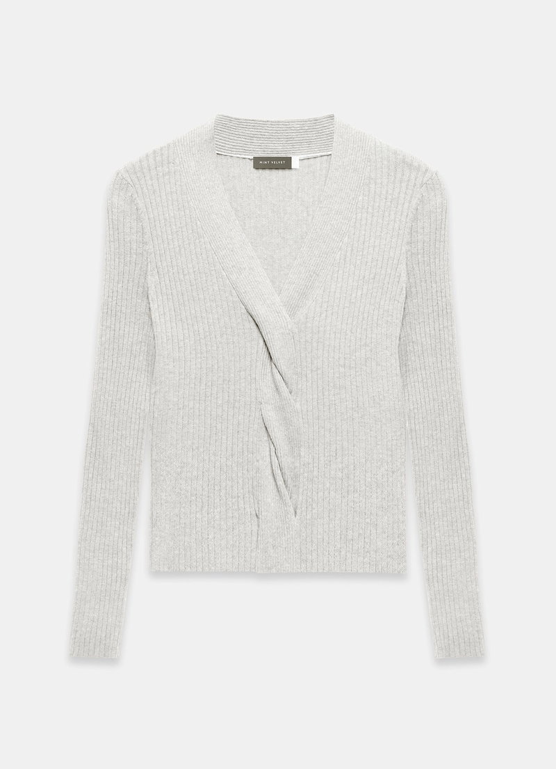Grey ribbed top featuring a V-neckline, long sleeves and twist feature through the front.