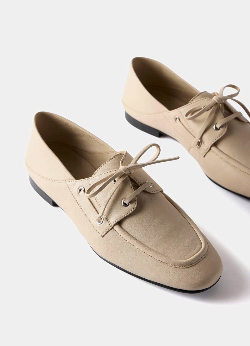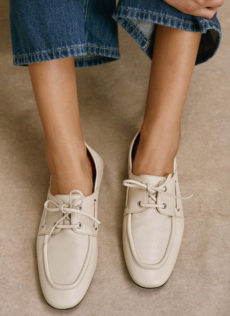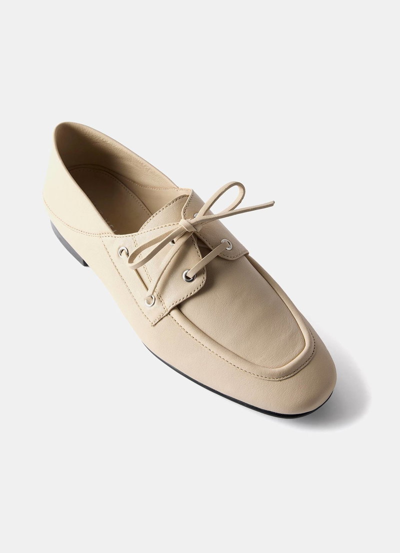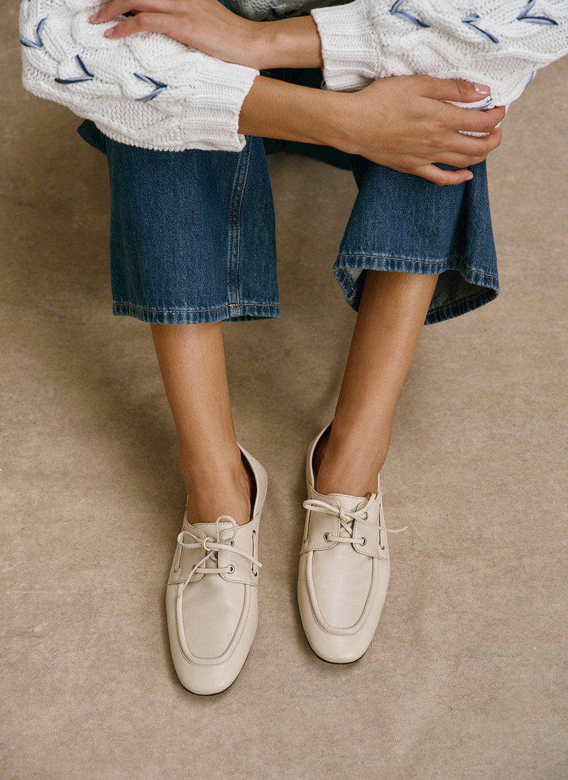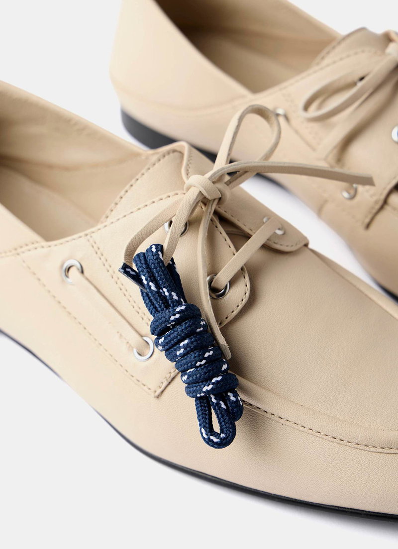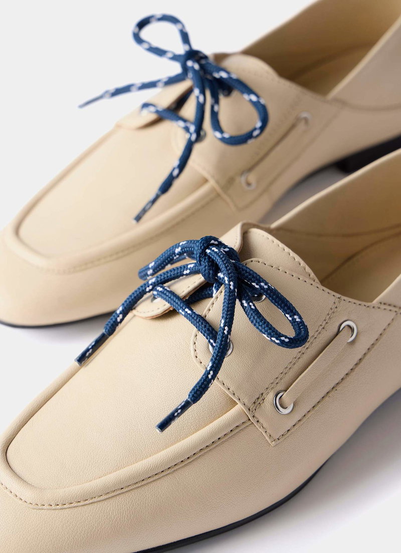 Cream leather deck shoes featuring a round toe, flat sole, collapsible back and lace fastening through the front. Additional blue laces.