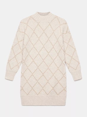 A knit jumper mini dress with a high neckline featuring long sleeves and elongated cuffs.
