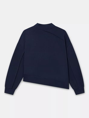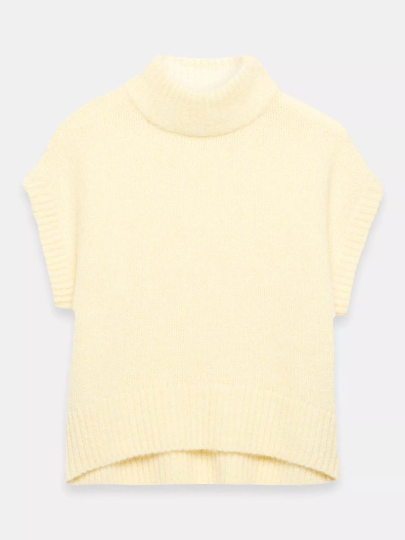 A knit sleeveless top featuring a high neckline, ribbed trim and curved hemline.