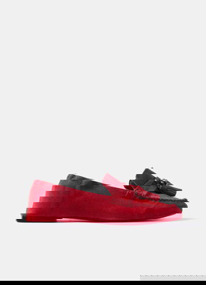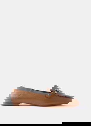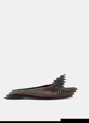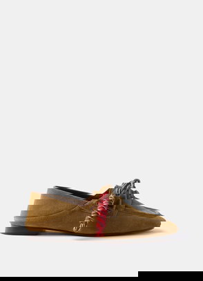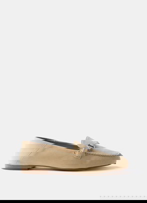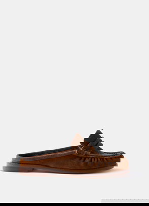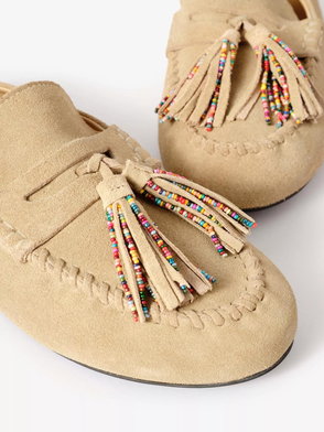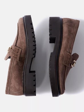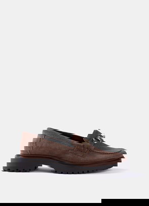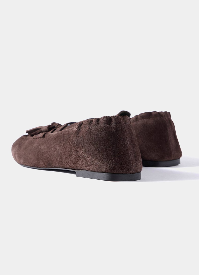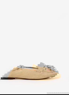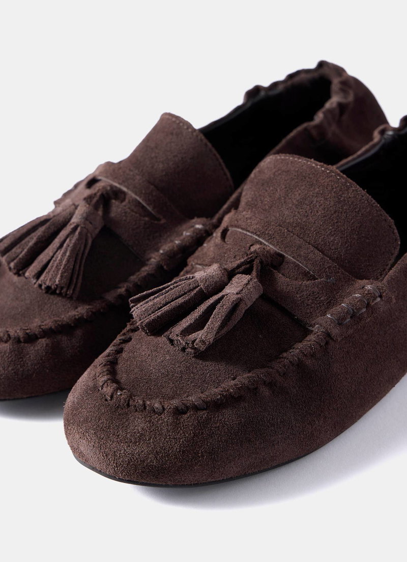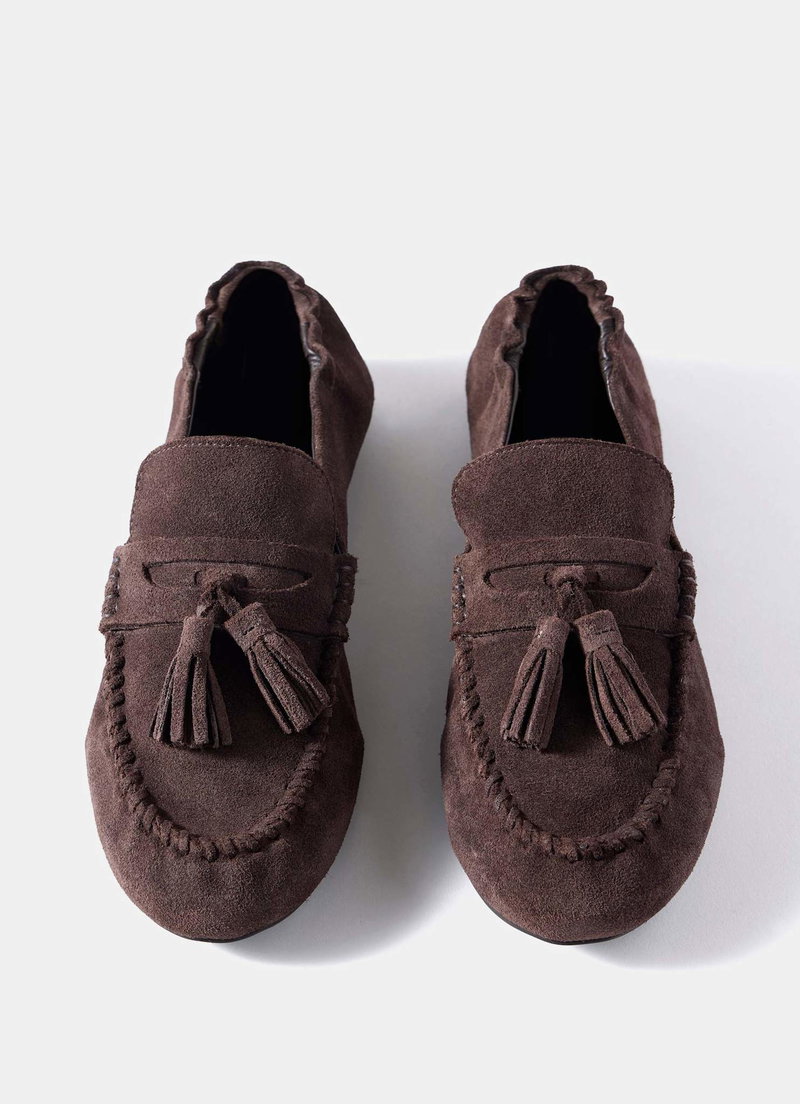 Brown suede loafers featuring a round toe, stitched trim, flat sole, elasticated heel and tassel detailing.