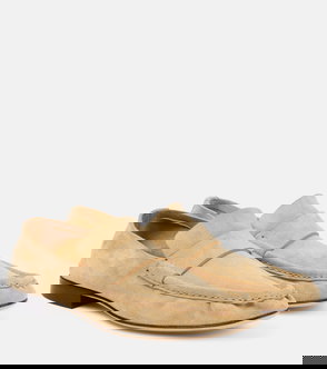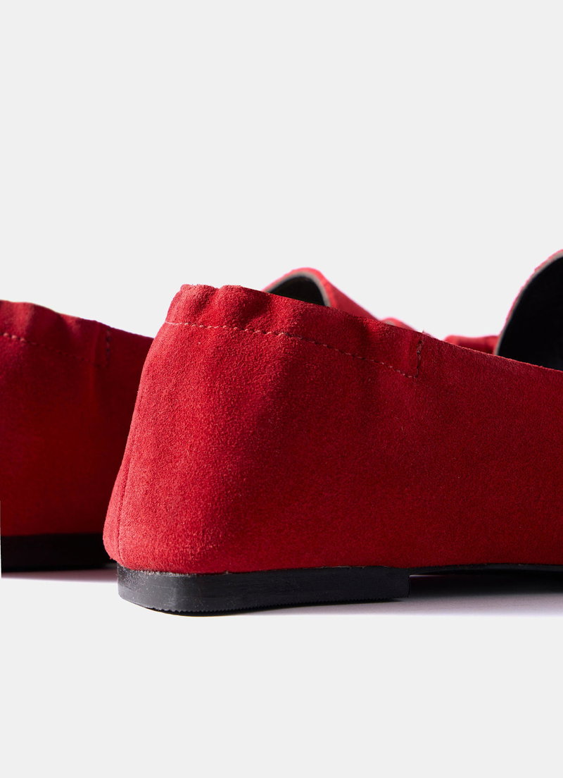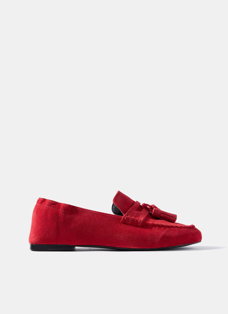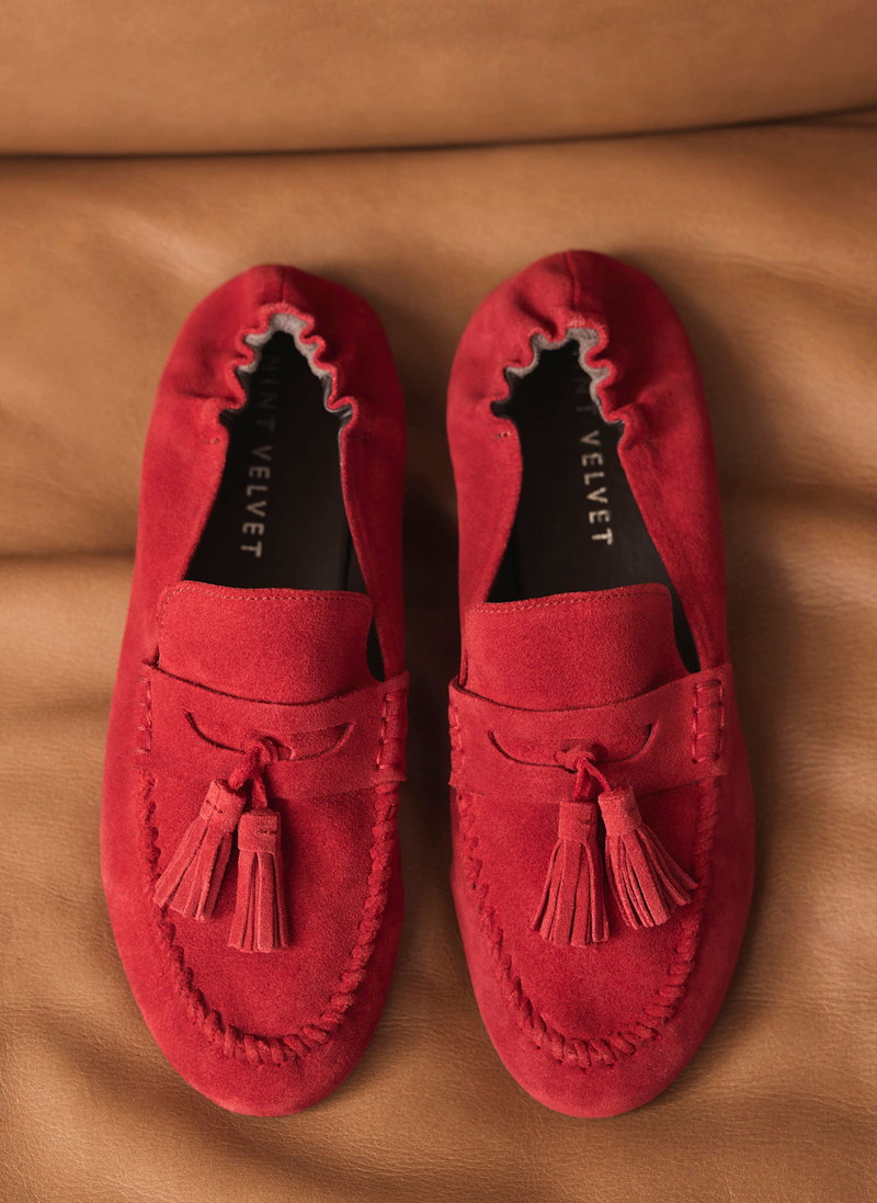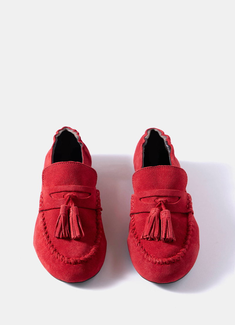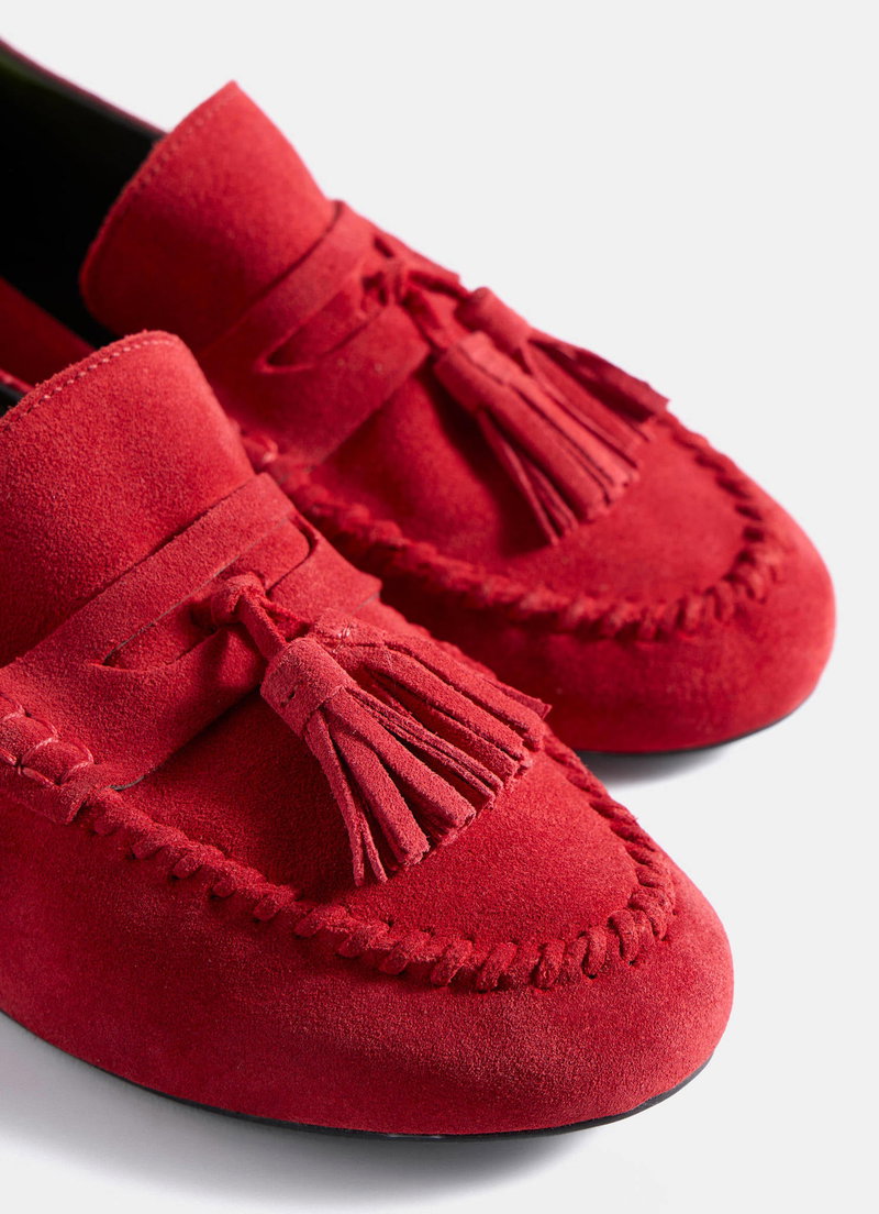 Red suede loafers featuring a round toe, stitched trim, flat sole, elasticated heel and tassel detailing.