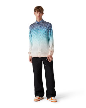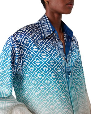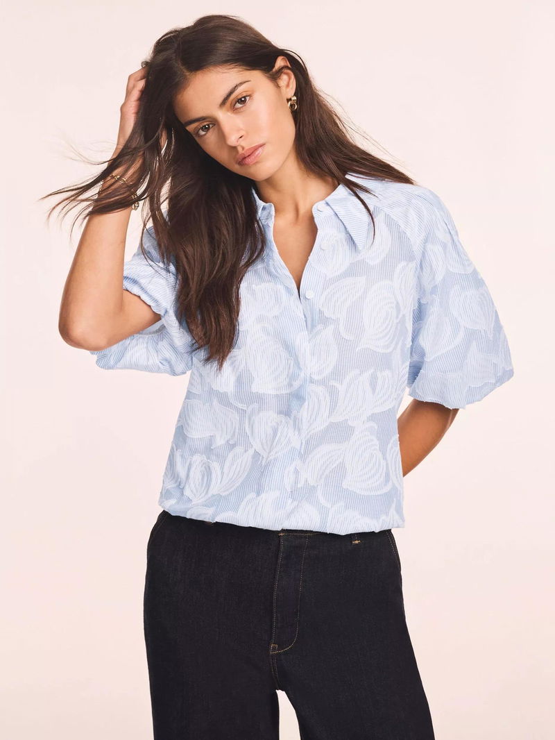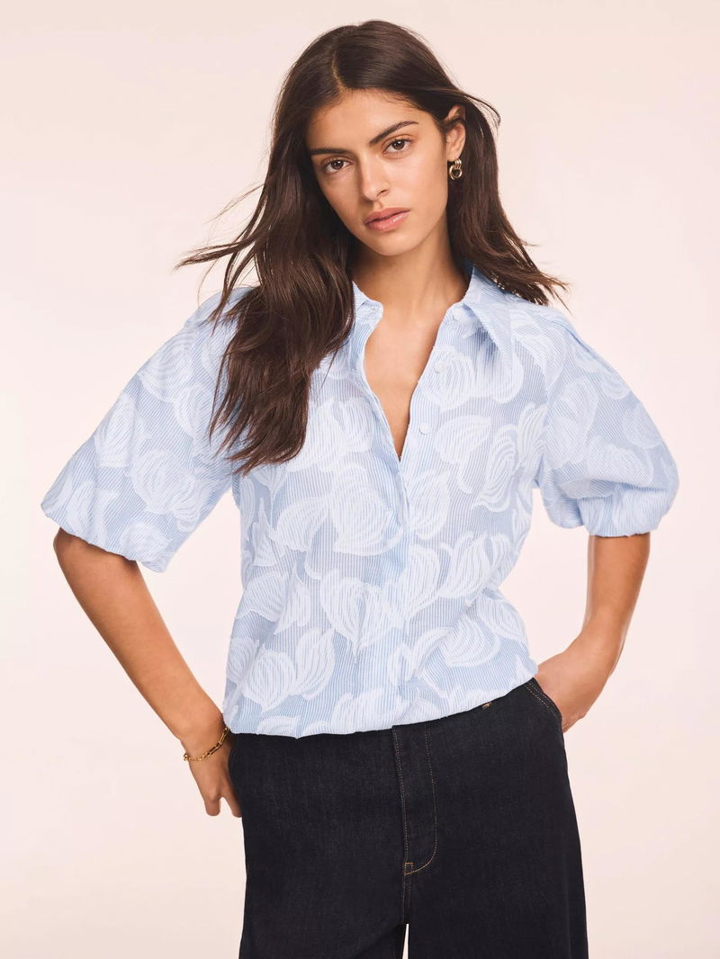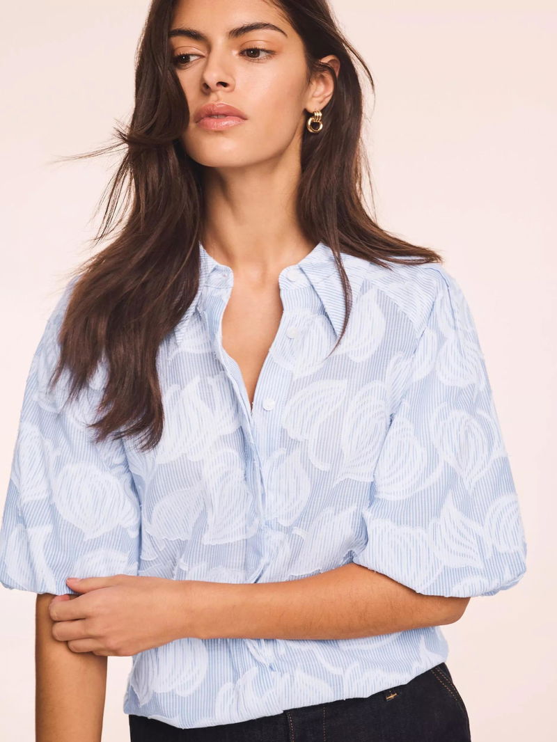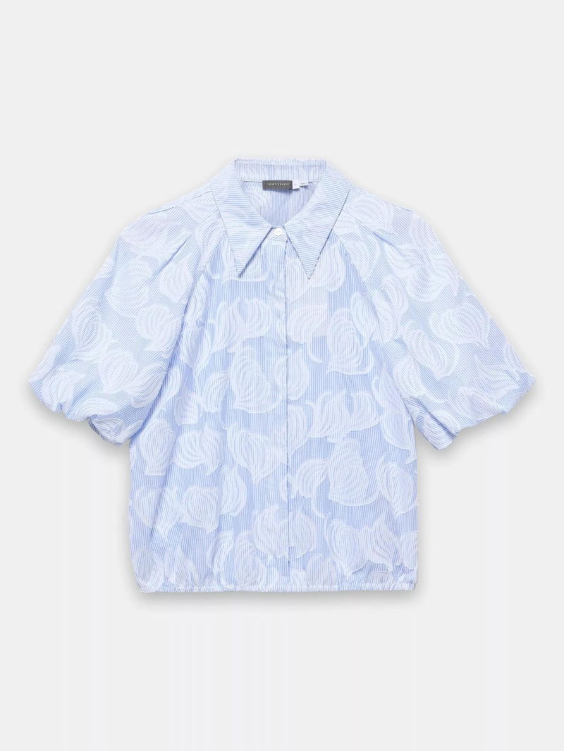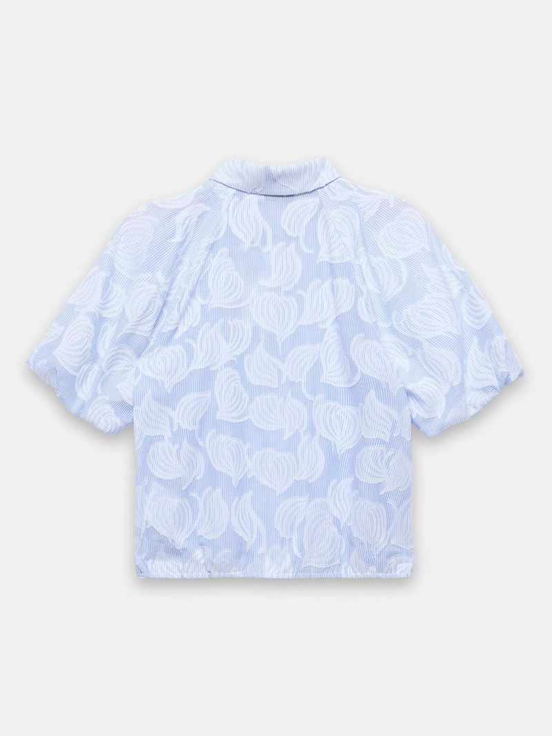 A floral striped shirt featuring a classic collar, short puff sleeves, elasticated waistband with a concealed button fastening through the front.