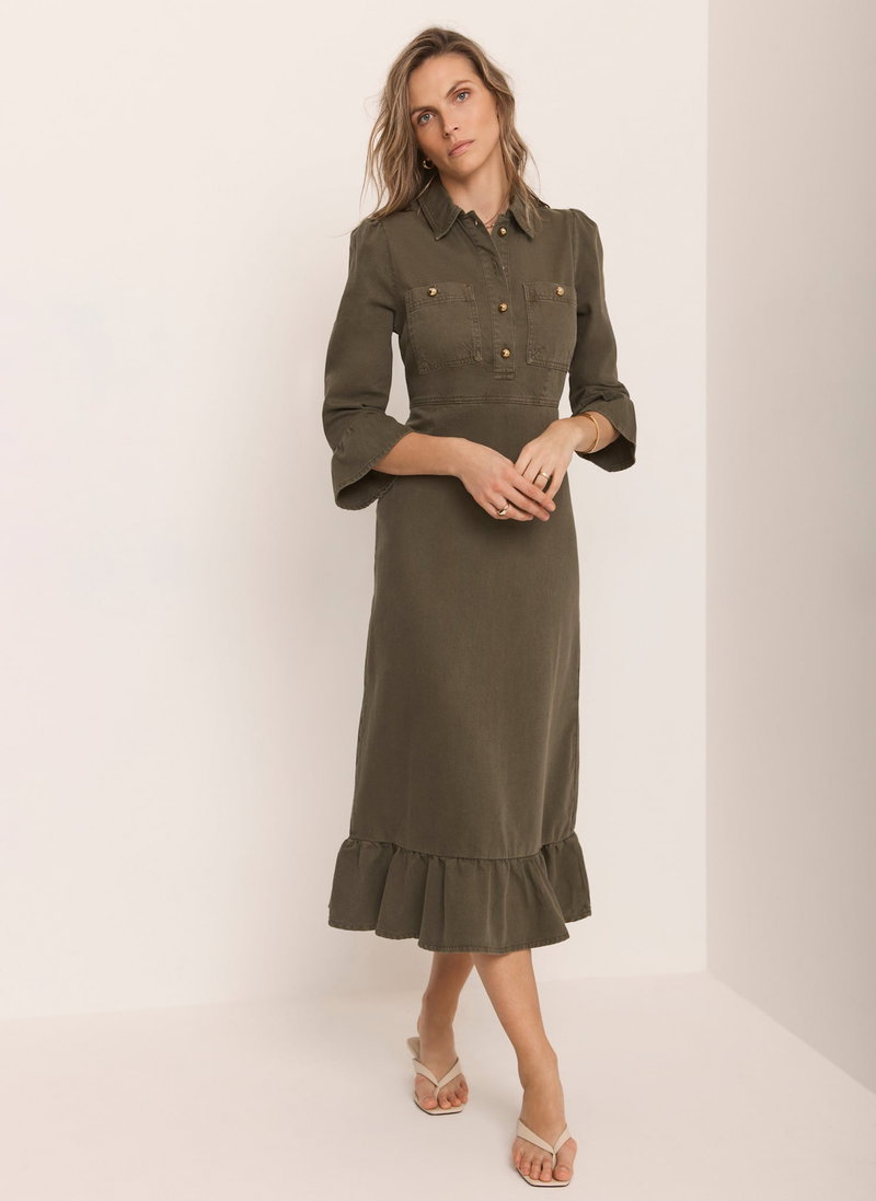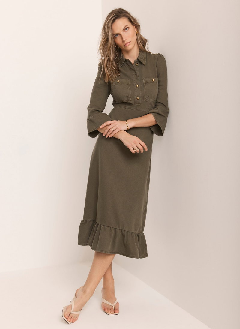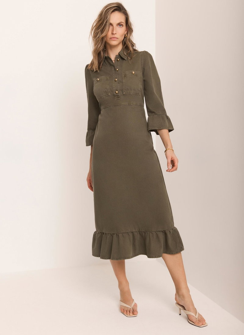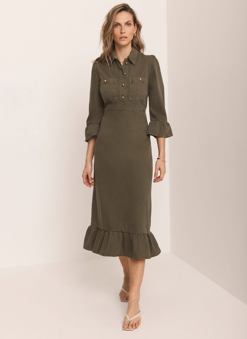 Khaki denim shirt dress in a midi silhouette with a classic collar, 3/4 fluted sleeves, chest pockets, ruffle hemline, featuring button fastenings through the front and a zip fastening through the back.
