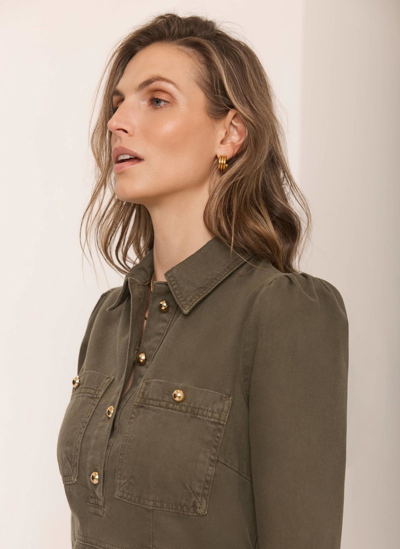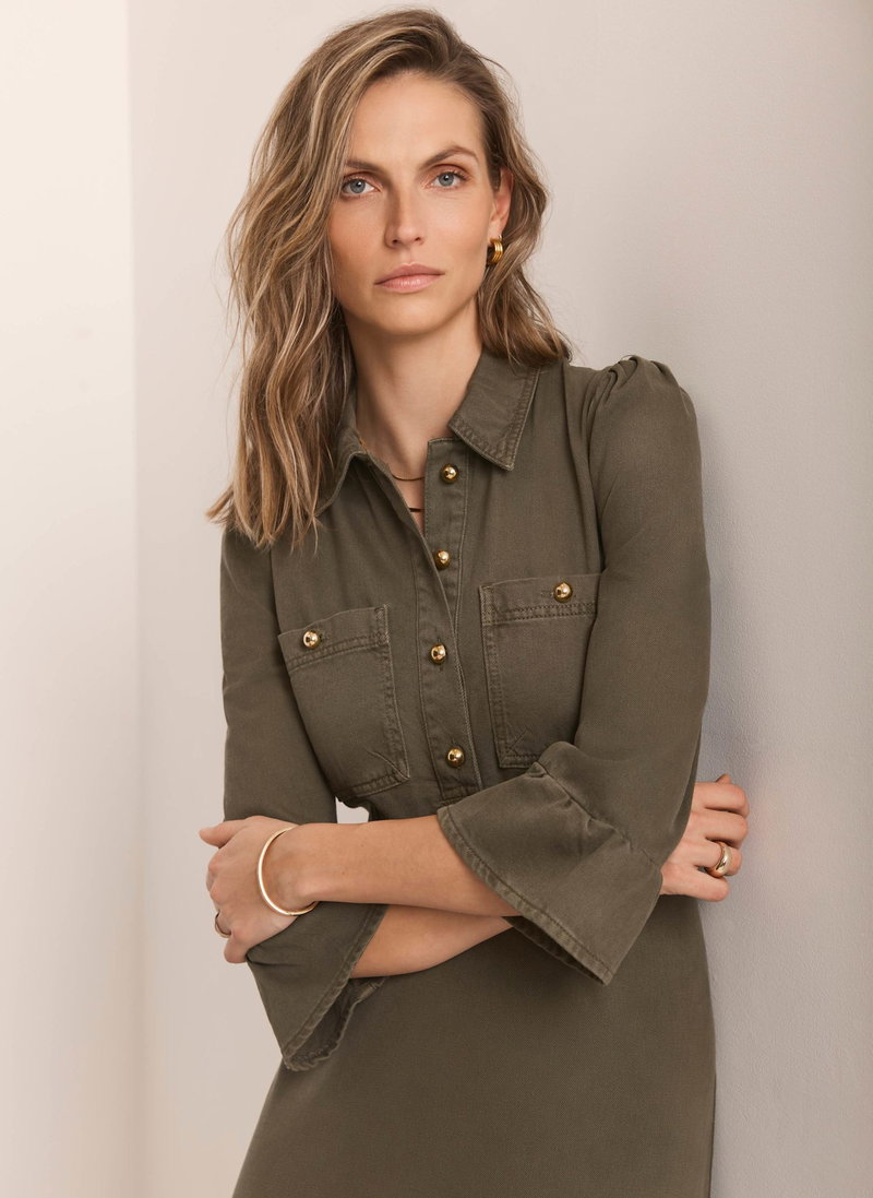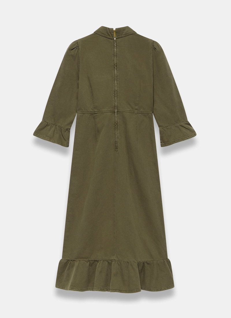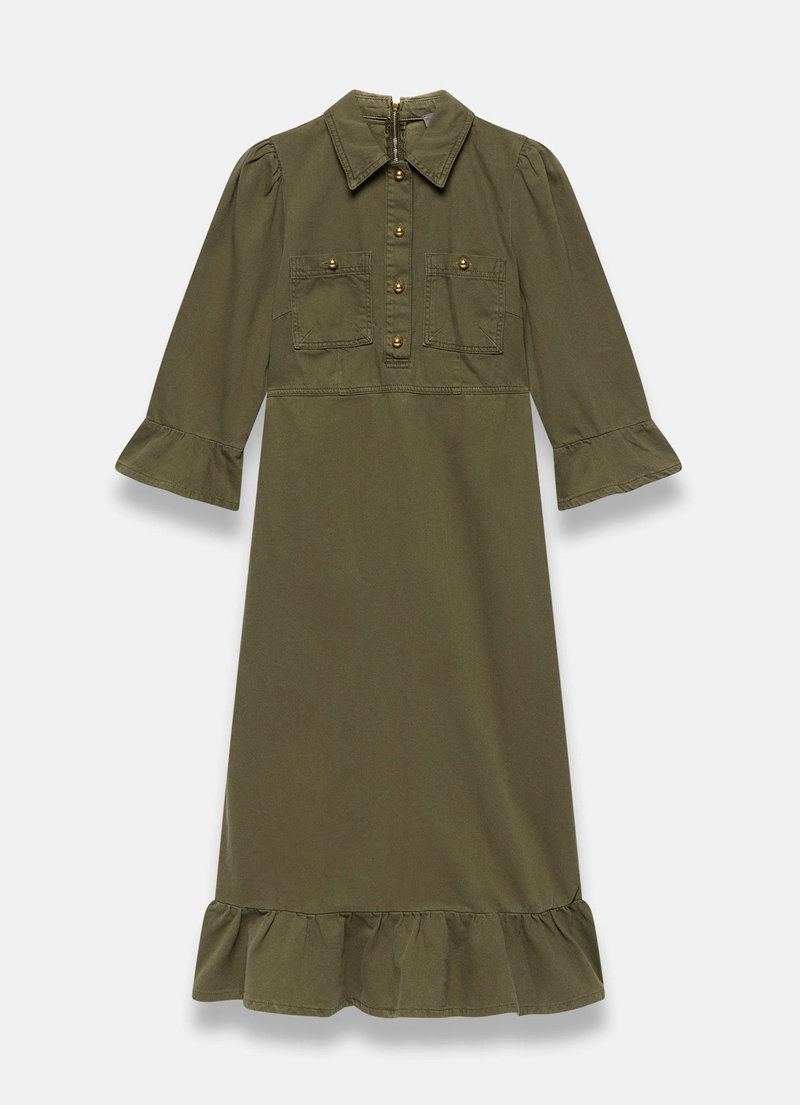 Khaki denim shirt dress in a midi silhouette with a classic collar, 3/4 fluted sleeves, chest pockets, ruffle hemline, featuring button fastenings through the front and a zip fastening through the back.