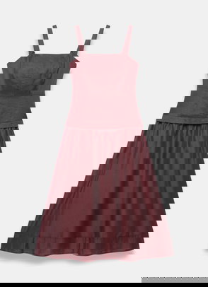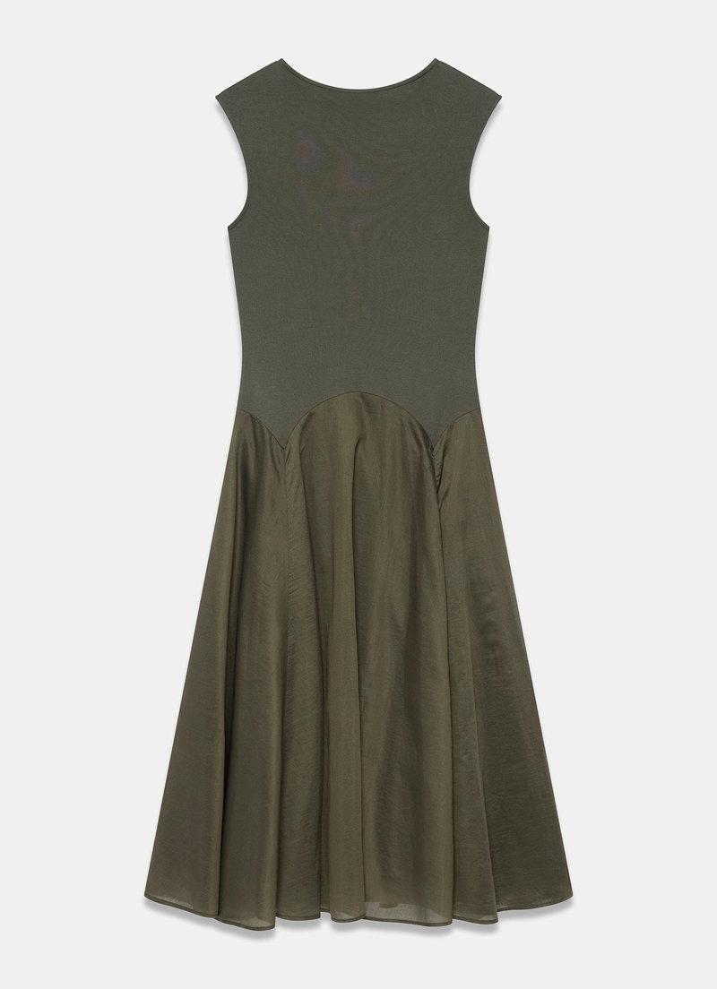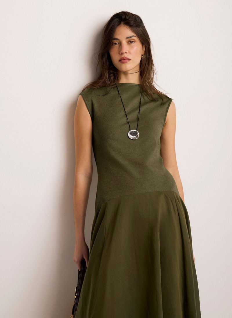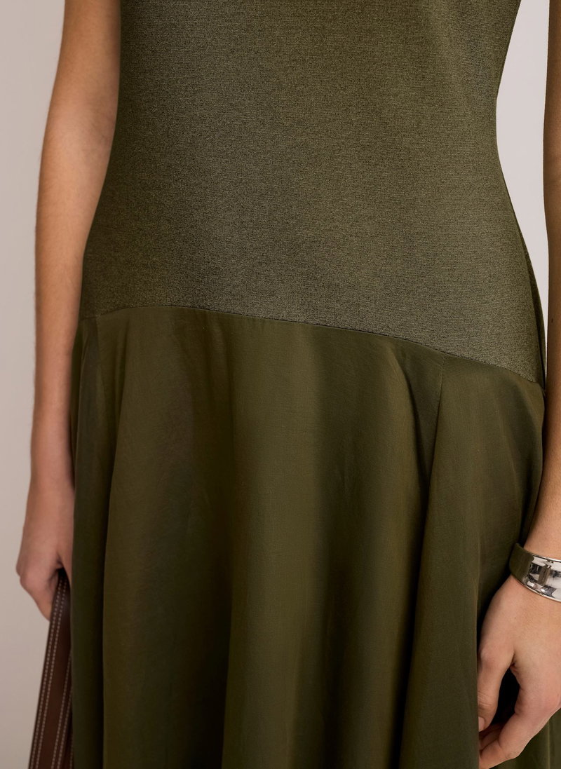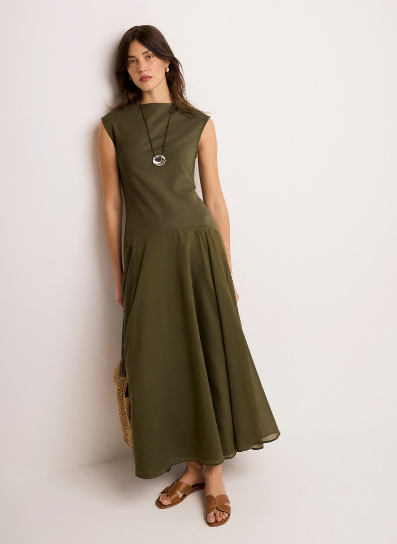 Khaki woven jersey mix sleeveless dress in a maxi silhouette featuring a slash neckline and drop waist.