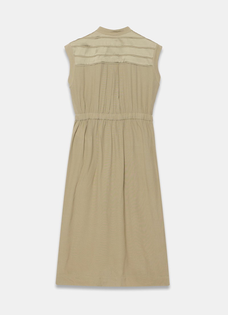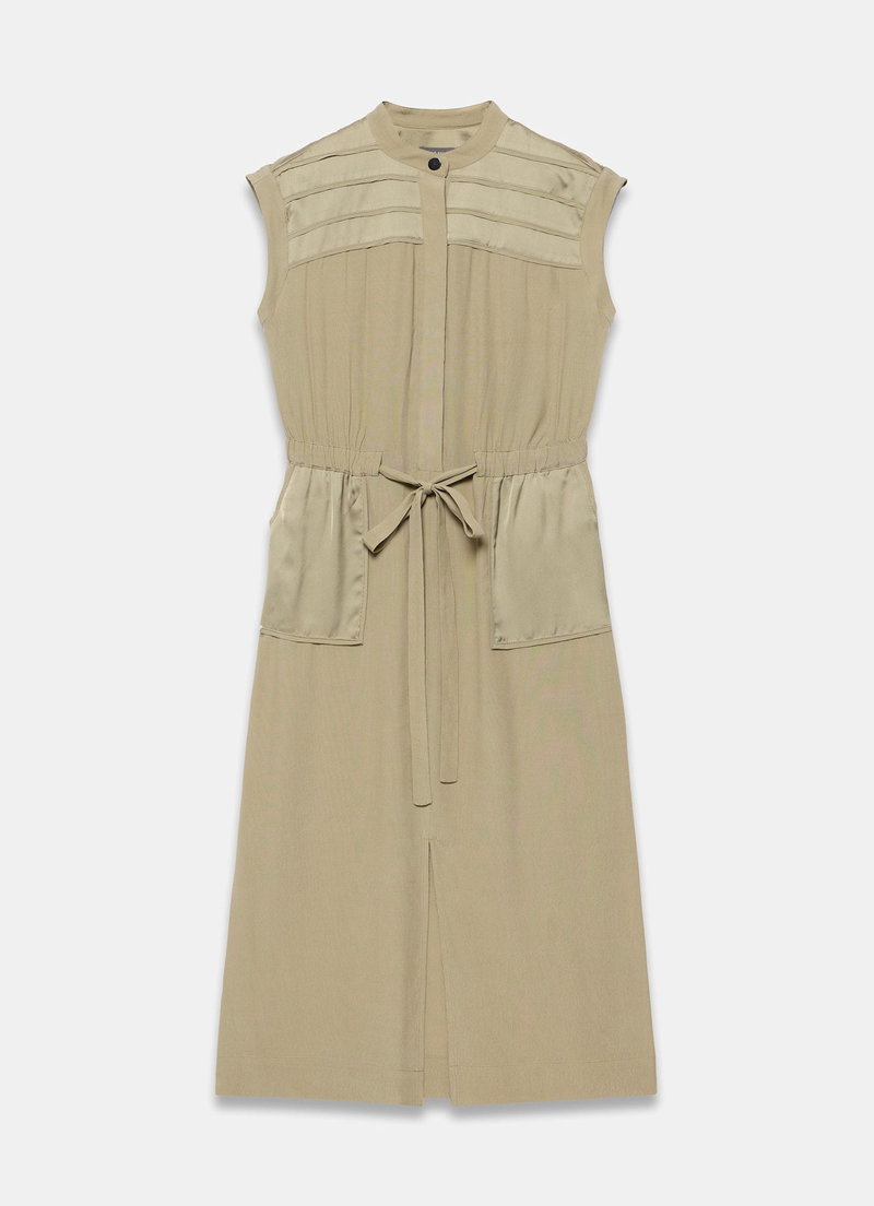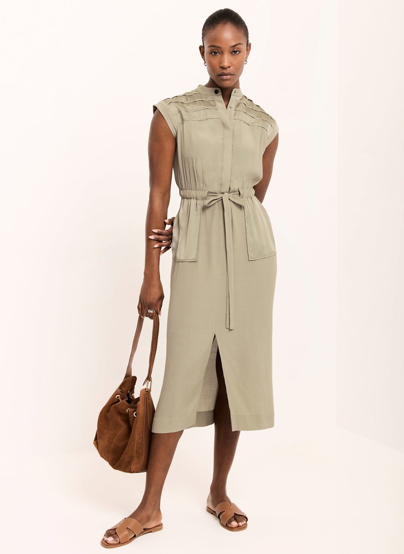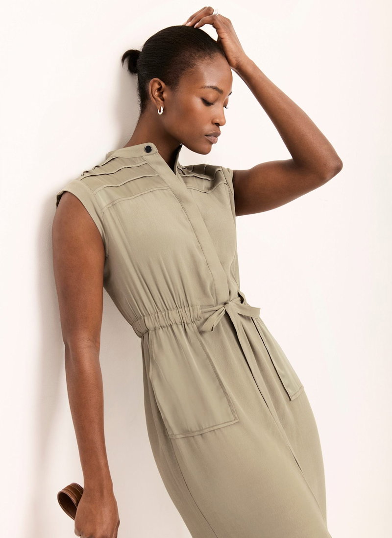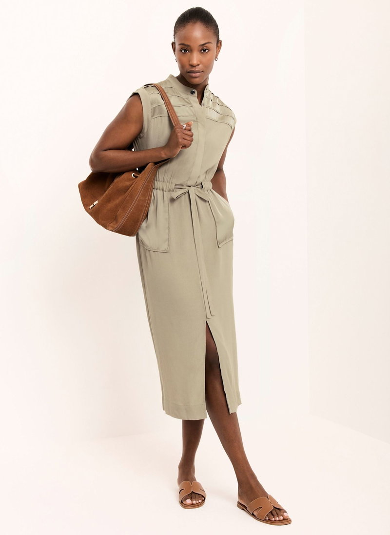 Khaki sleeveless utility dress in a midi silhouette featuring a crew neckline, satin panelling, side pockets, drawstring waistband, front split with a concealed button fastening through the front.