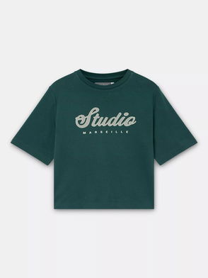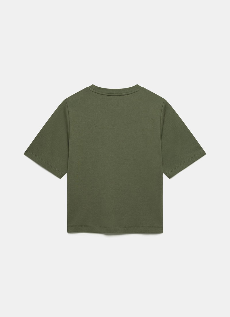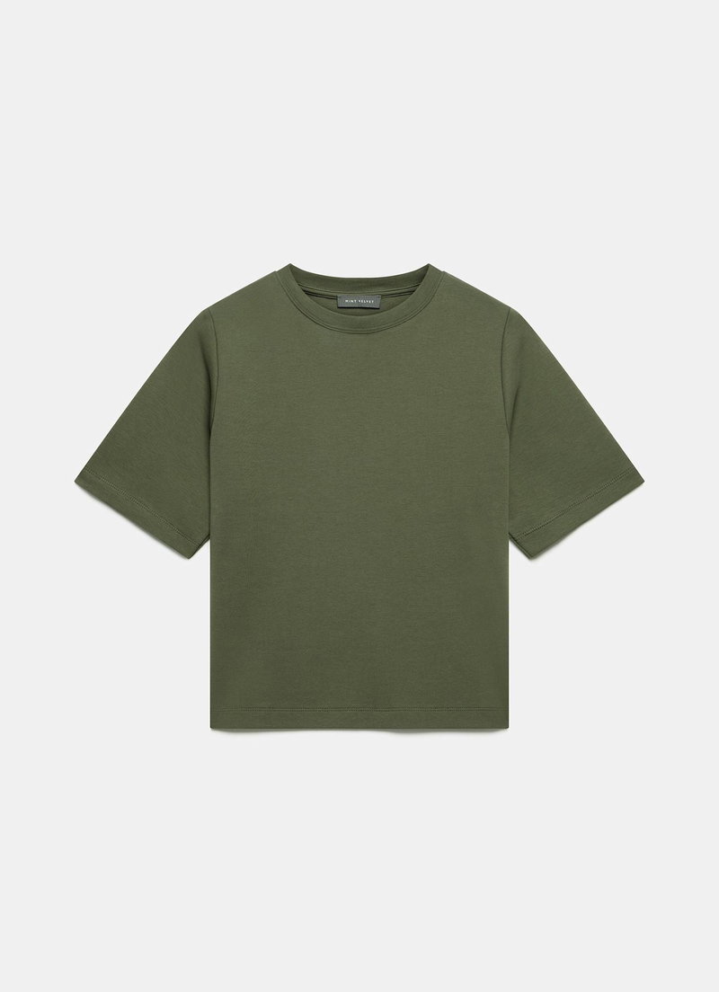 Khaki tone t-shirt featuring a crew neckline and short sleeves.