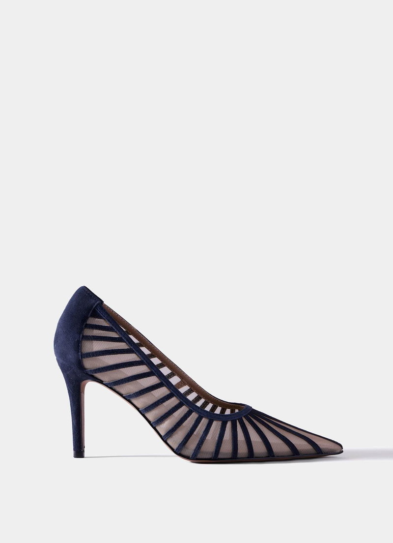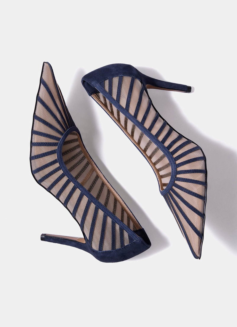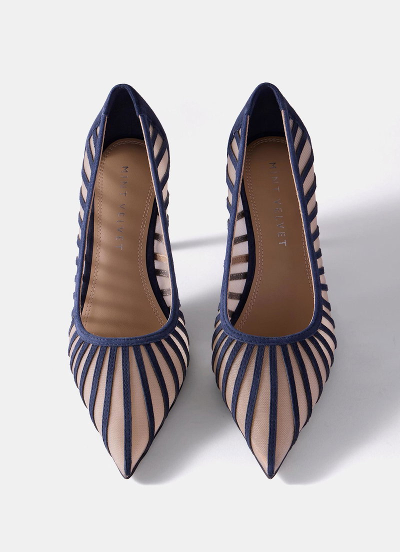 Navy tone mesh caged court shoe featuring a pointed toe, high heel and suede panelling.