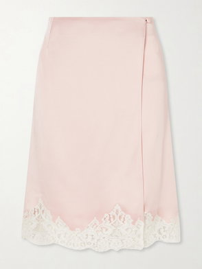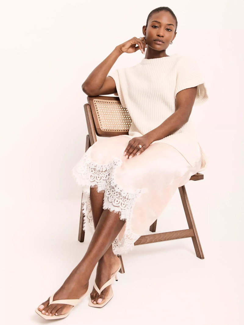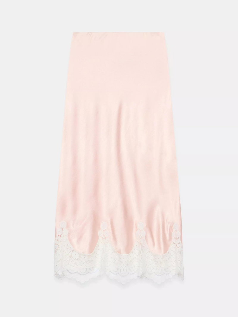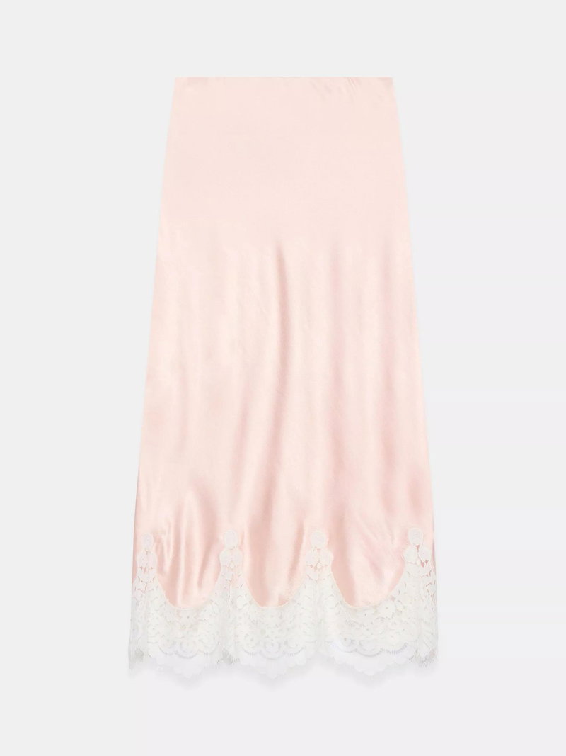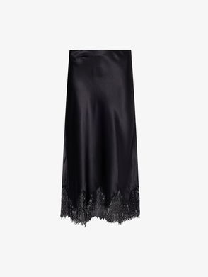 A satin skirt in a midi silhouette featuring an elasticated waistband and contrast lace trim.