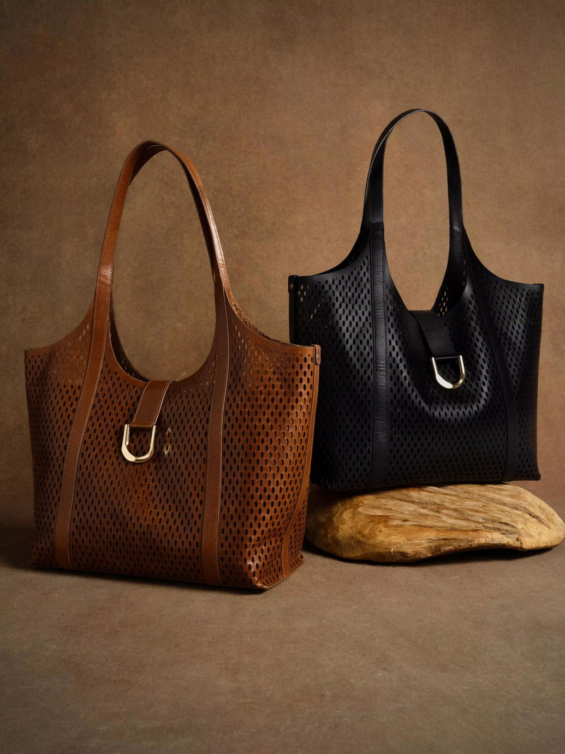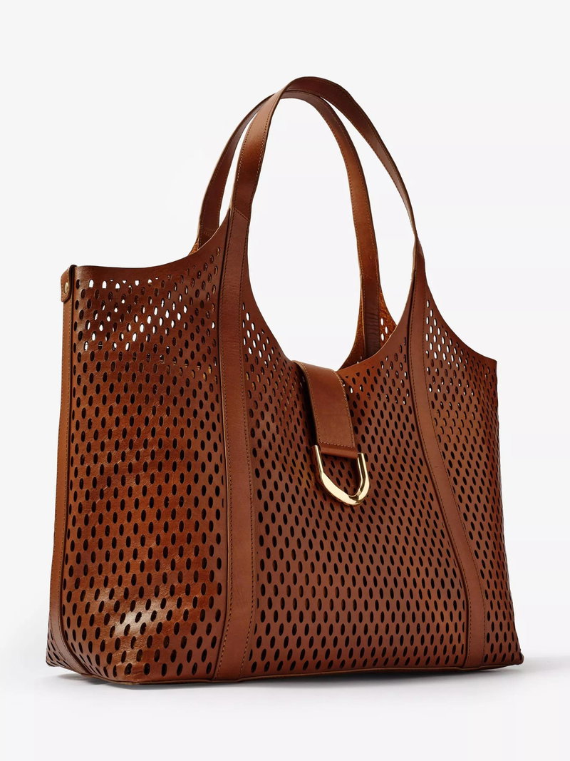 A laser cut tote bag featuring shoulder straps, internal removable cotton pouch with zip pocket, slip pockets and zip fastening through the top and gold-tone D-ring detailing.