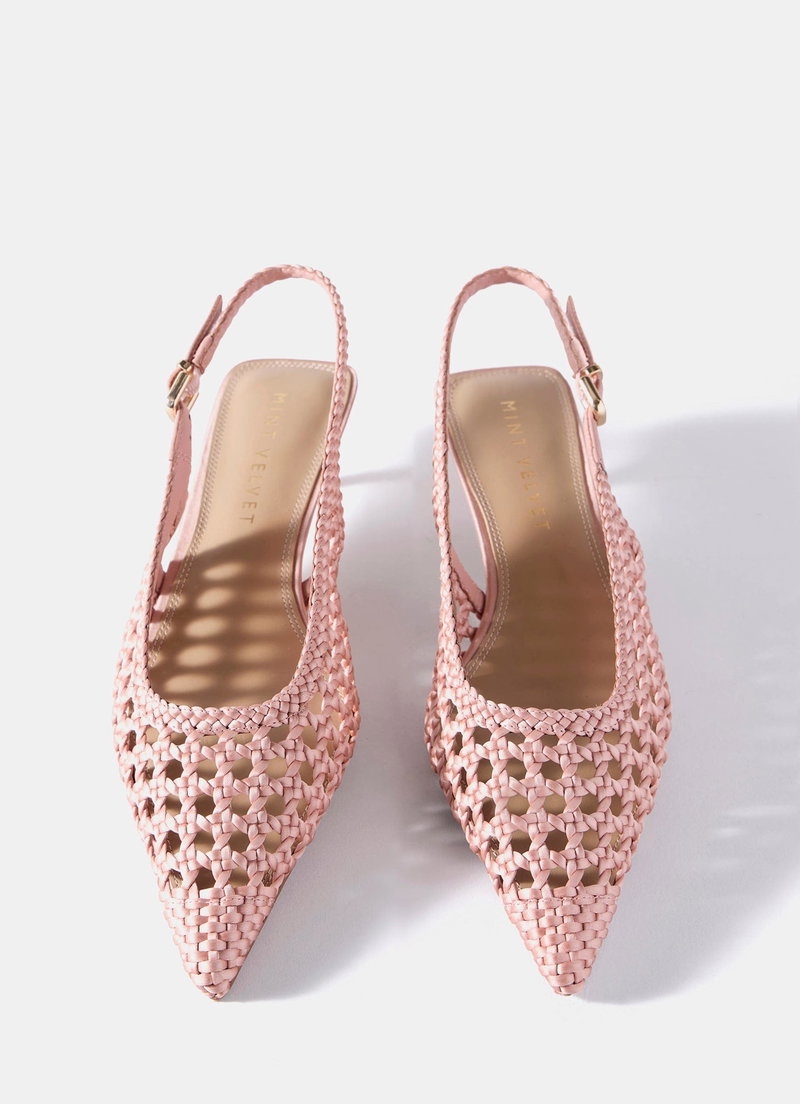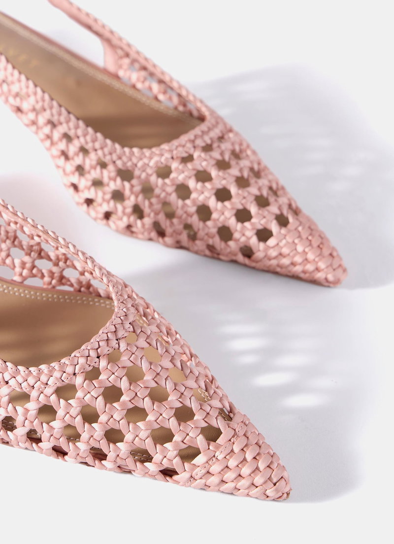 Pink woven detail shoe featuring a pointed toe, kitten heel, sling back strap with a gold-tone buckle fastening through the side.