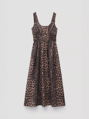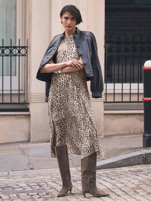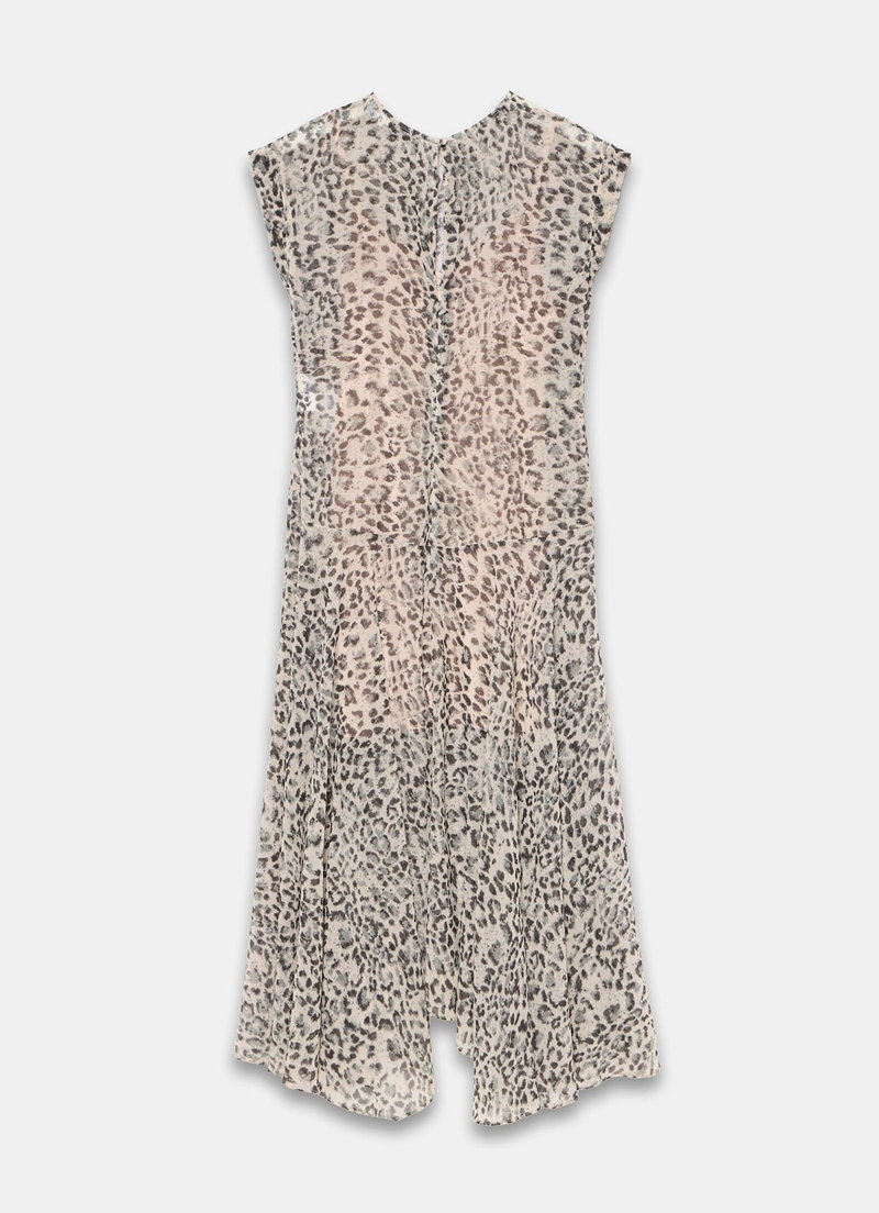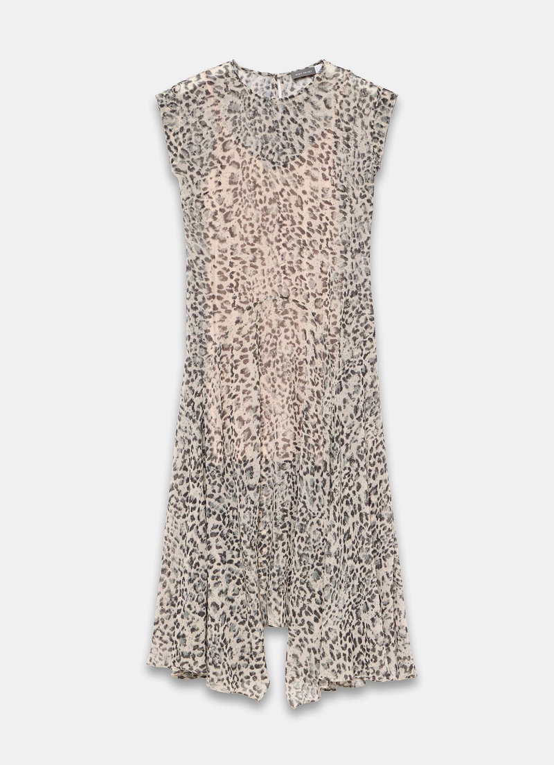 Leopard print dress in a midi silhouette featuring a crew neckline, cap sleeves, handkerchief hemline with a zip and button fastening through the rear.