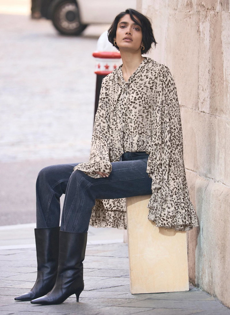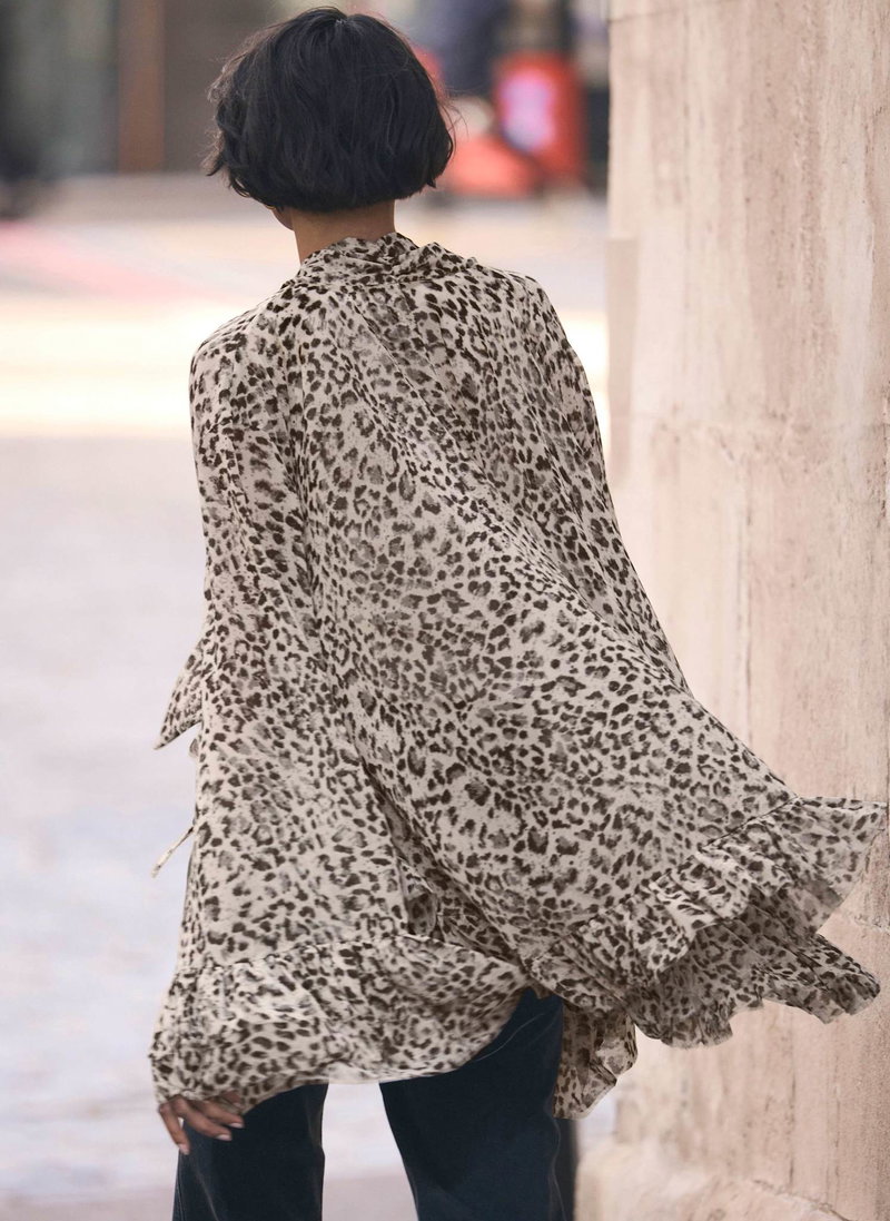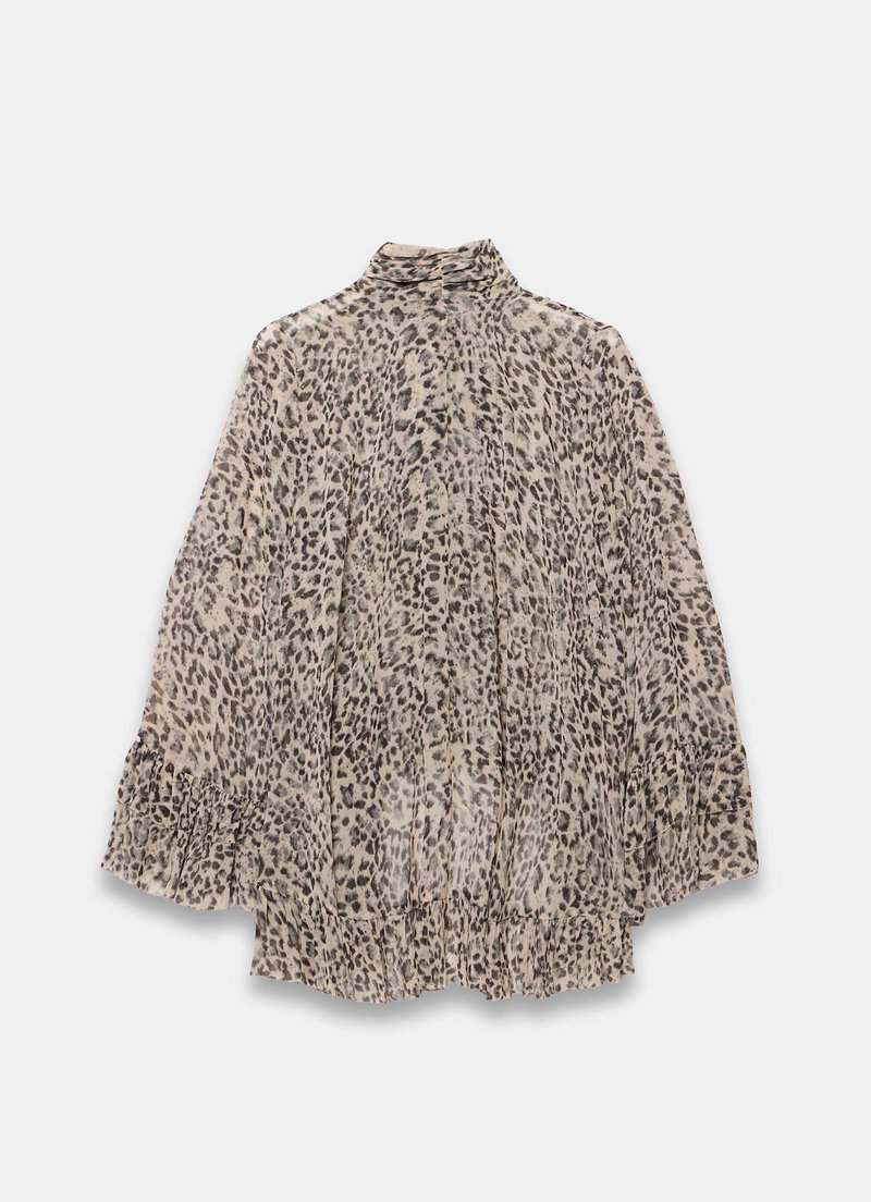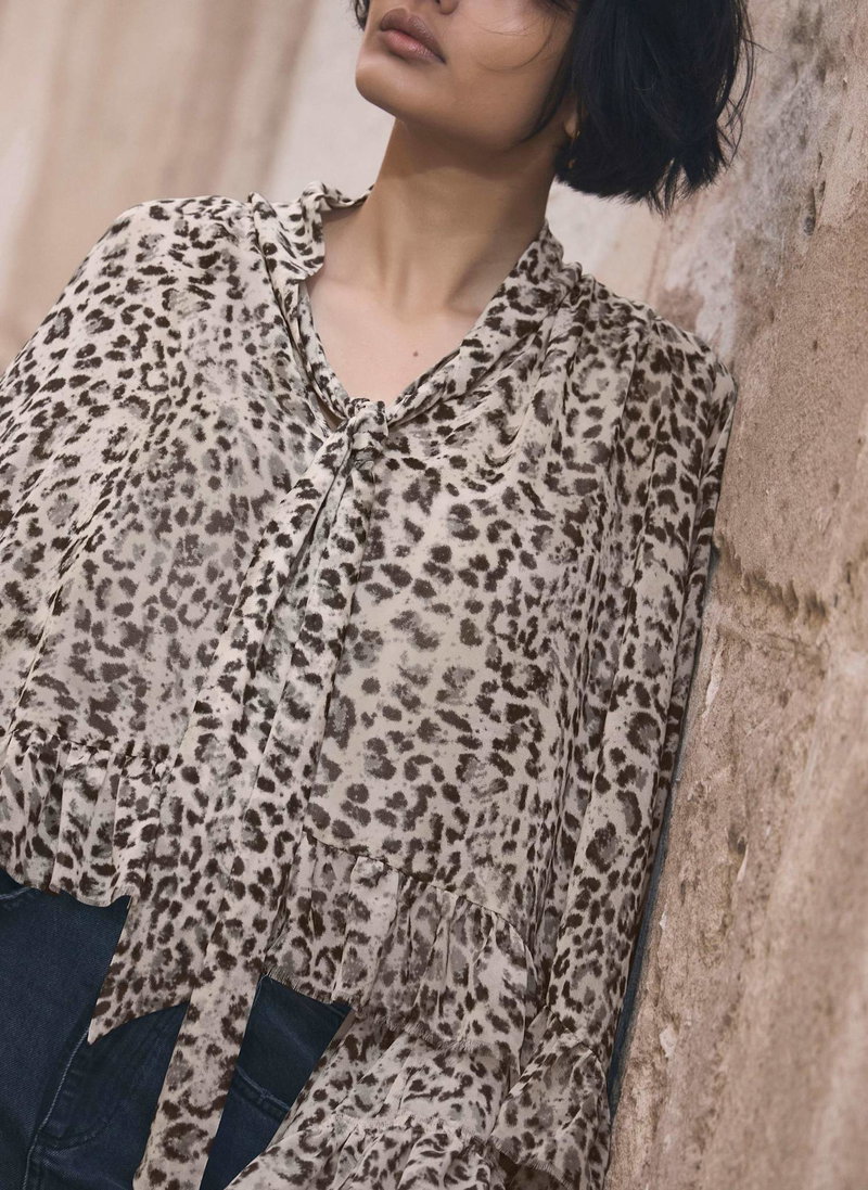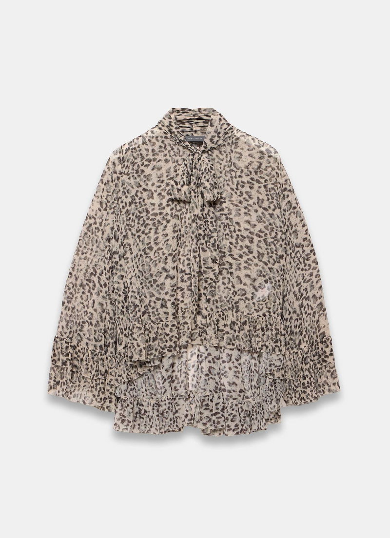 Neutral tone leopard print blouse featuring a high neckline, long sleeves, layered fluted cuffs, drop back ruffle hemline with a tie fastening through the front.