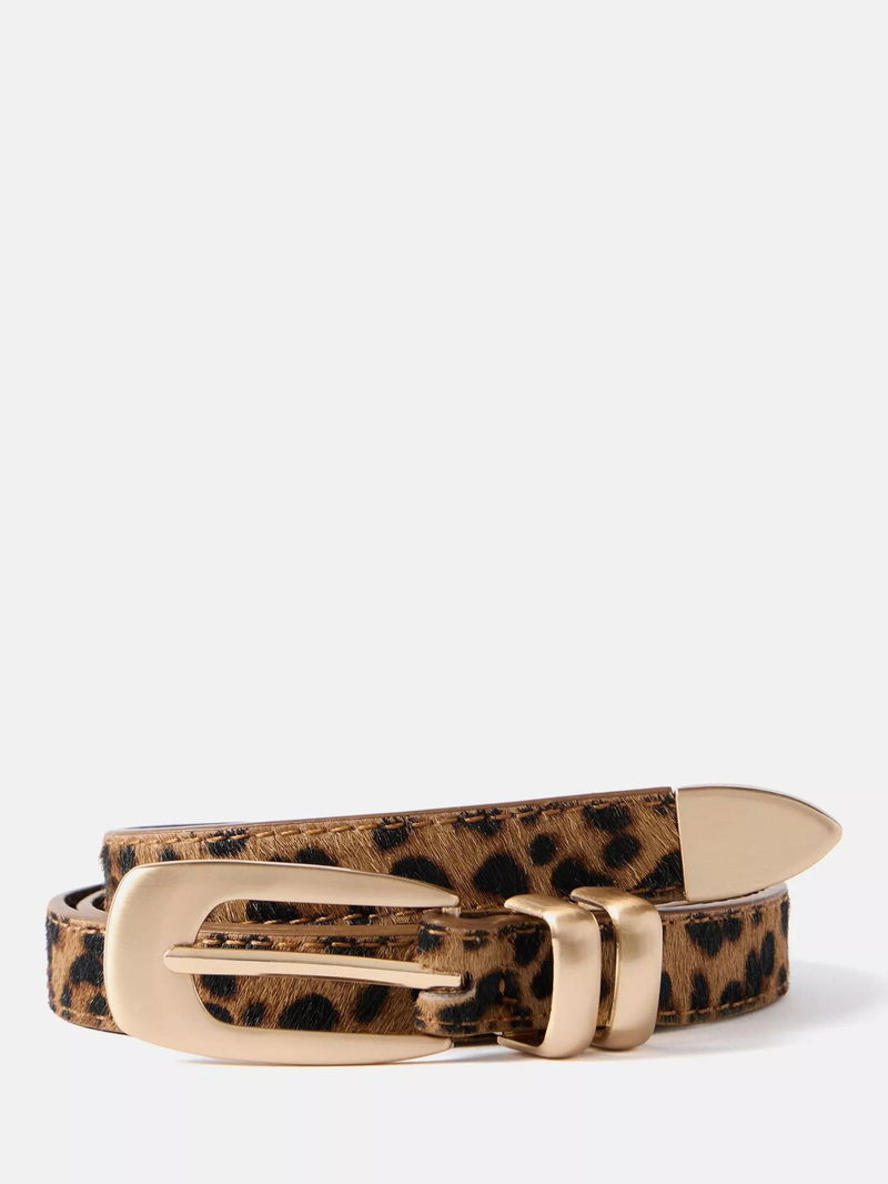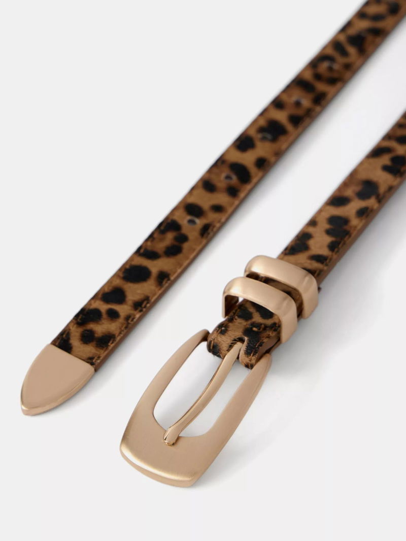 A leopard-textured thin belt with a metallic-tone buckle fastening.