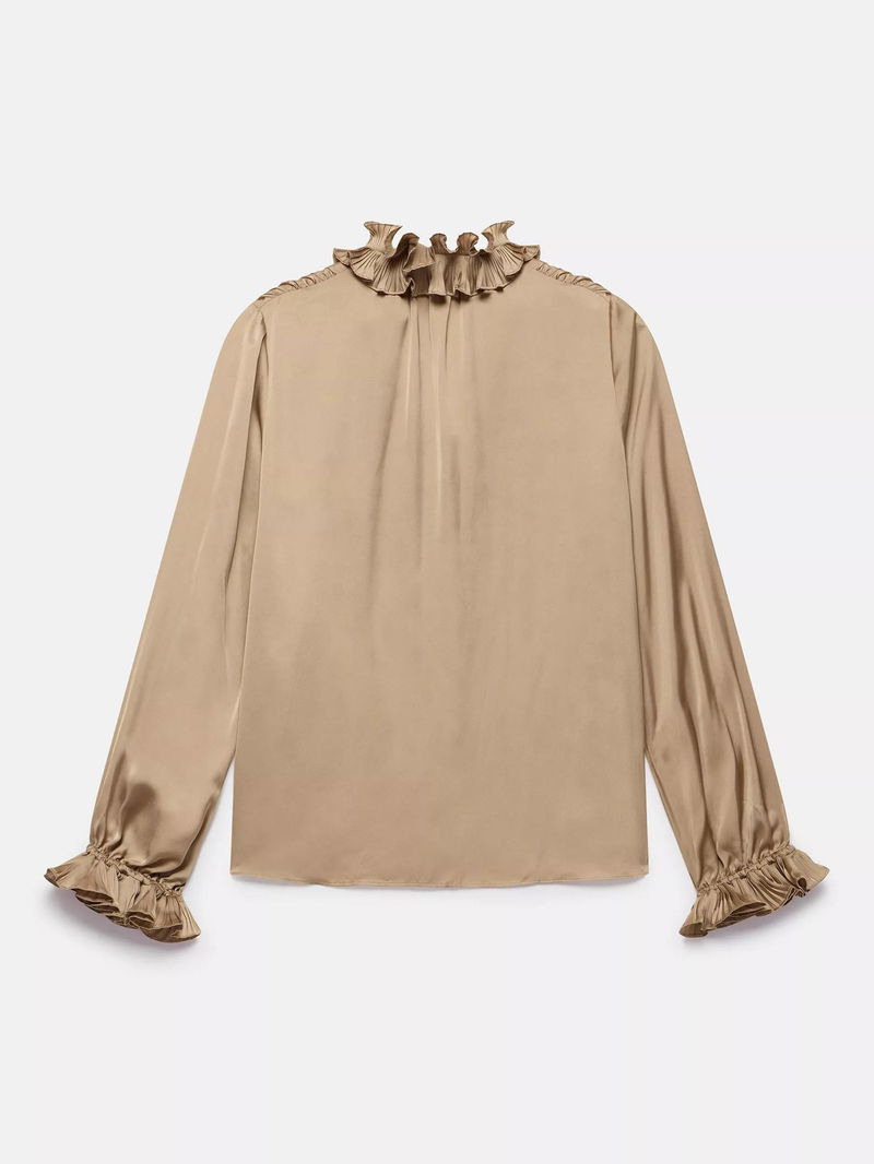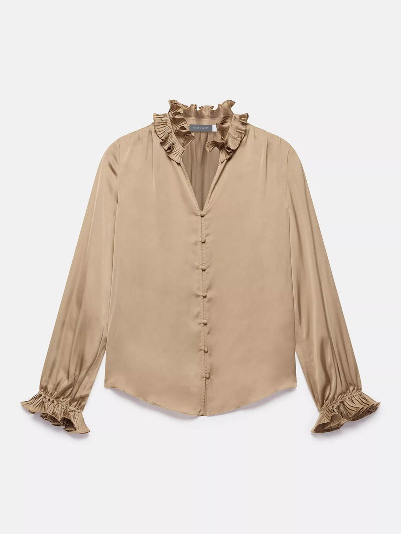 A blouse by Mint Velvet. With a ruffle trim V-neckline, long sleeves and fluted elasticated cuffs, this piece is finished with a scooped hemline and a button fastening through the front.