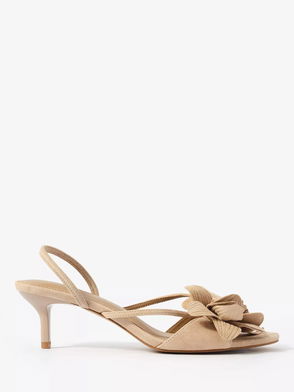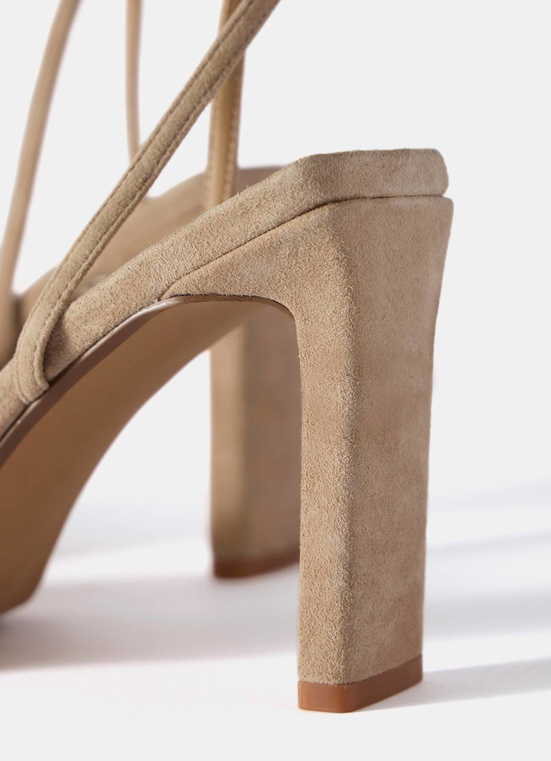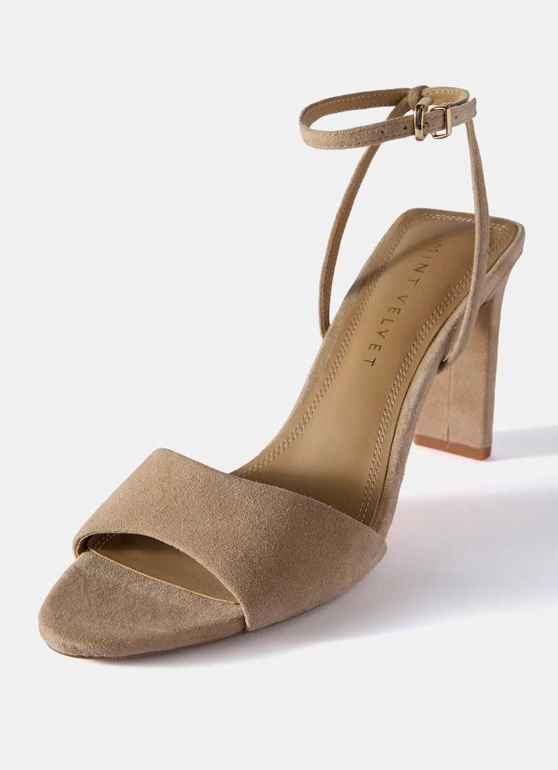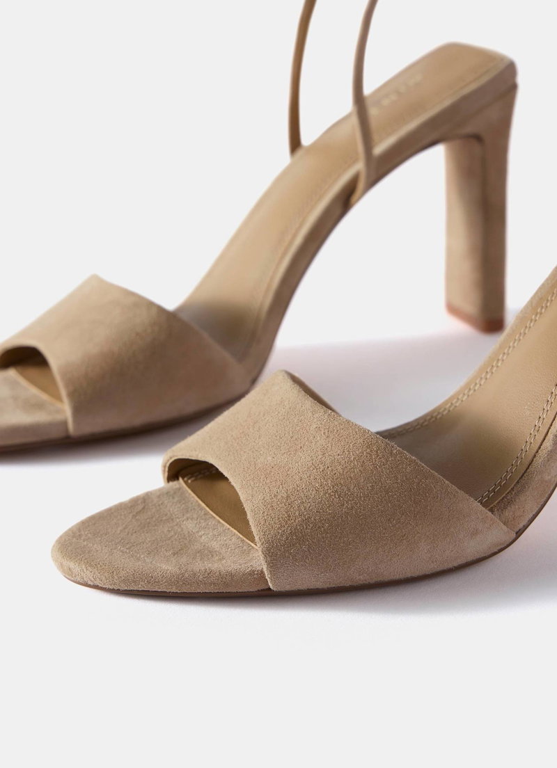 Neutral suede sandals featuring a high heel and thin ankle strap with buckle fastening through the side.