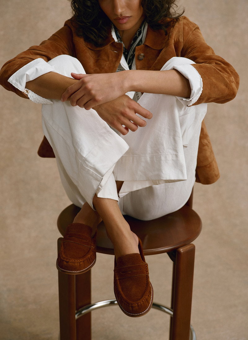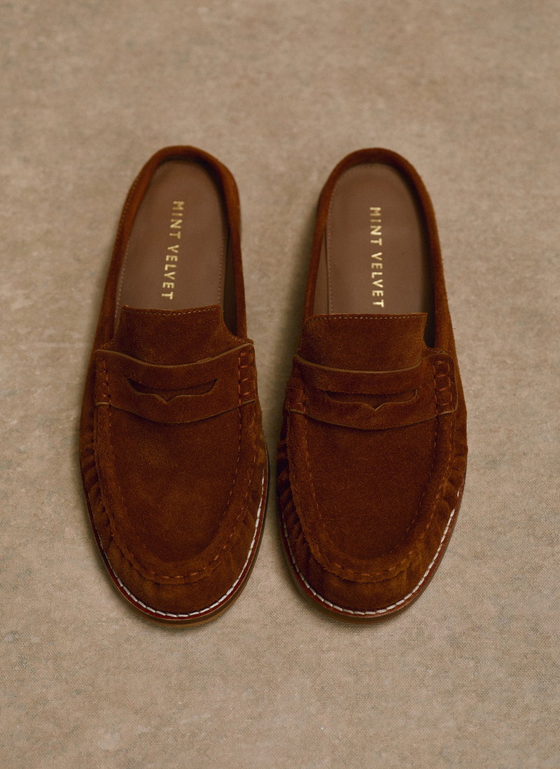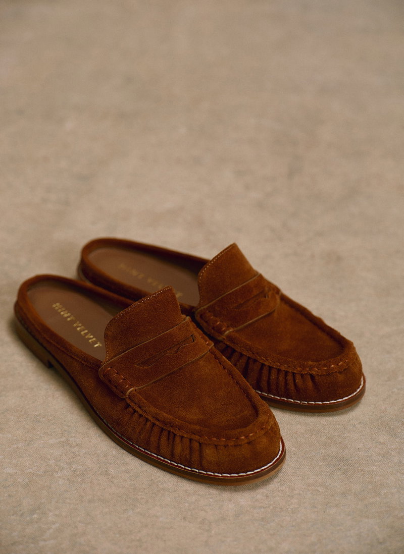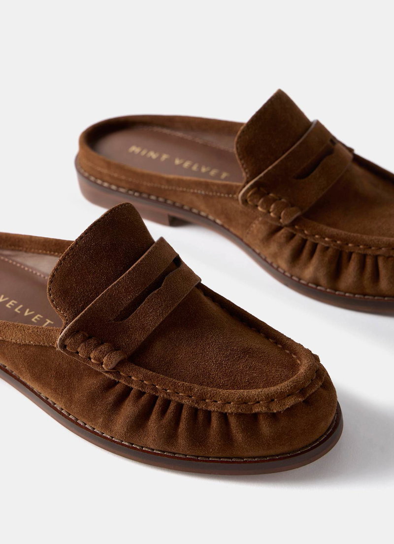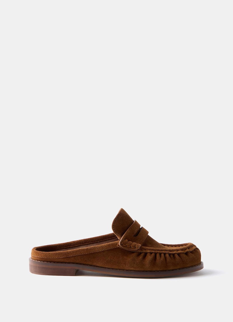 Tan suede backless loafers featuring a round toe, gathered stitching and flat sole.