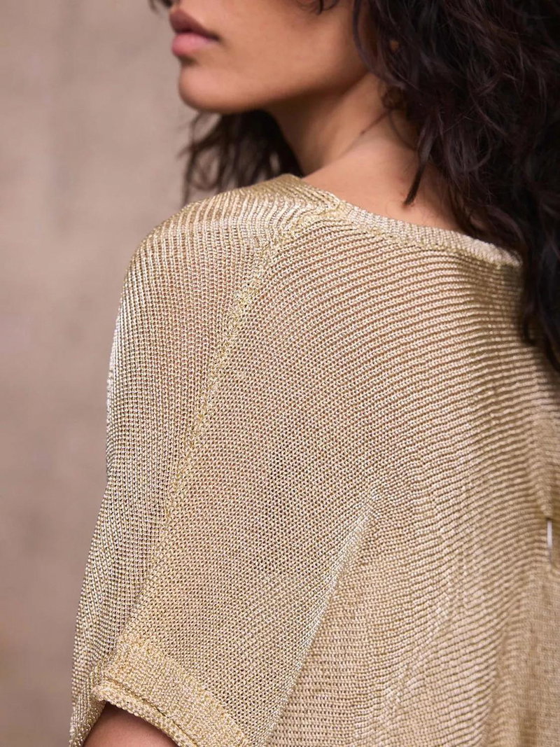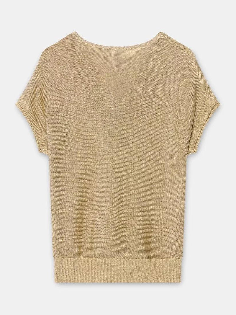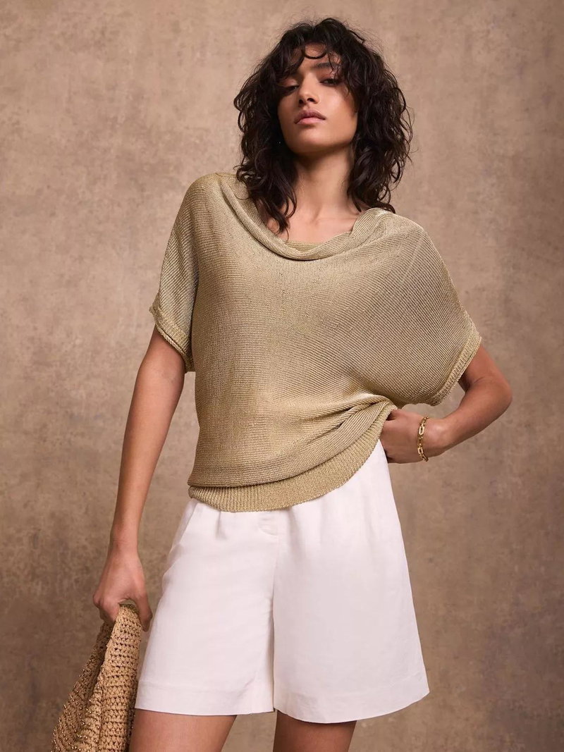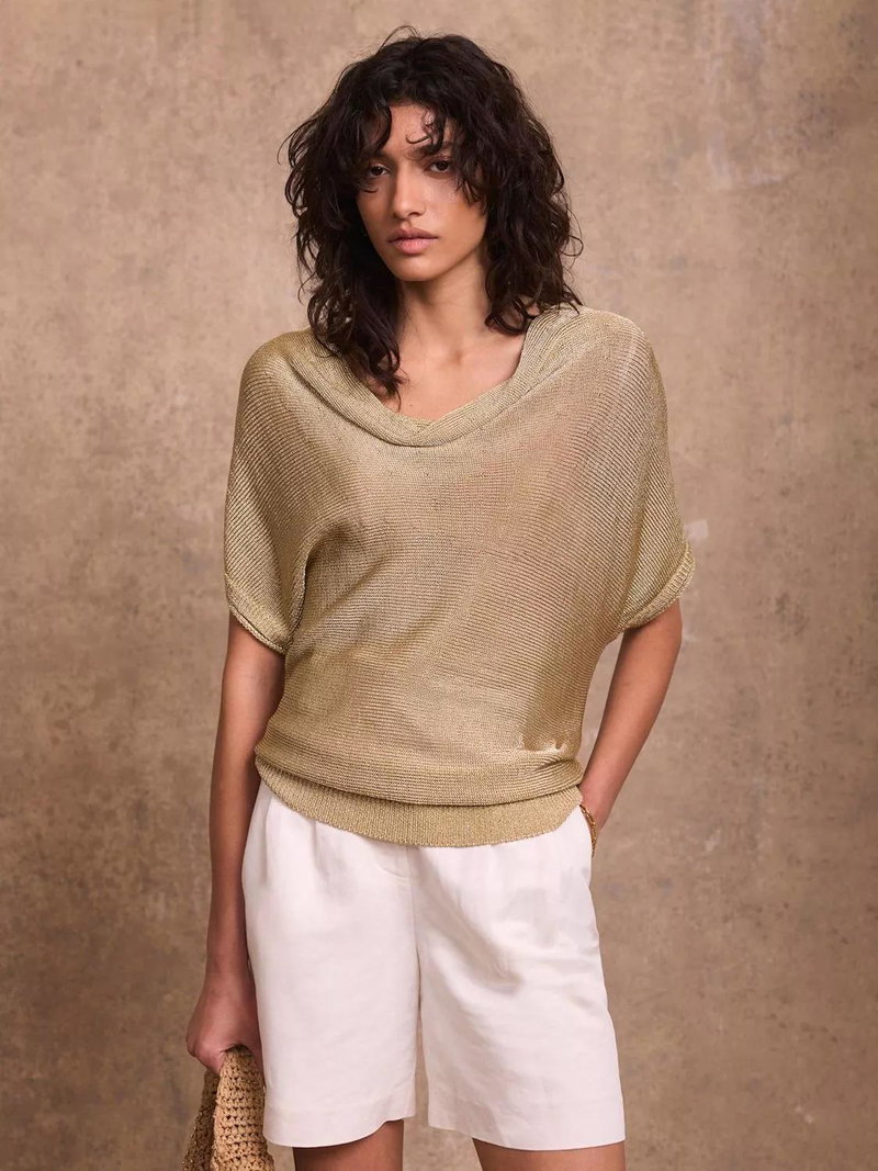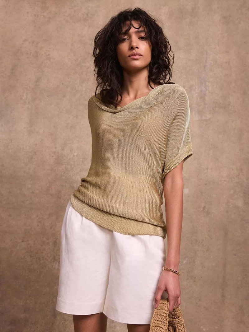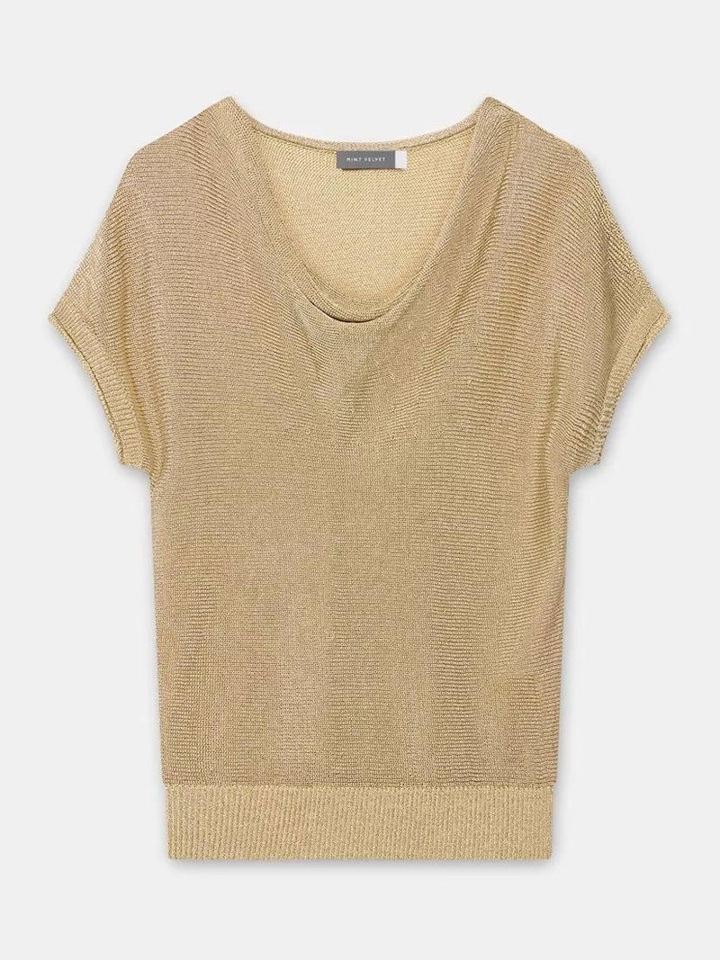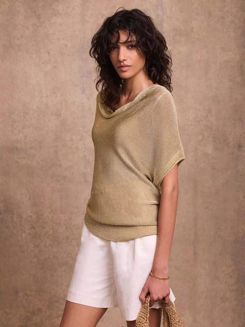 A metallic top featuring a cowl neckline, short sleeves and a ribbed waistline.