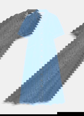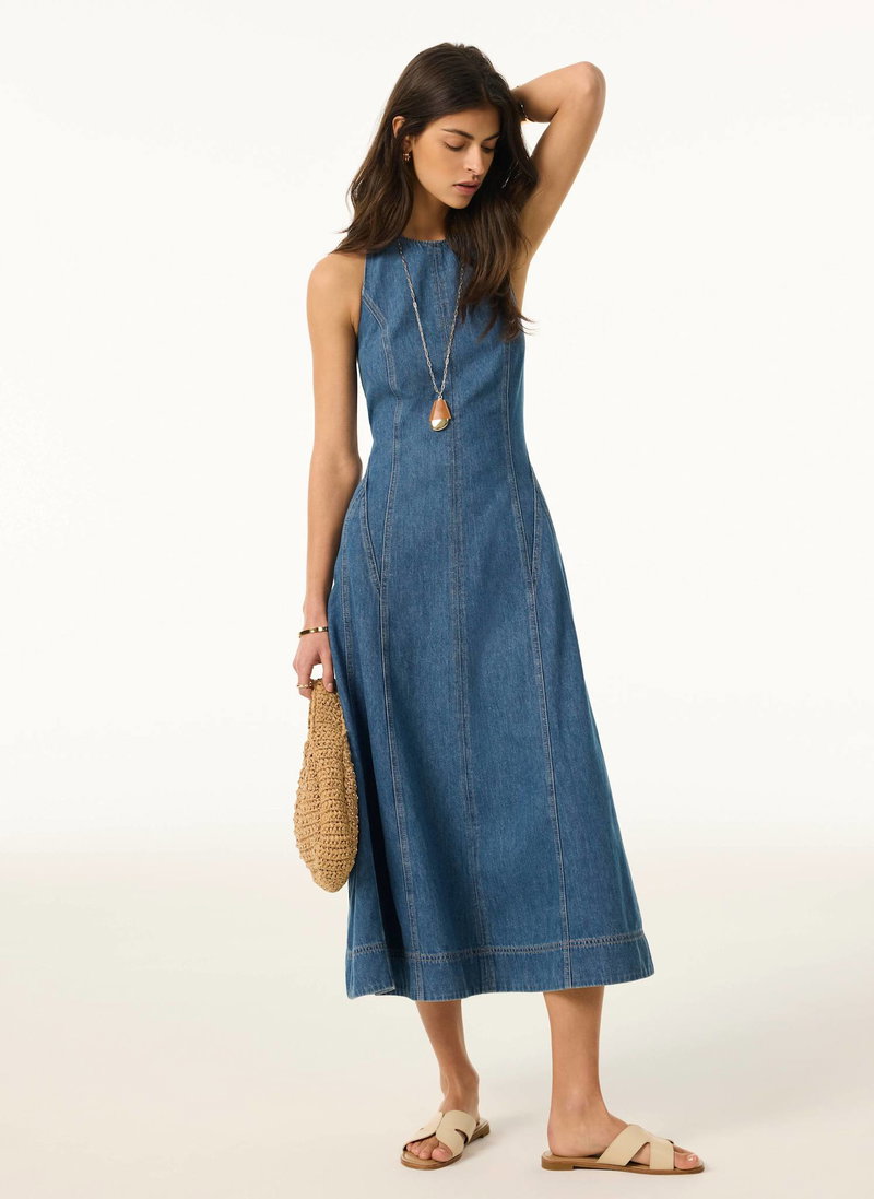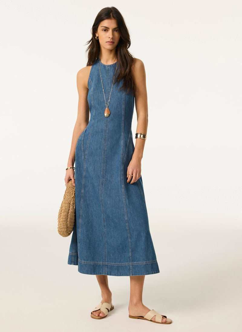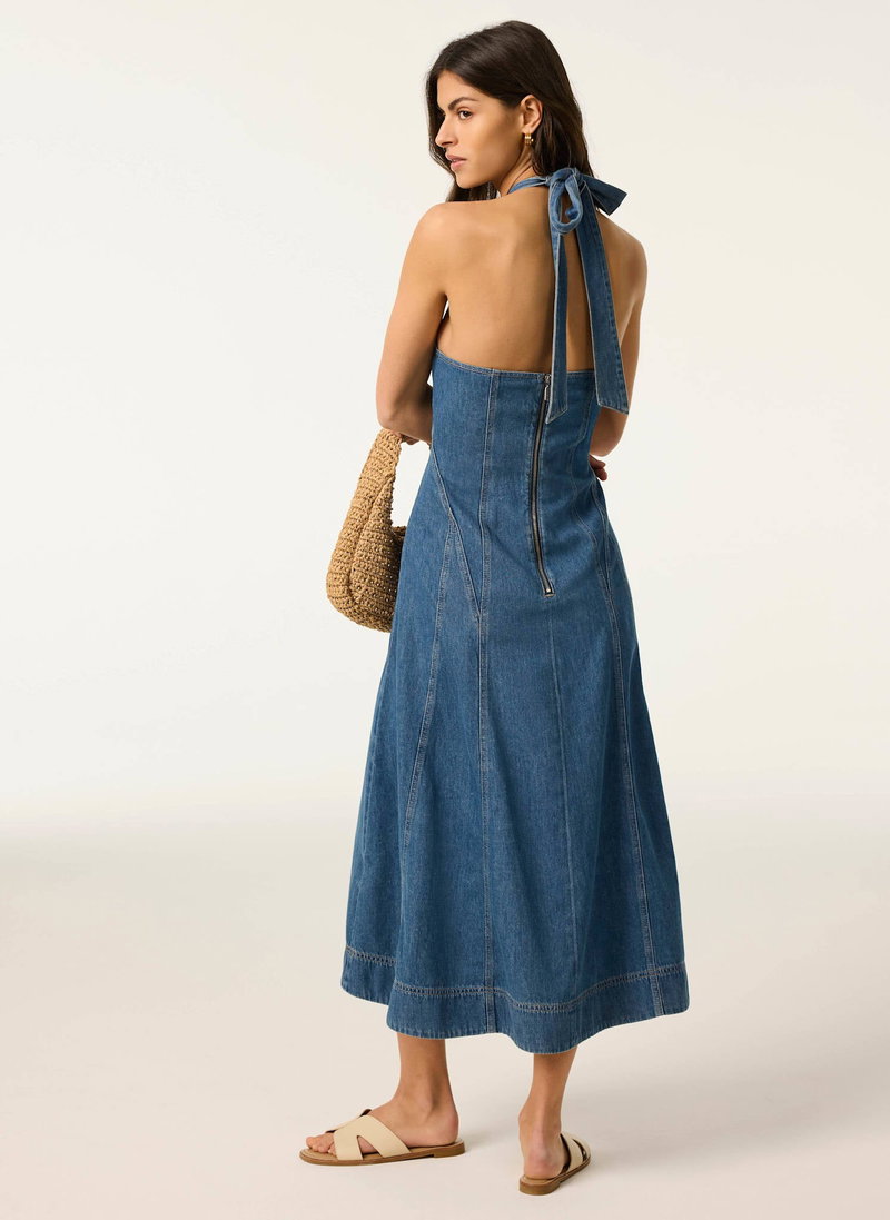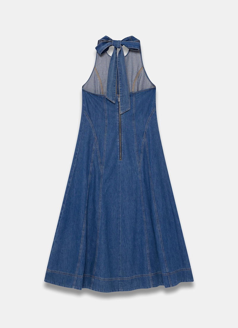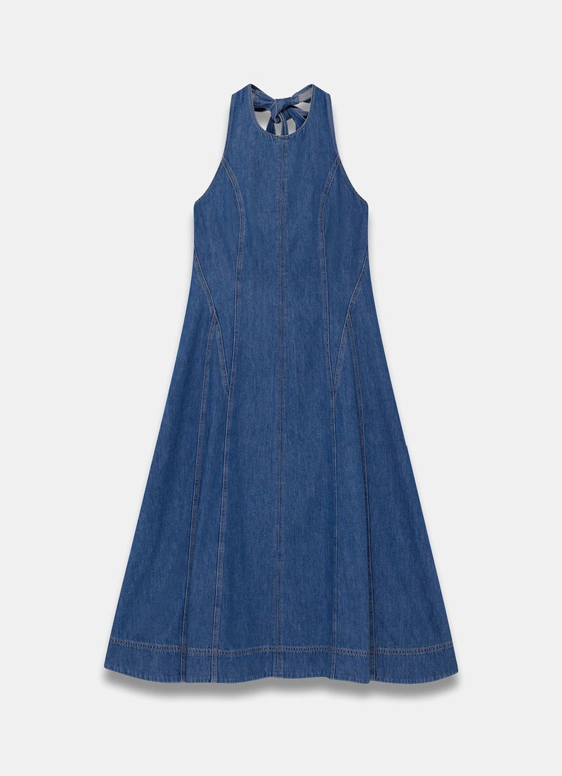 Mid indigo denim A-line dress in a midi silhouette featuring a halter neckline, seam detailing, tie fastening through the neck with a zip fastening through the back.