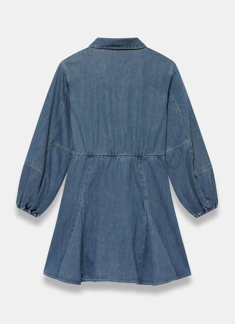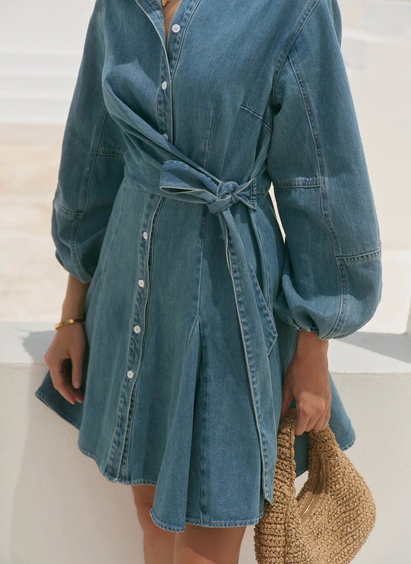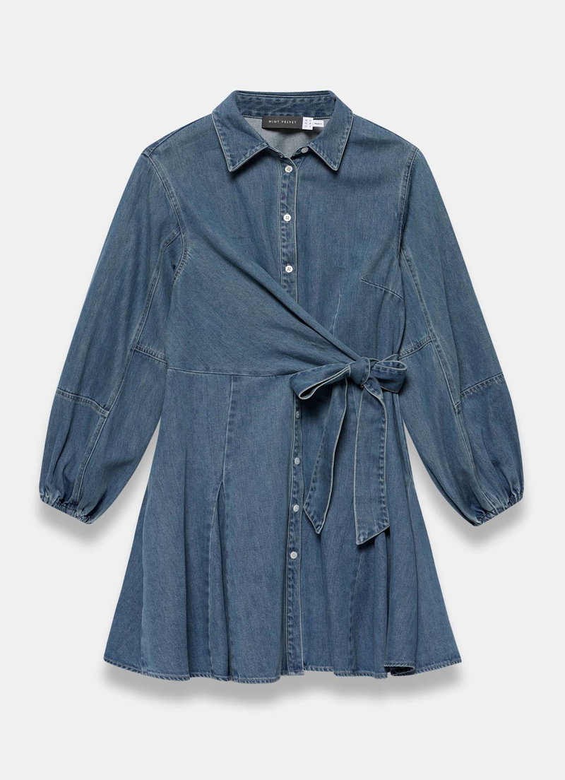 Mid indigo denim shirt dress in a mini silhouette featuring a classic collar, long blouson sleeves, elasticated cuffs, wrap tie feature at the waistband, godet hemline and a button fastening through the front.