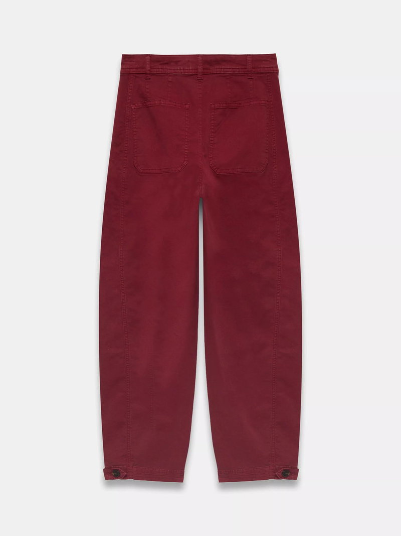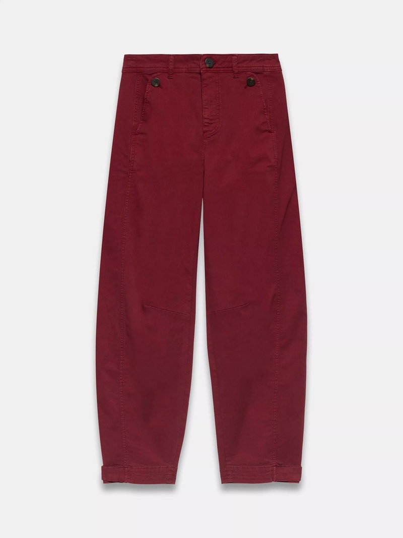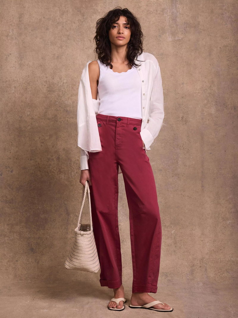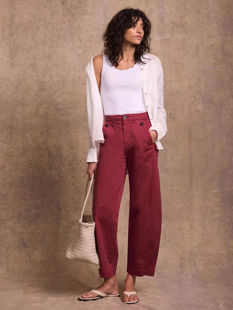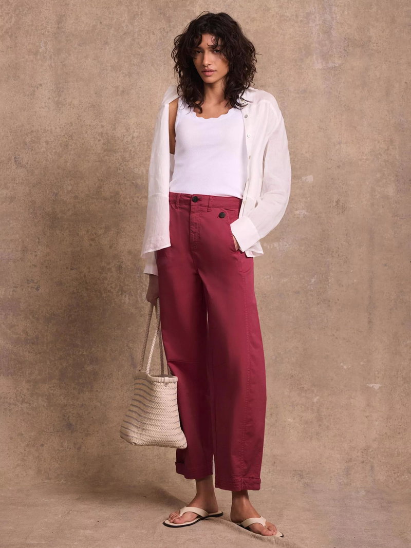 A pair of mid-rise barrel-leg chinos from Mint Velvet with a cotton blended base, designed for ease and versatility. Finished in a soft stretch fabric with button-detail pockets and a relaxed ankle-grazer length.