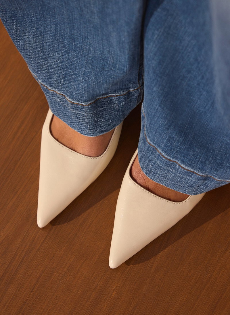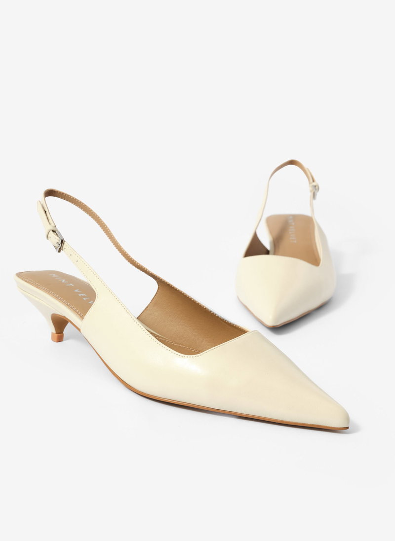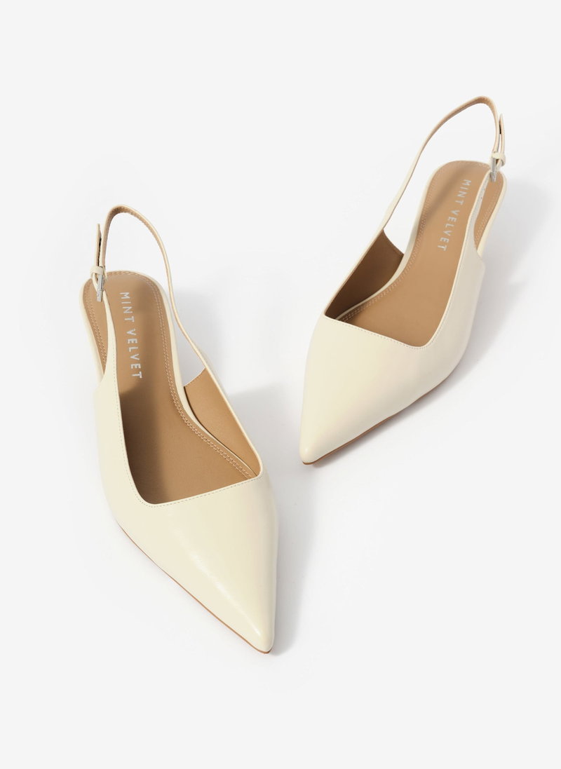 Cream leather low kitten heels featuring a pointed toe and slingback buckle fastening.