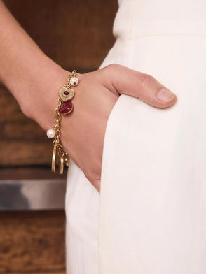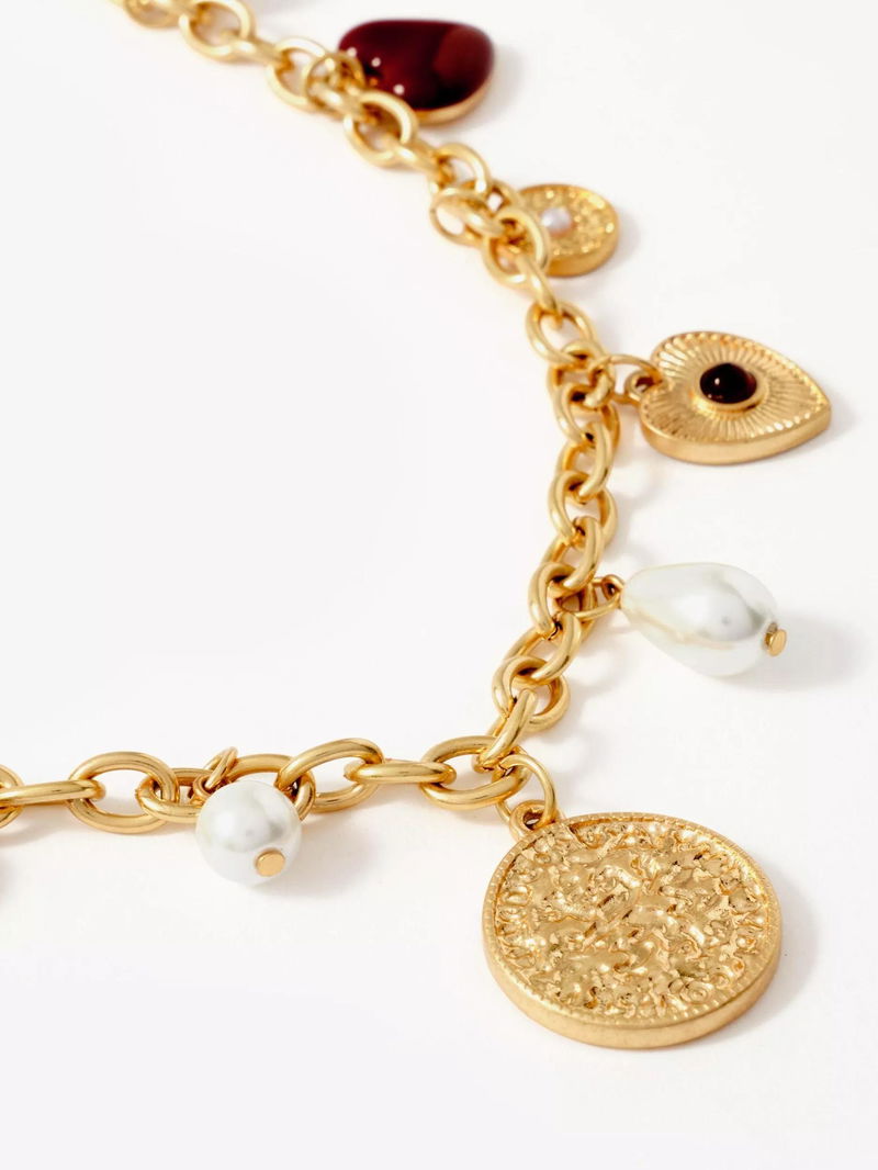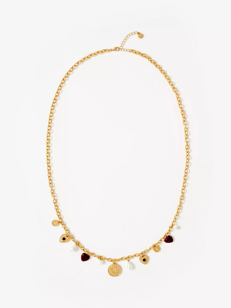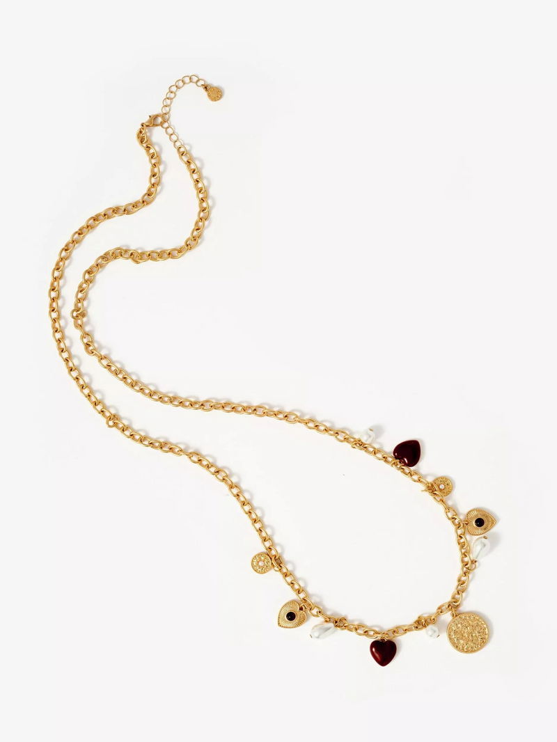 This elegant gold-tone necklace features a curated selection of heart and coin charms along a long-line chain. Complete with an adjustable lobster clasp fastening, it allows for a bespoke fit.