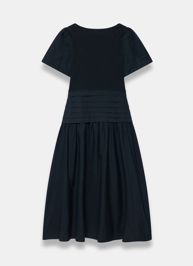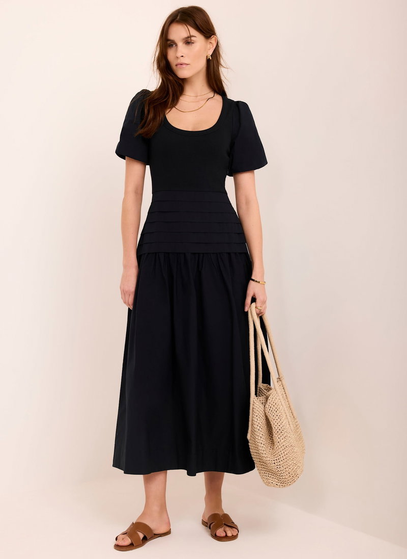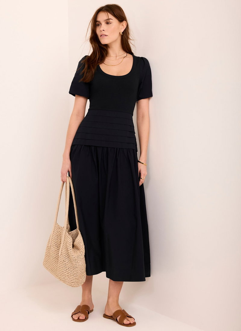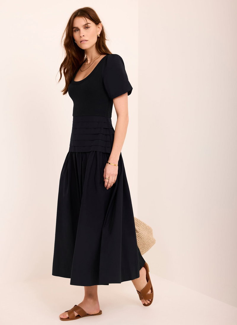 Navy tone dress in a maxi silhouette featuring a scoop neckline, short sleeves and pin tuck dropped waistband.