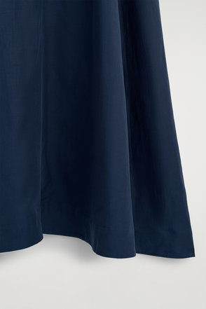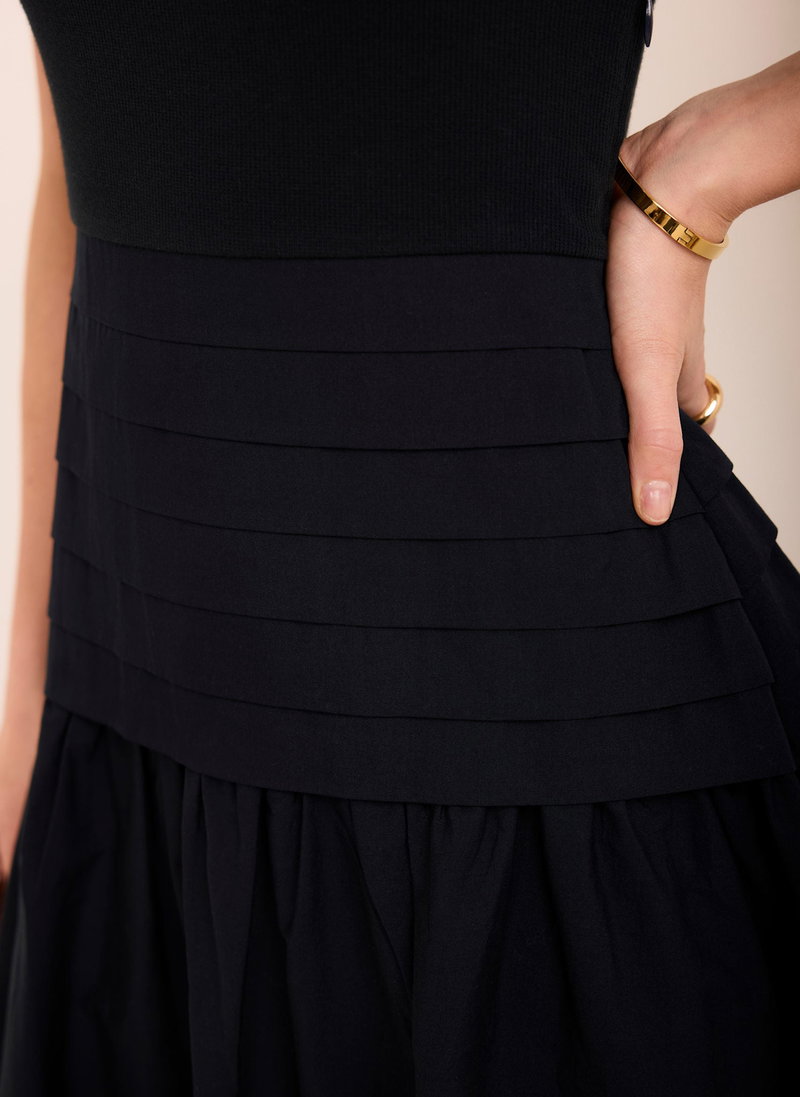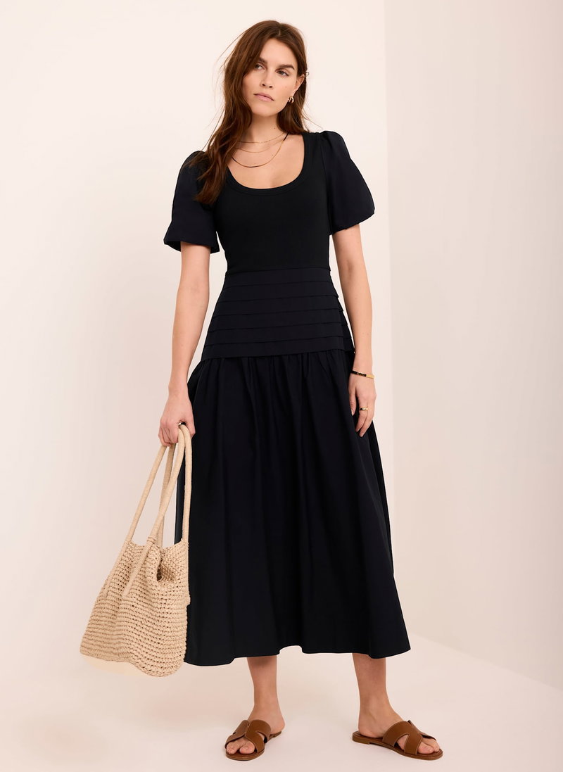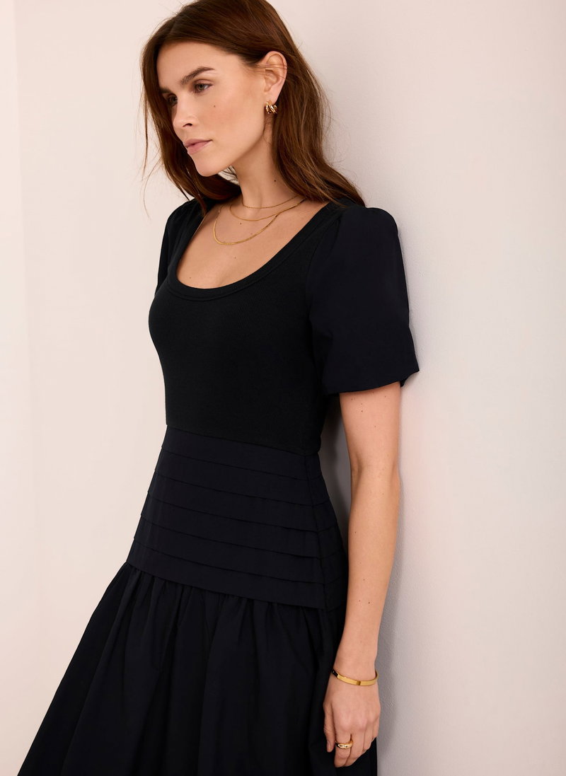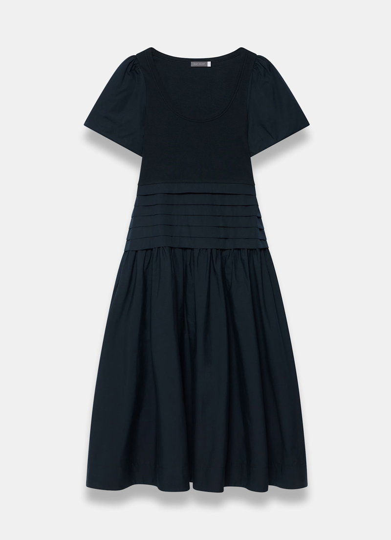 Navy tone dress in a maxi silhouette featuring a scoop neckline, short sleeves and pin tuck dropped waistband.