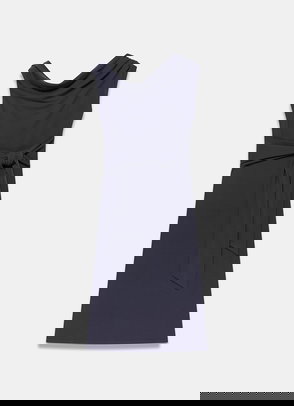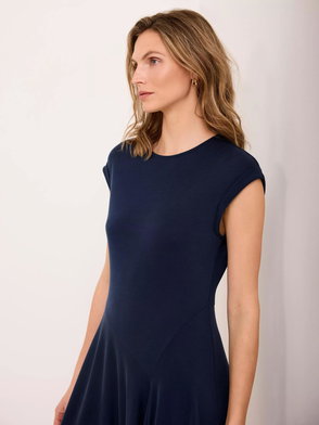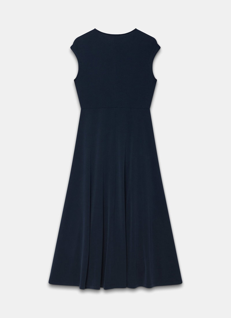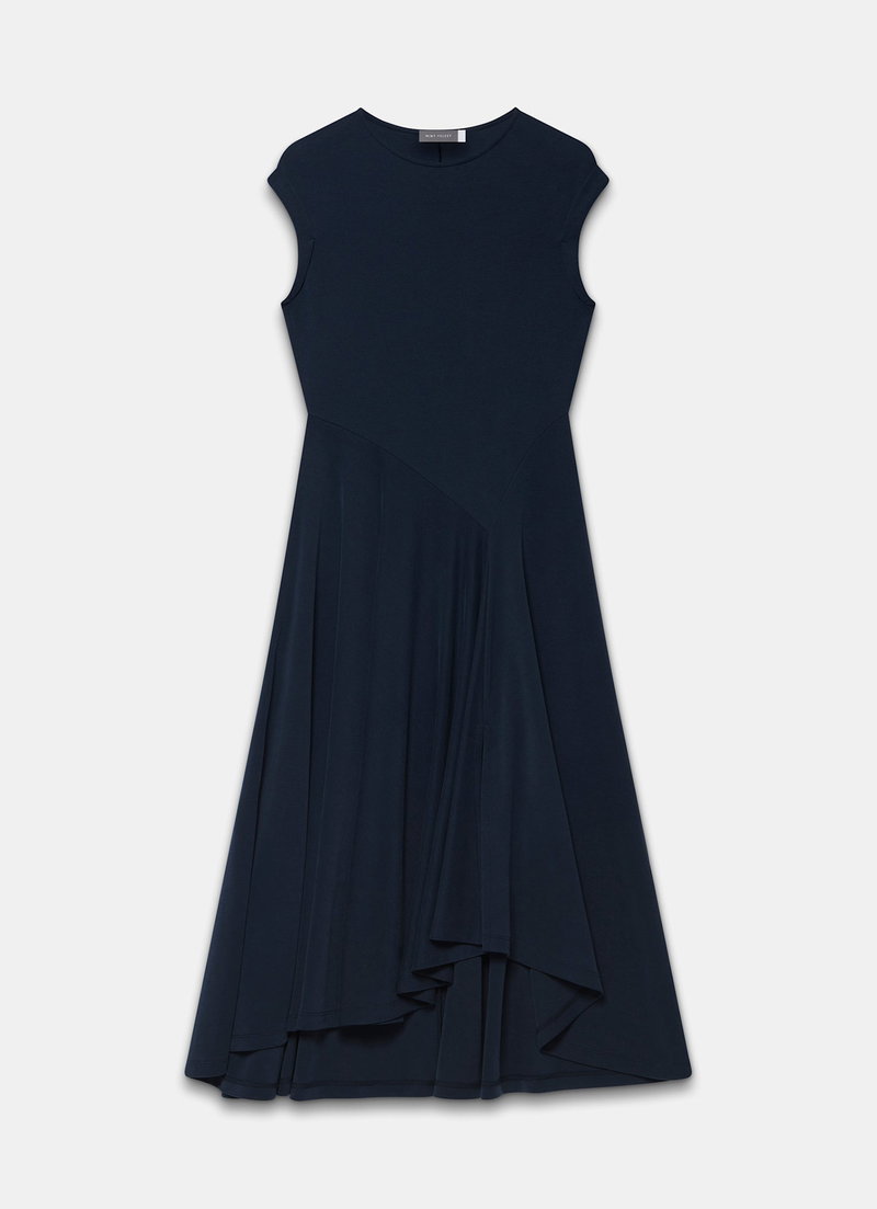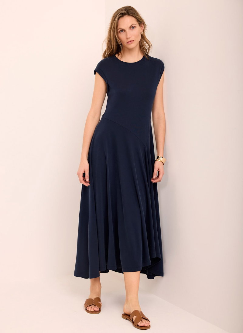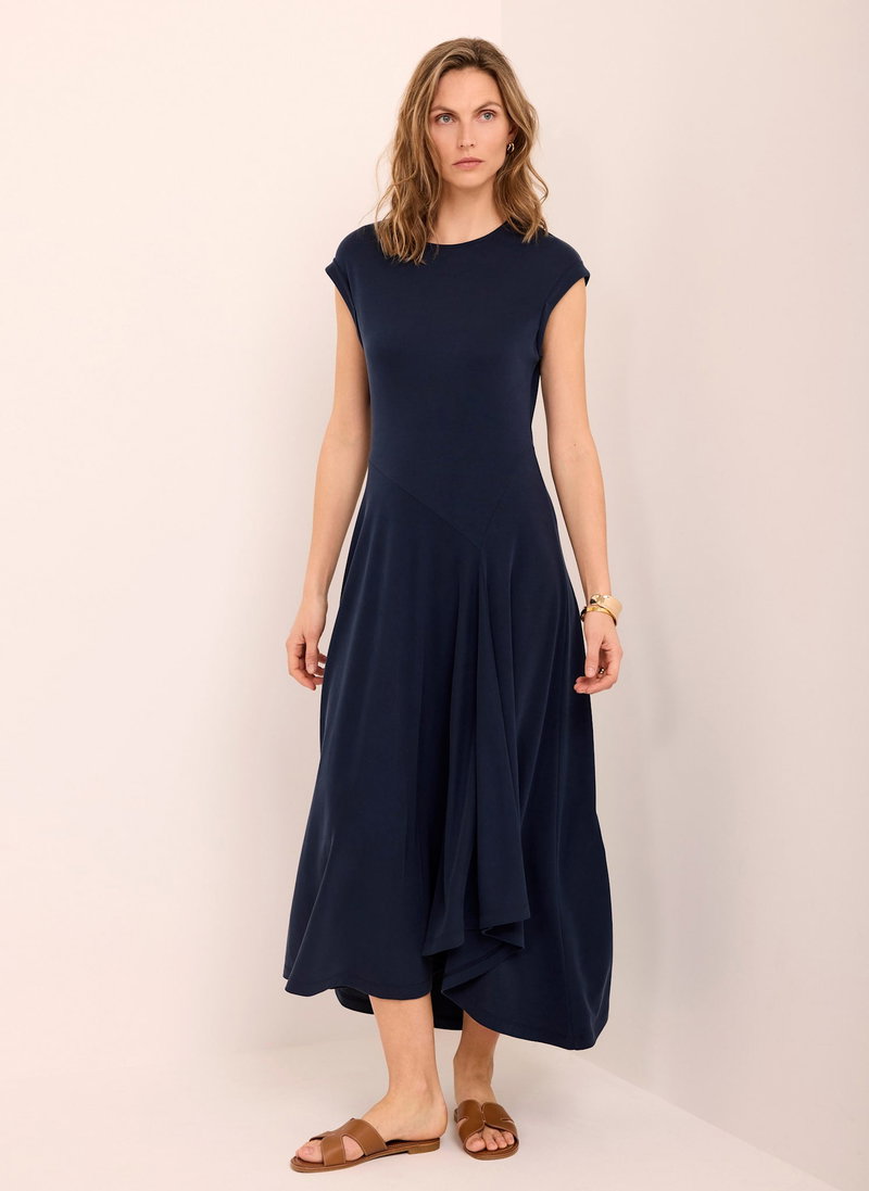 Navy dress in a midi silhouette featuring a crew neckline, cap sleeves, asymmetric waistline with a waterfall hemline.