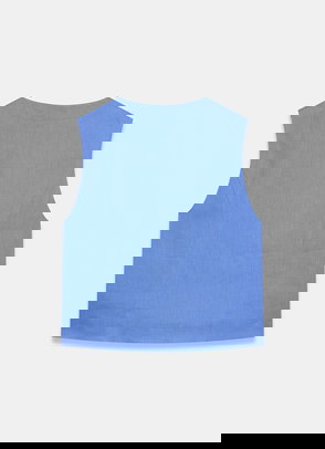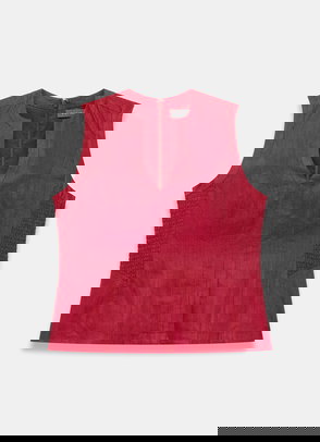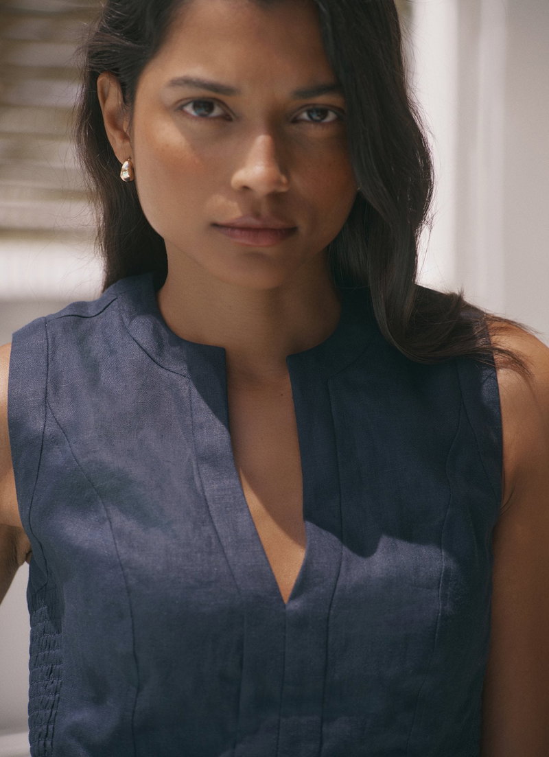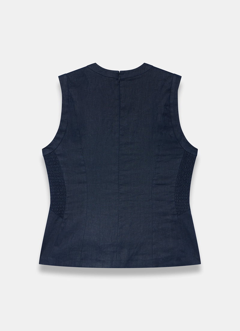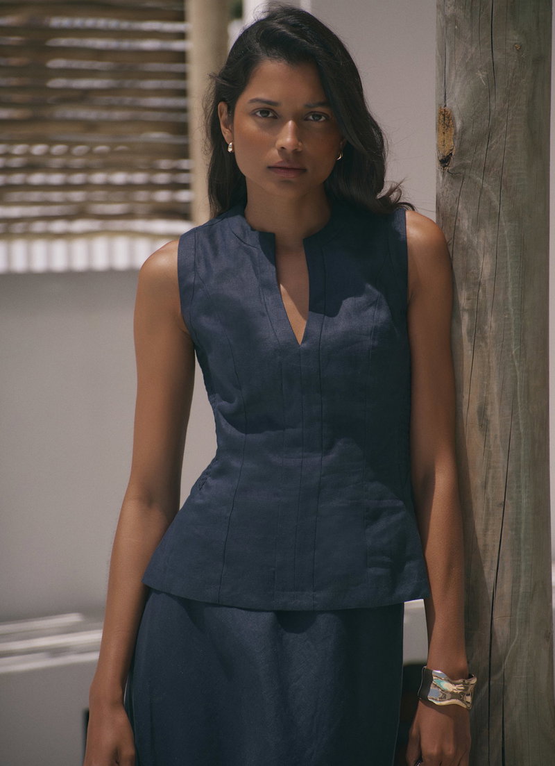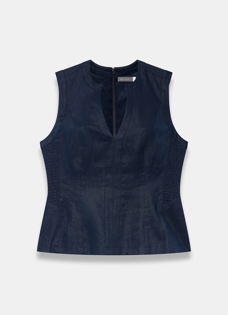 • Navy sleeveless top featuring a V-neckline, cinched waist, shirred sides with a zip fastening through the back.