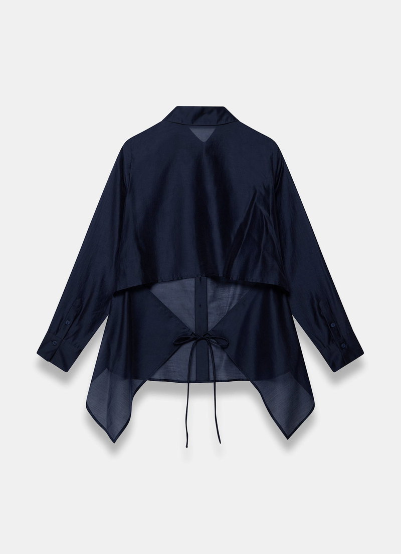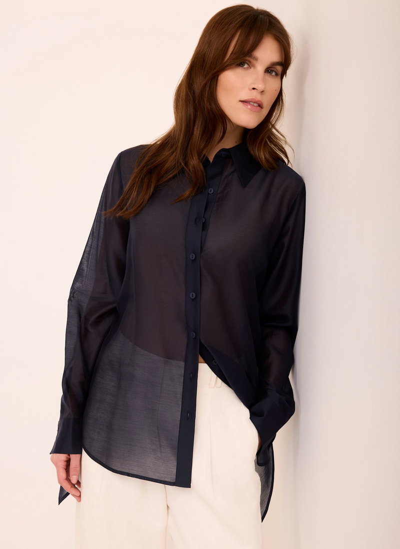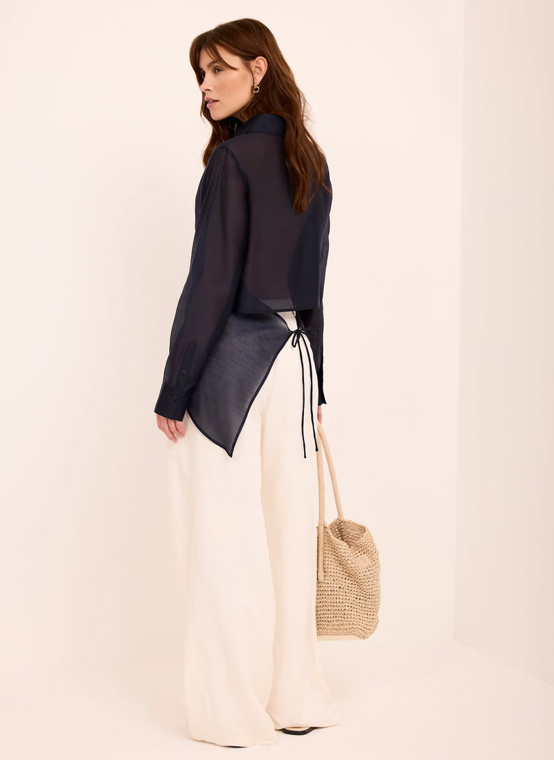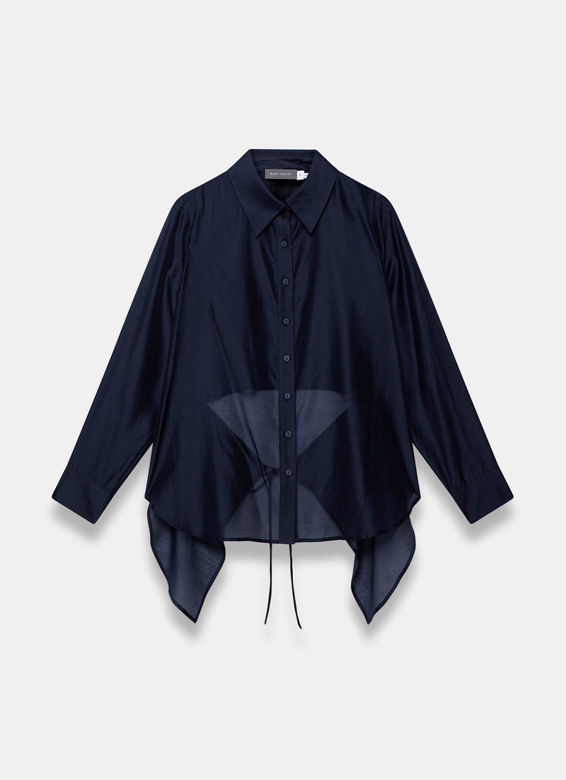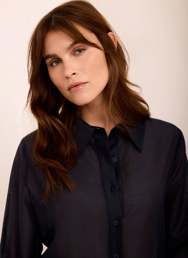 Navy sheer shirt in a longline silhouette featuring a classic collar, long sleeves, buttoned cuffs, cut-out back, tie detail with a button fastening through the front.