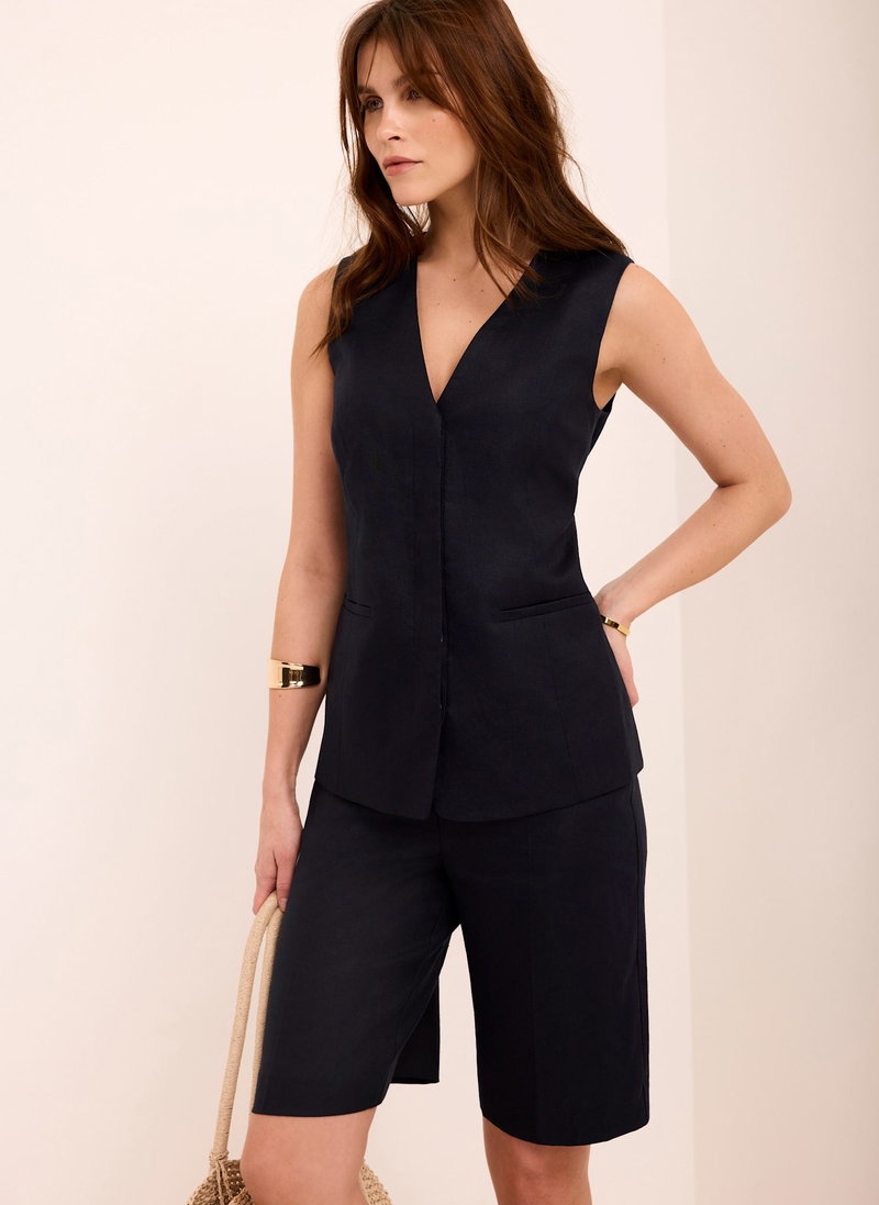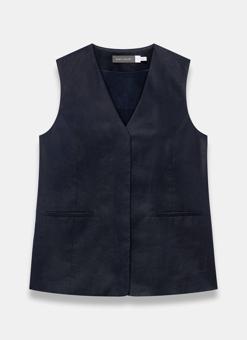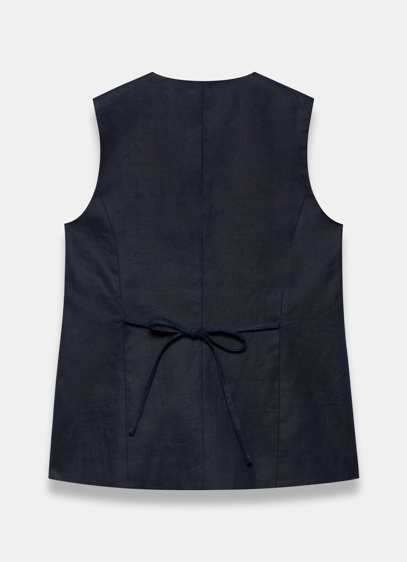 Navy longline waistcoat featuring a V-neckline, welt pockets with tie back fastening. Fully lined.