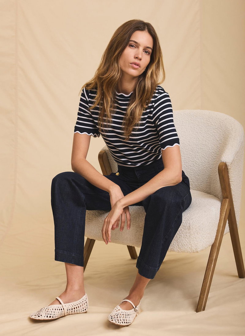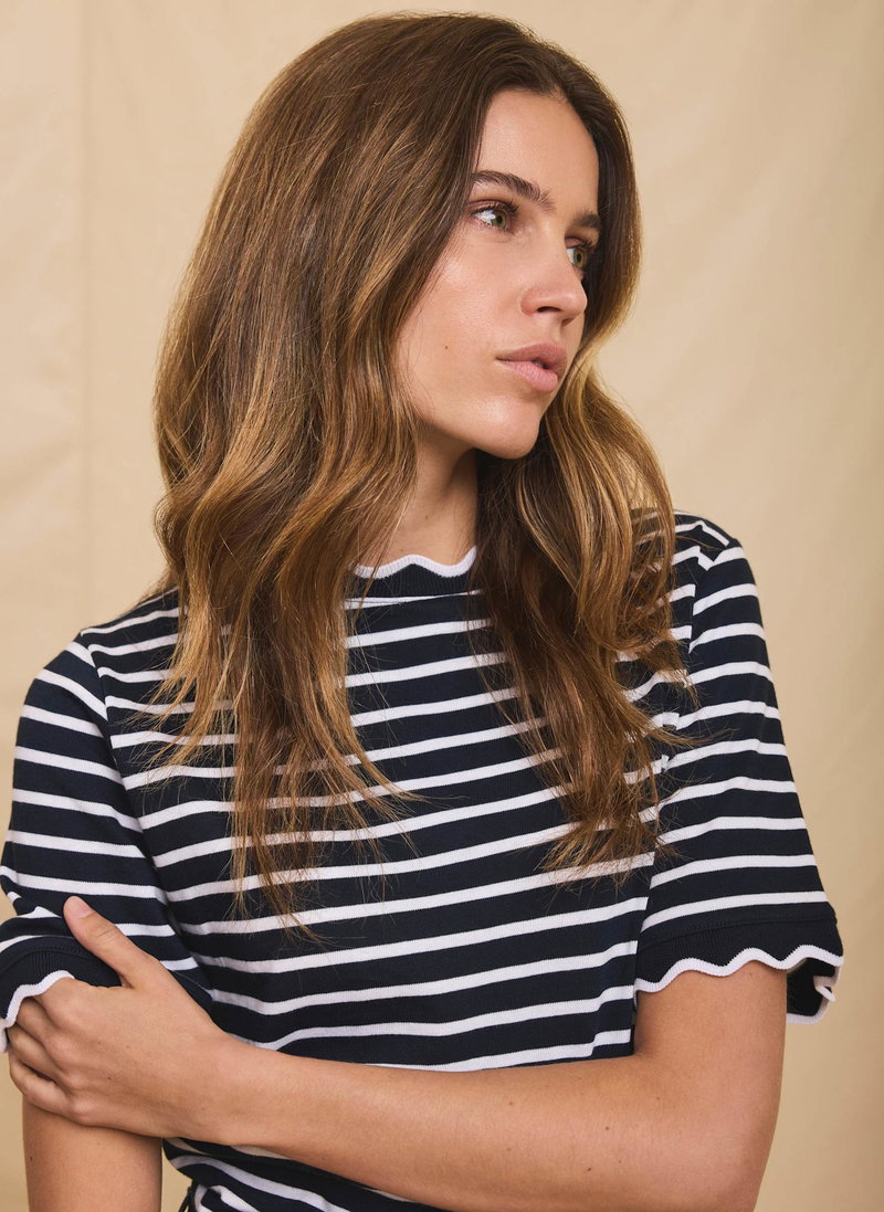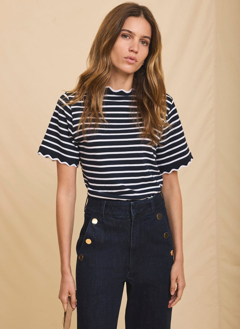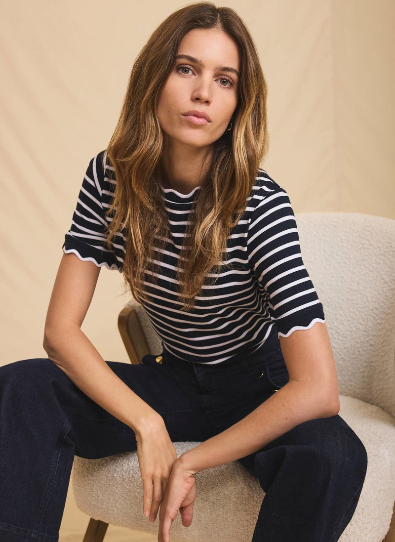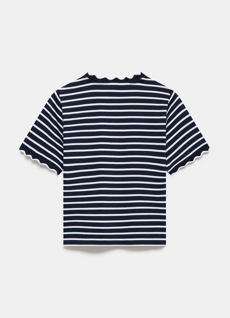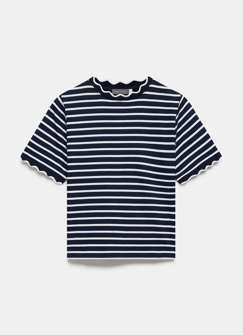 • Navy striped t-shirt featuring a crew neckline, short sleeves and scallop trim.