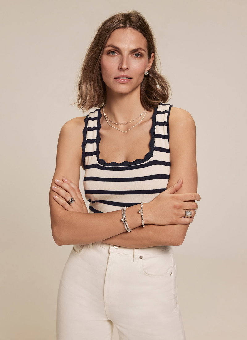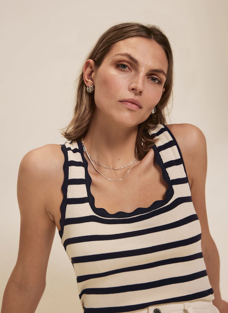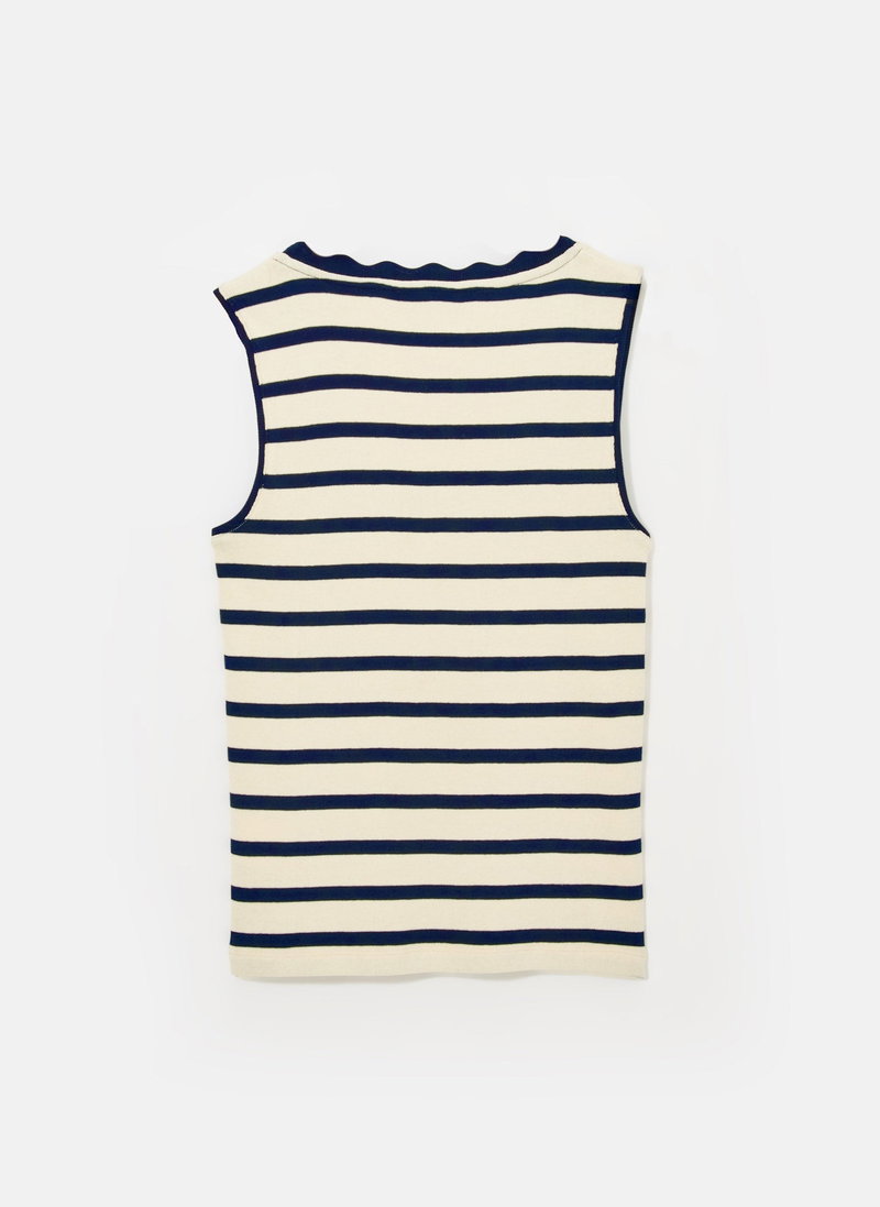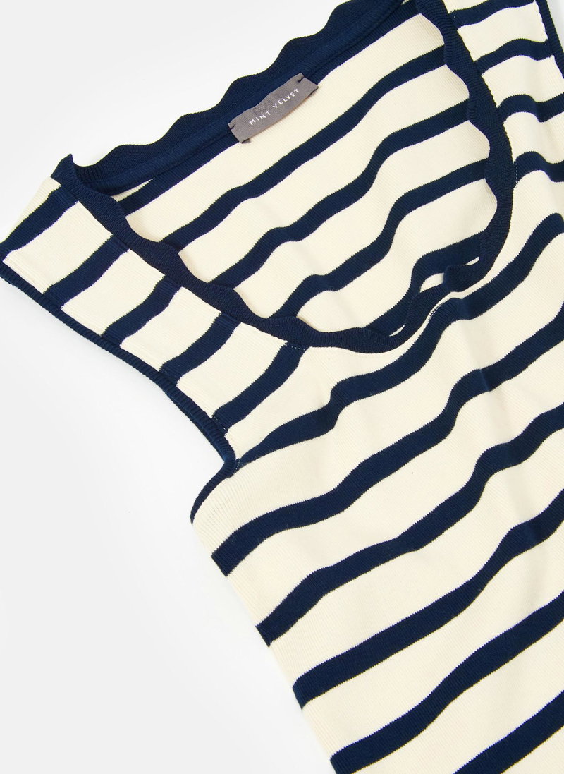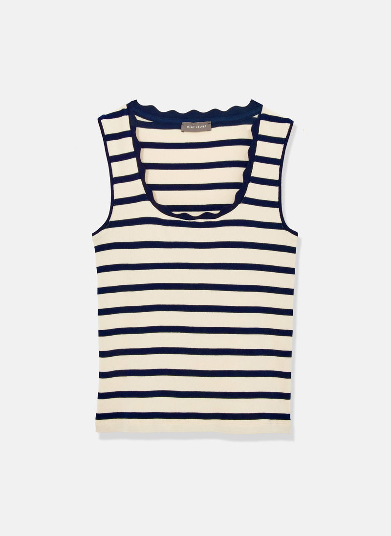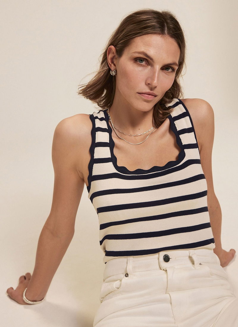 Navy striped top with a scallop trim scoop neckline.