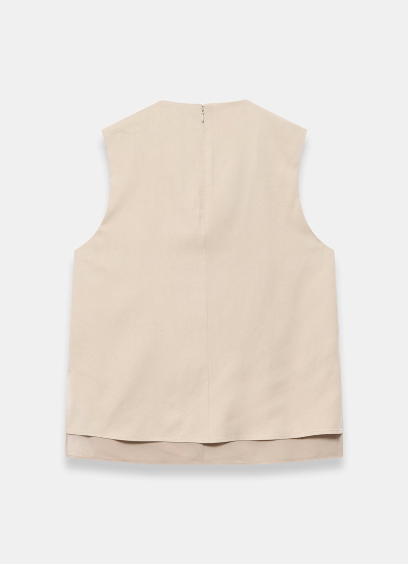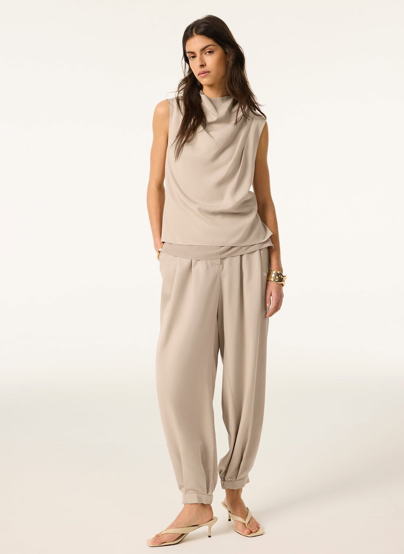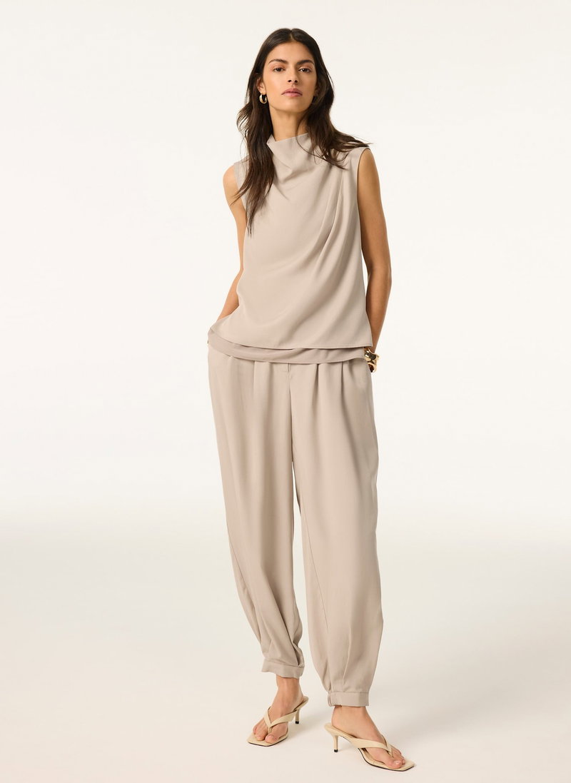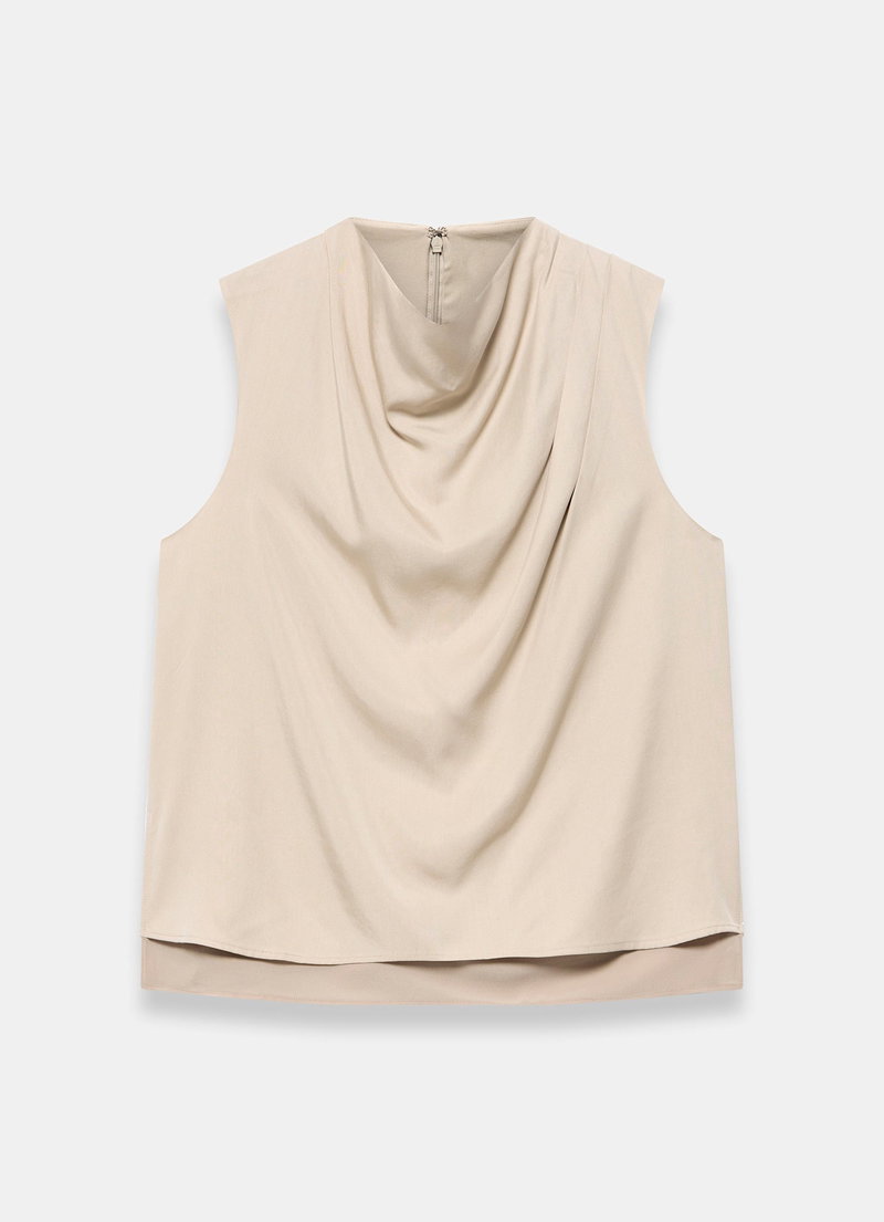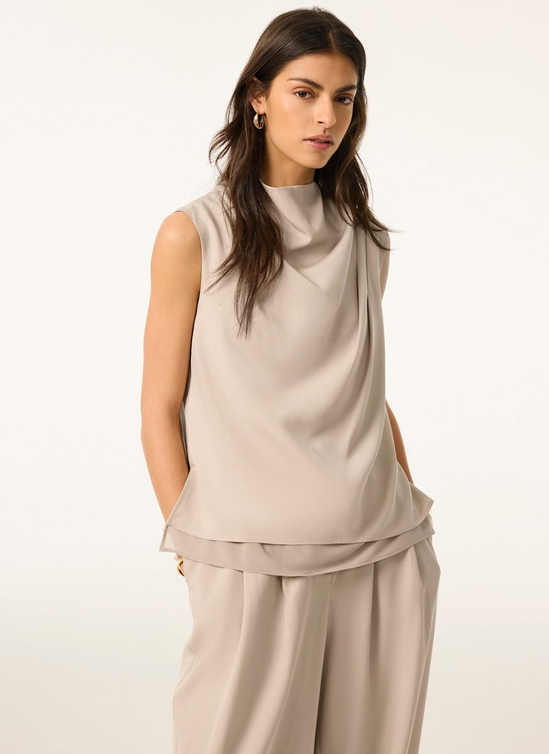 Neutral tone sleeveless top featuring a cowl neckline, layered hemline with a zip fastening through the back.