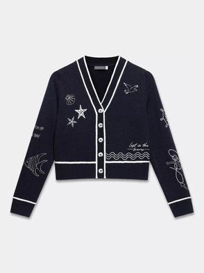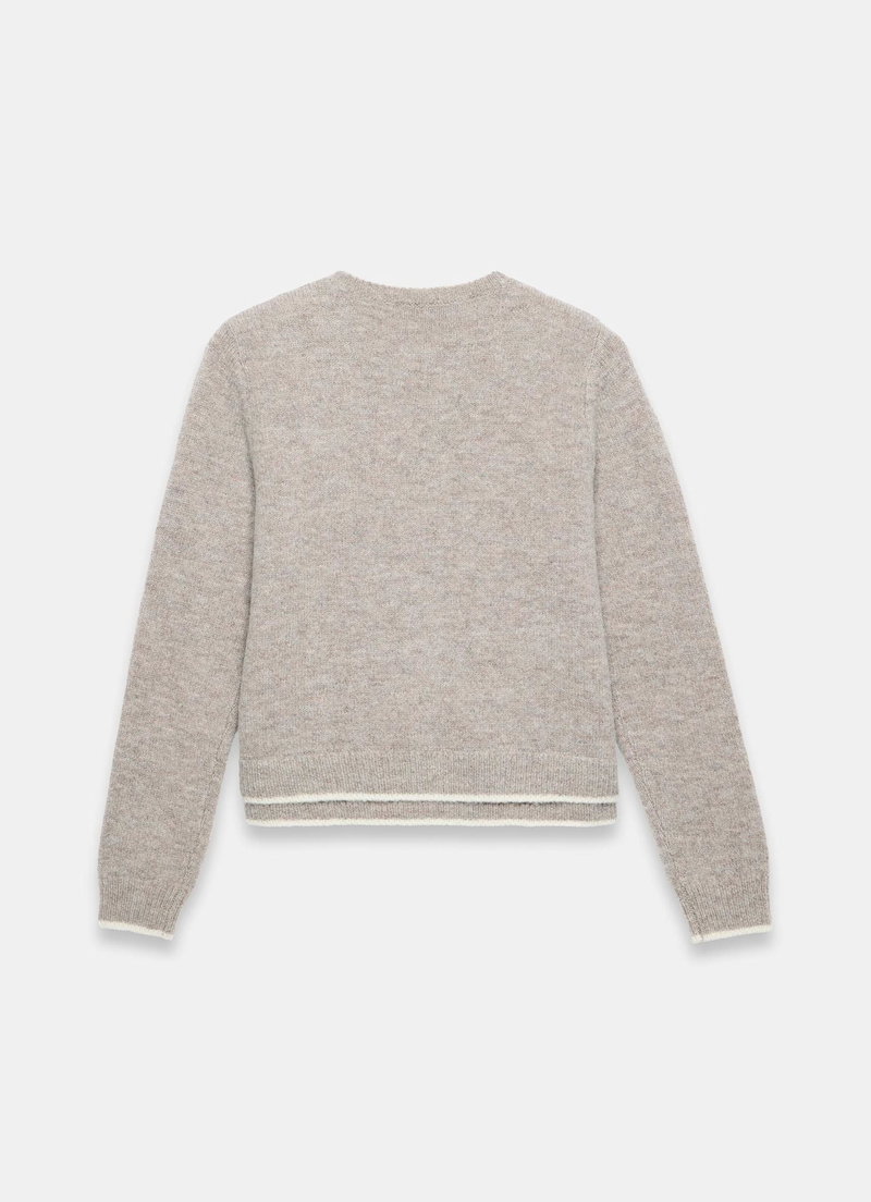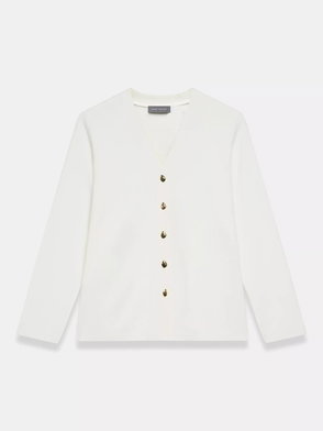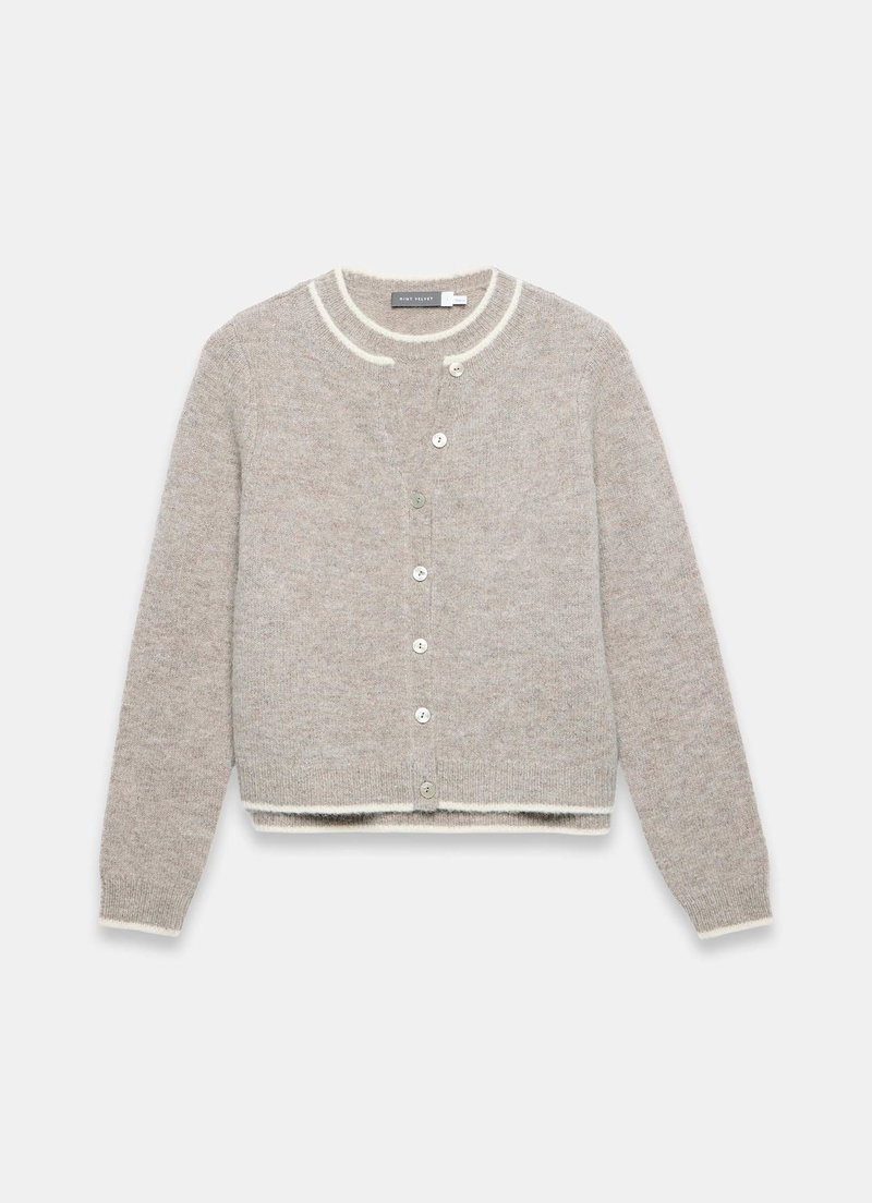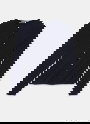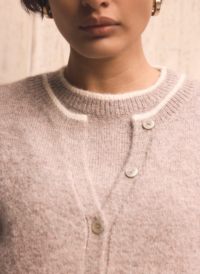 Neutral attached 2-in-1 layered cardigan design featuring a crew neckline, long sleeves, contrast trim, layered hemline with a button fastening through the front.