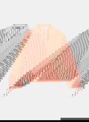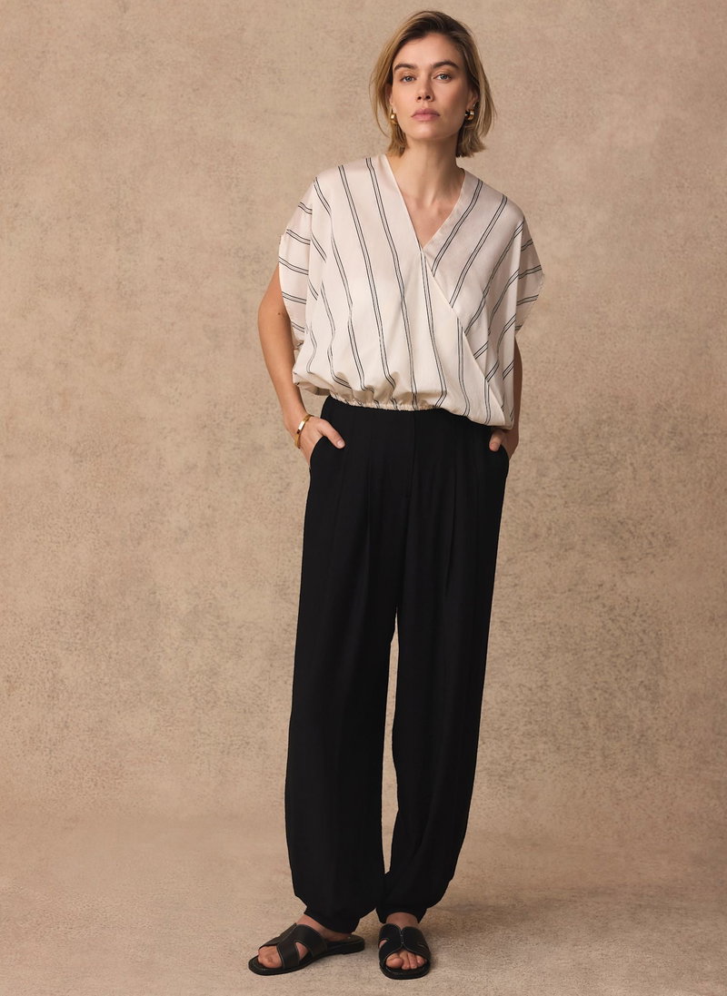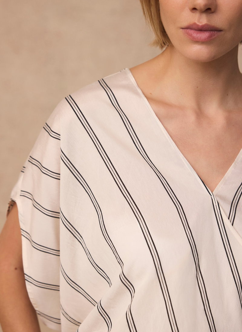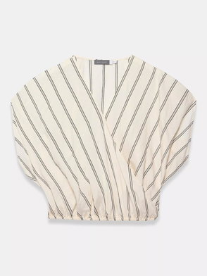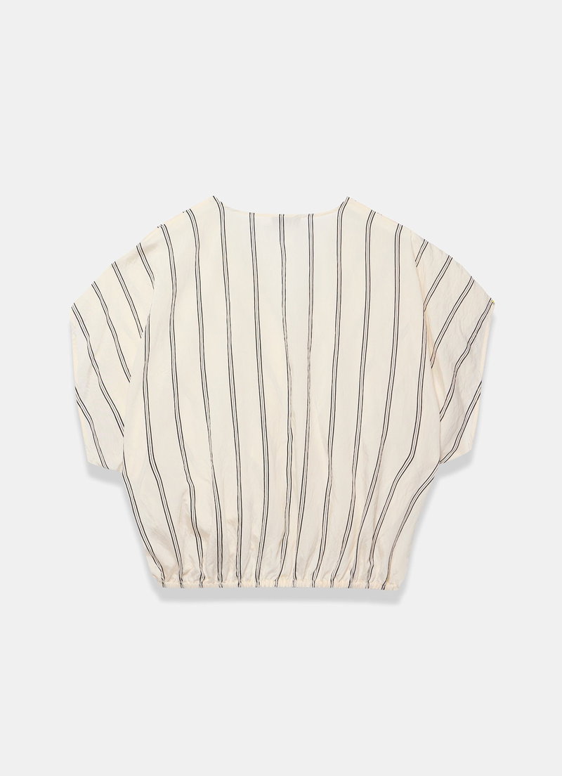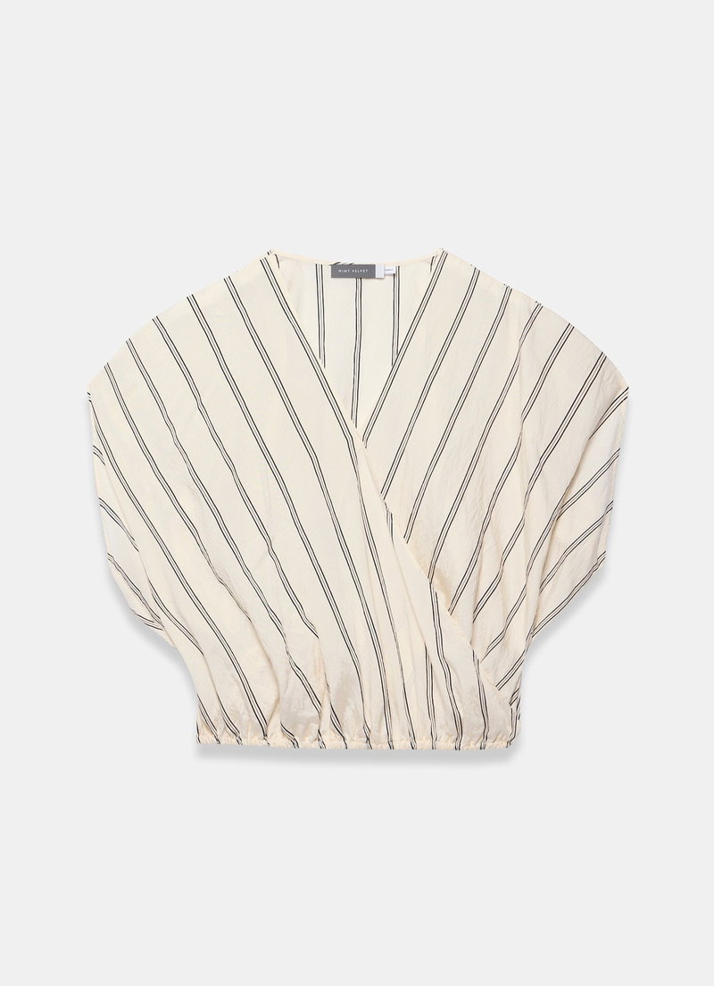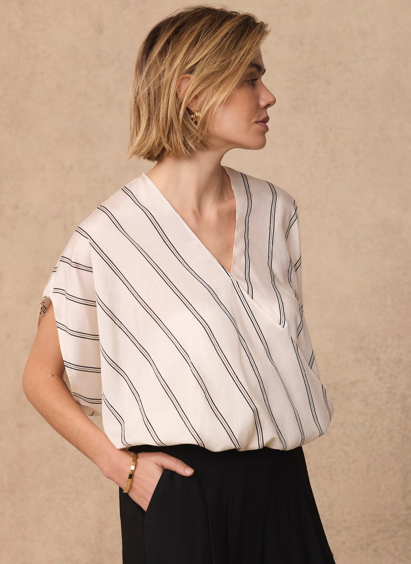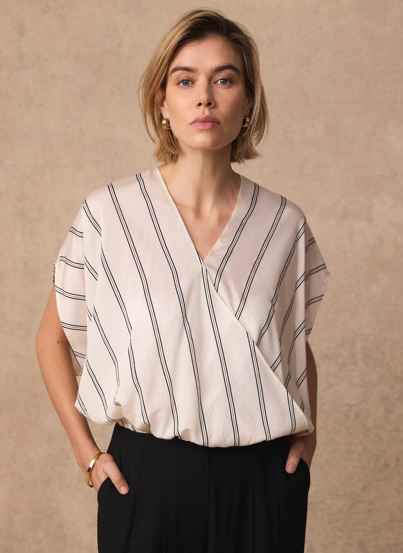 Neutral tone pinstripe blouse featuring a V-neckline, wrap front, short sleeves and elasticated hemline.