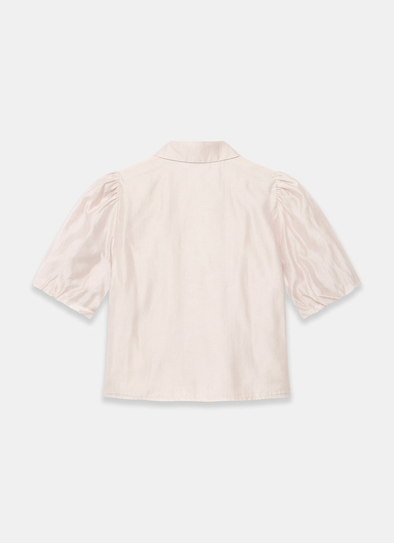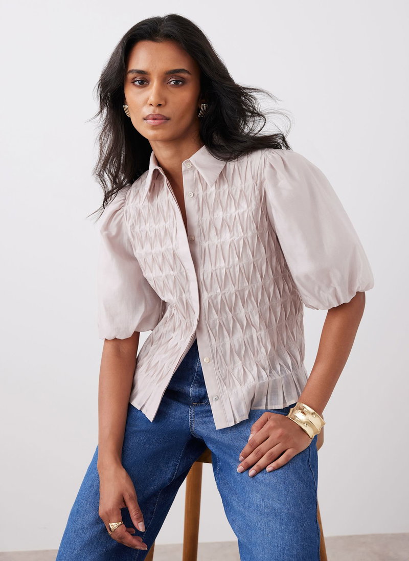 Neutral tone smock shirt with a classic collar, short puff sleeves and a concealed button fastening through the front.