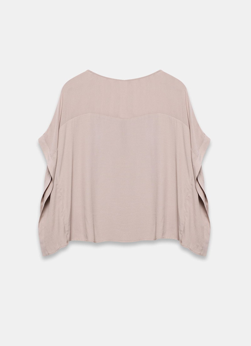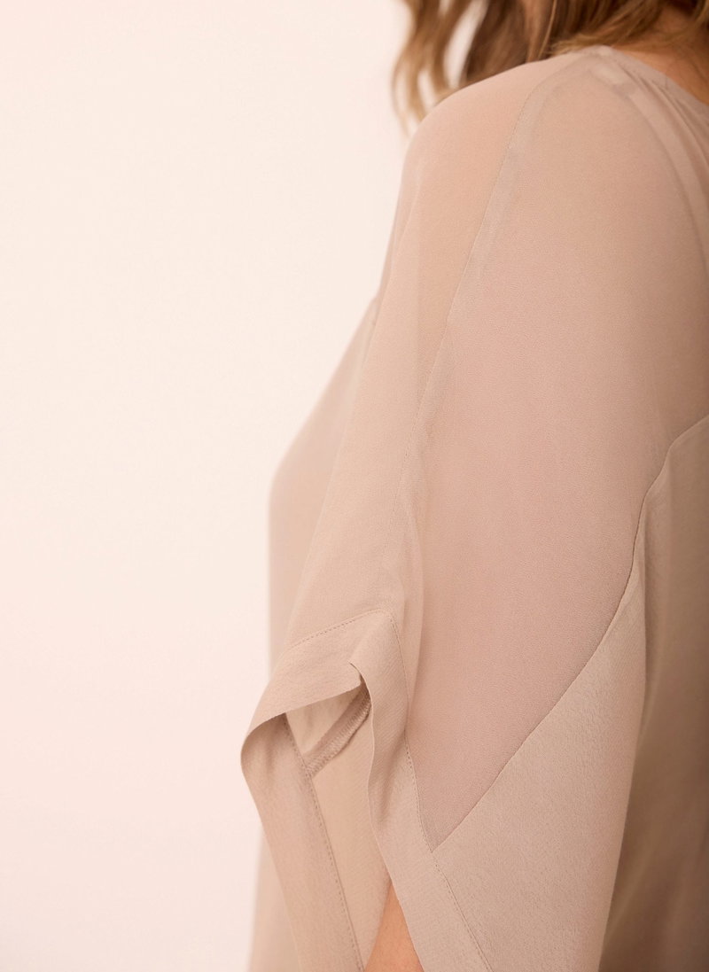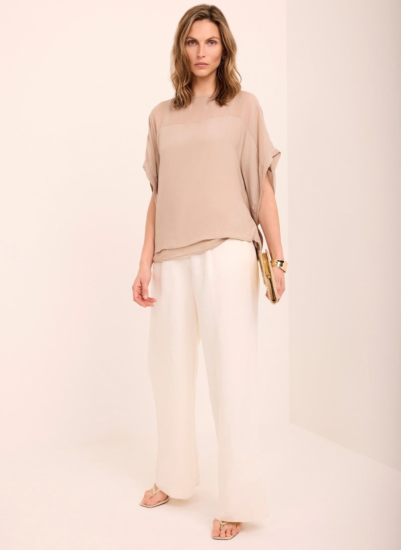 Neutral tone layered top featuring a crew neckline, sheer panel and wide cap sleeves.